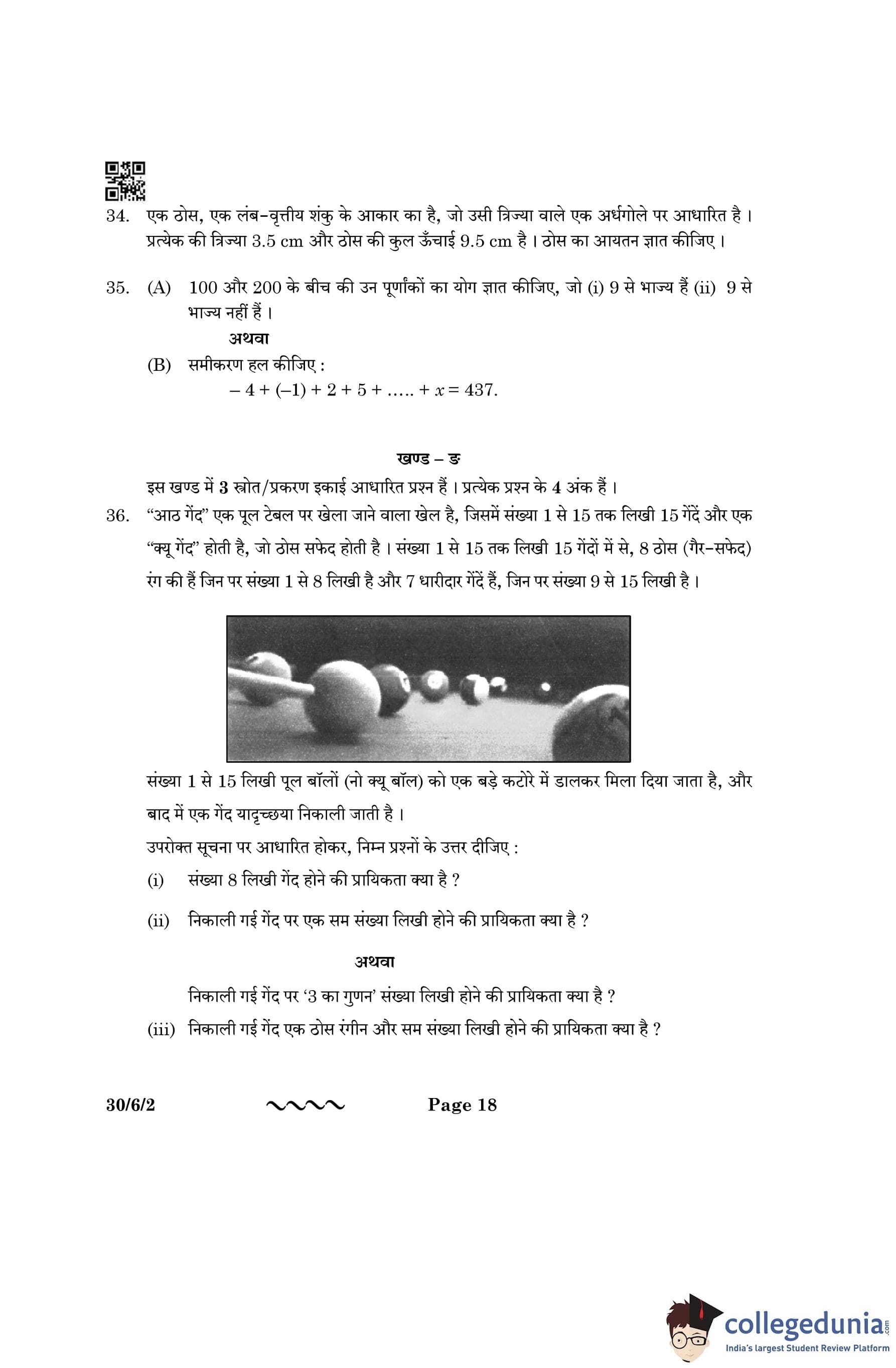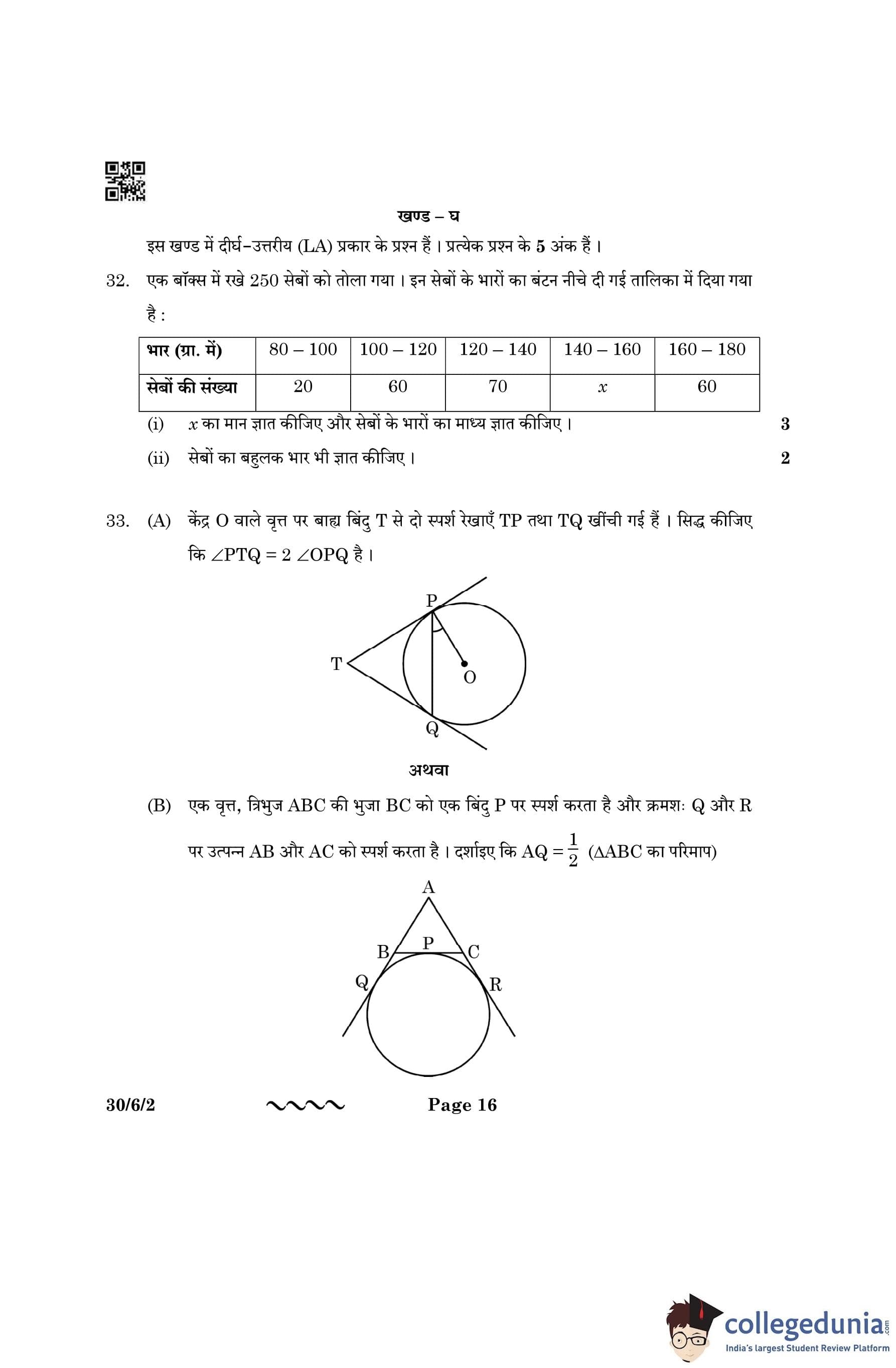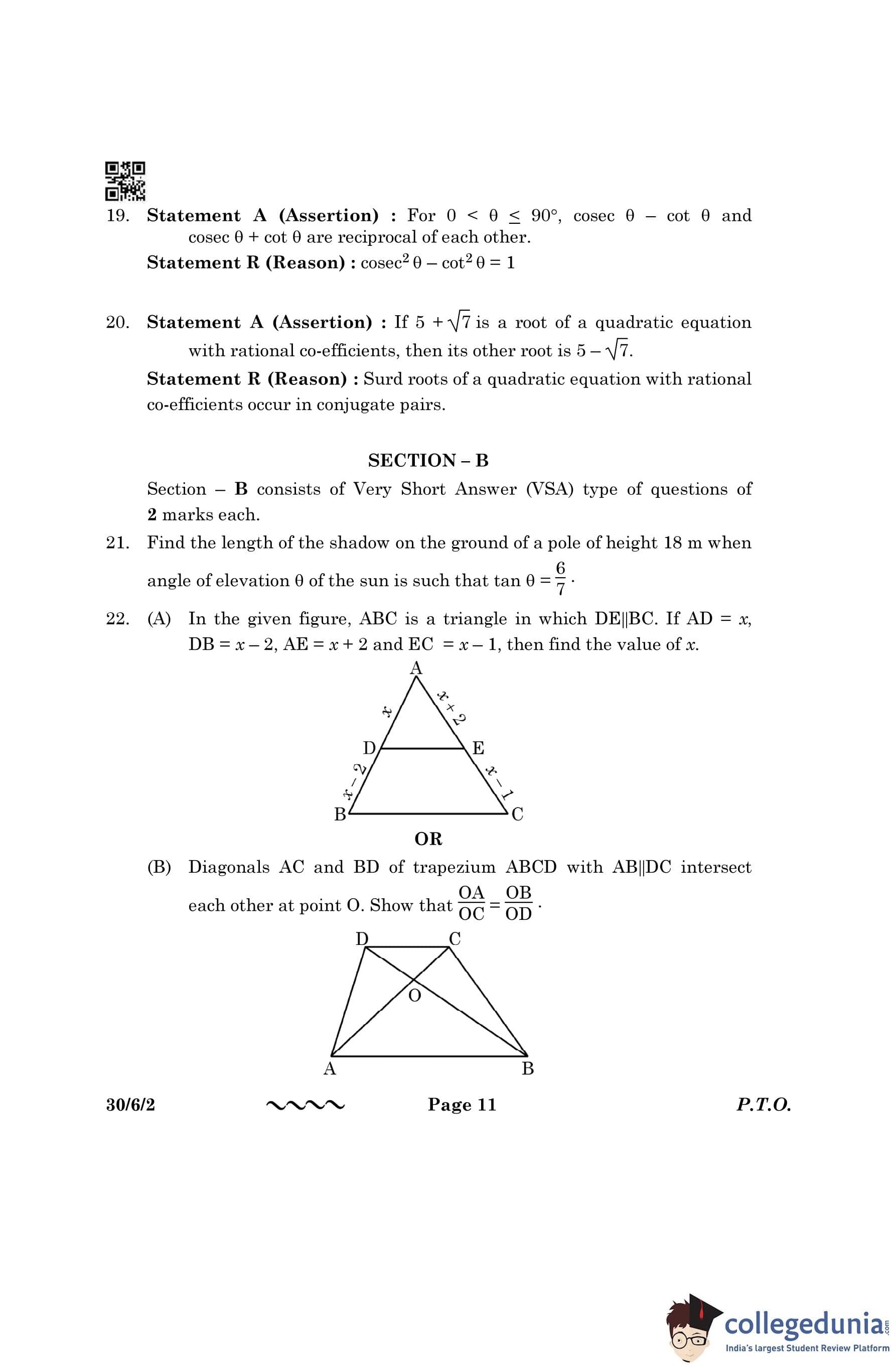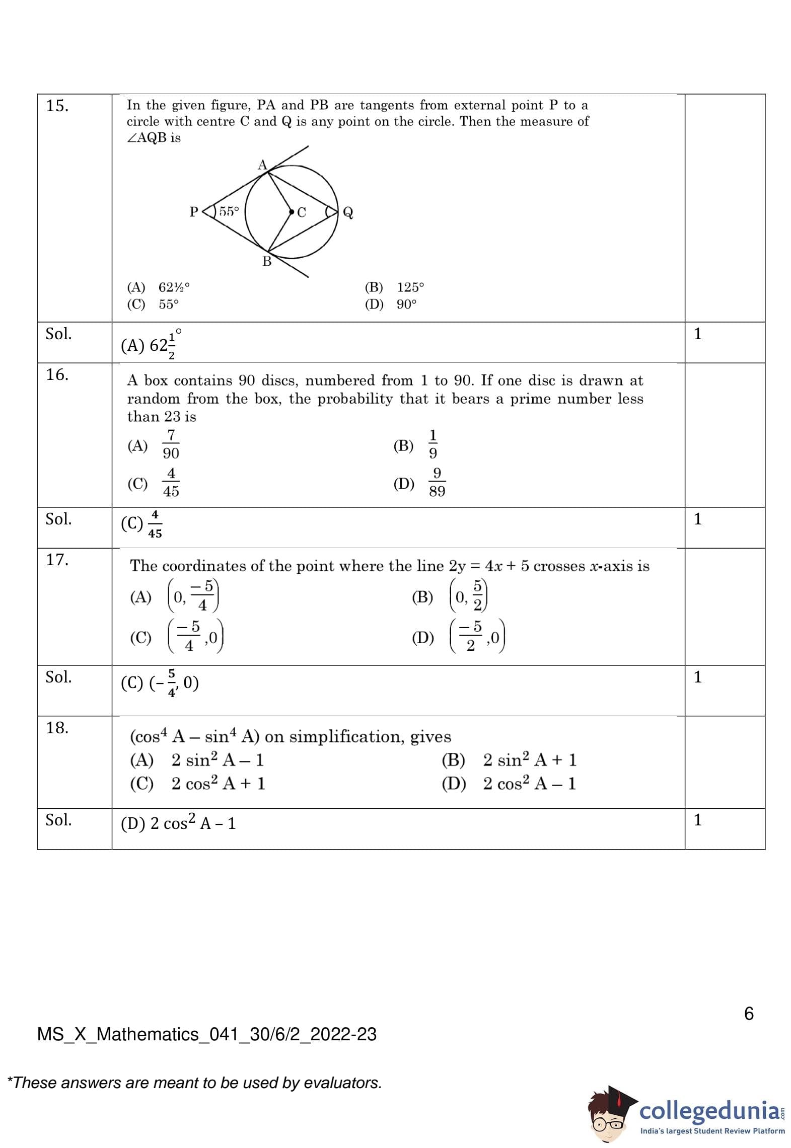 CBSE Class 10 Mathematics Standard (Set 2- 30/6/2) Question Paper 2023 with Answer Key