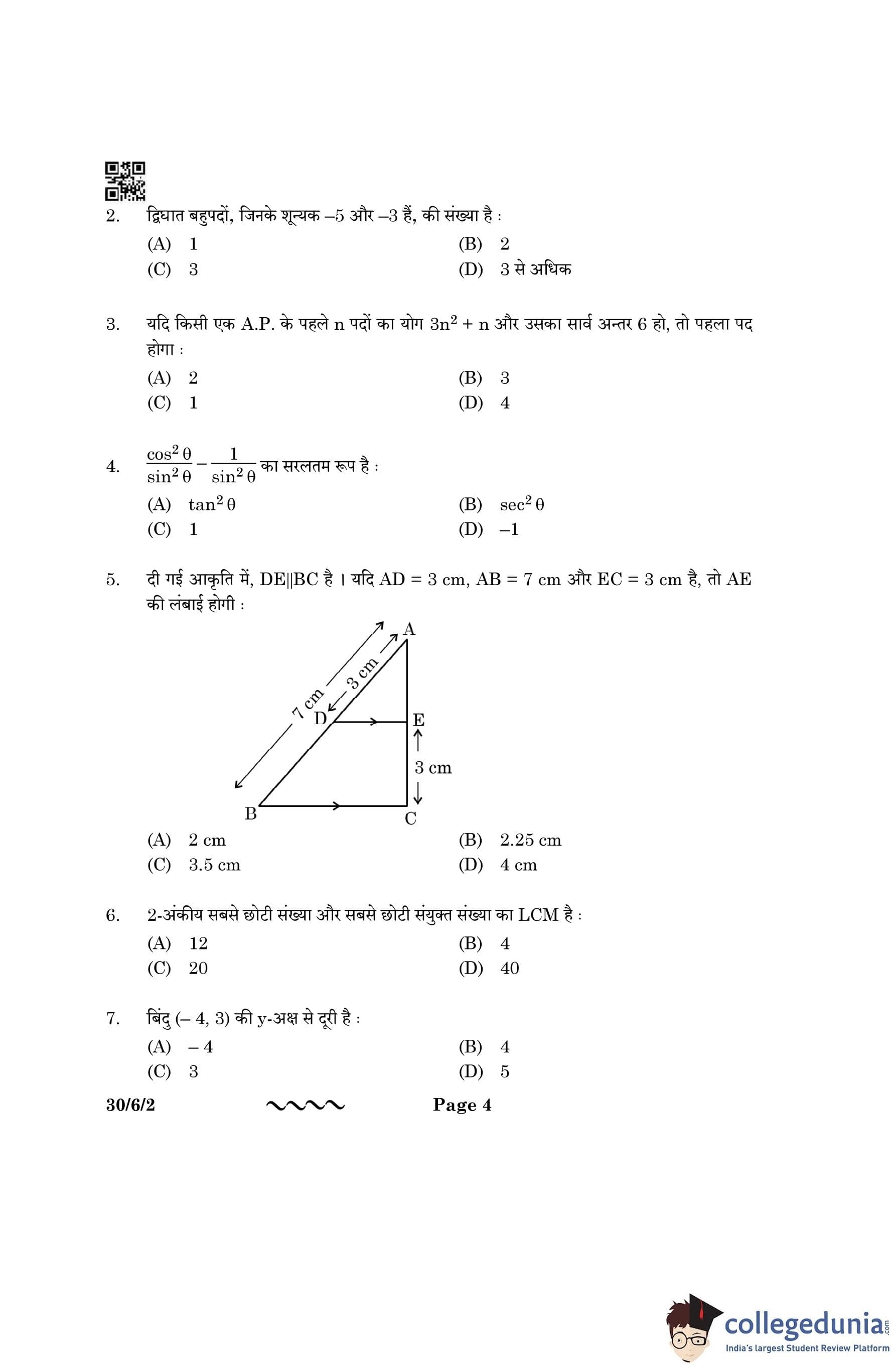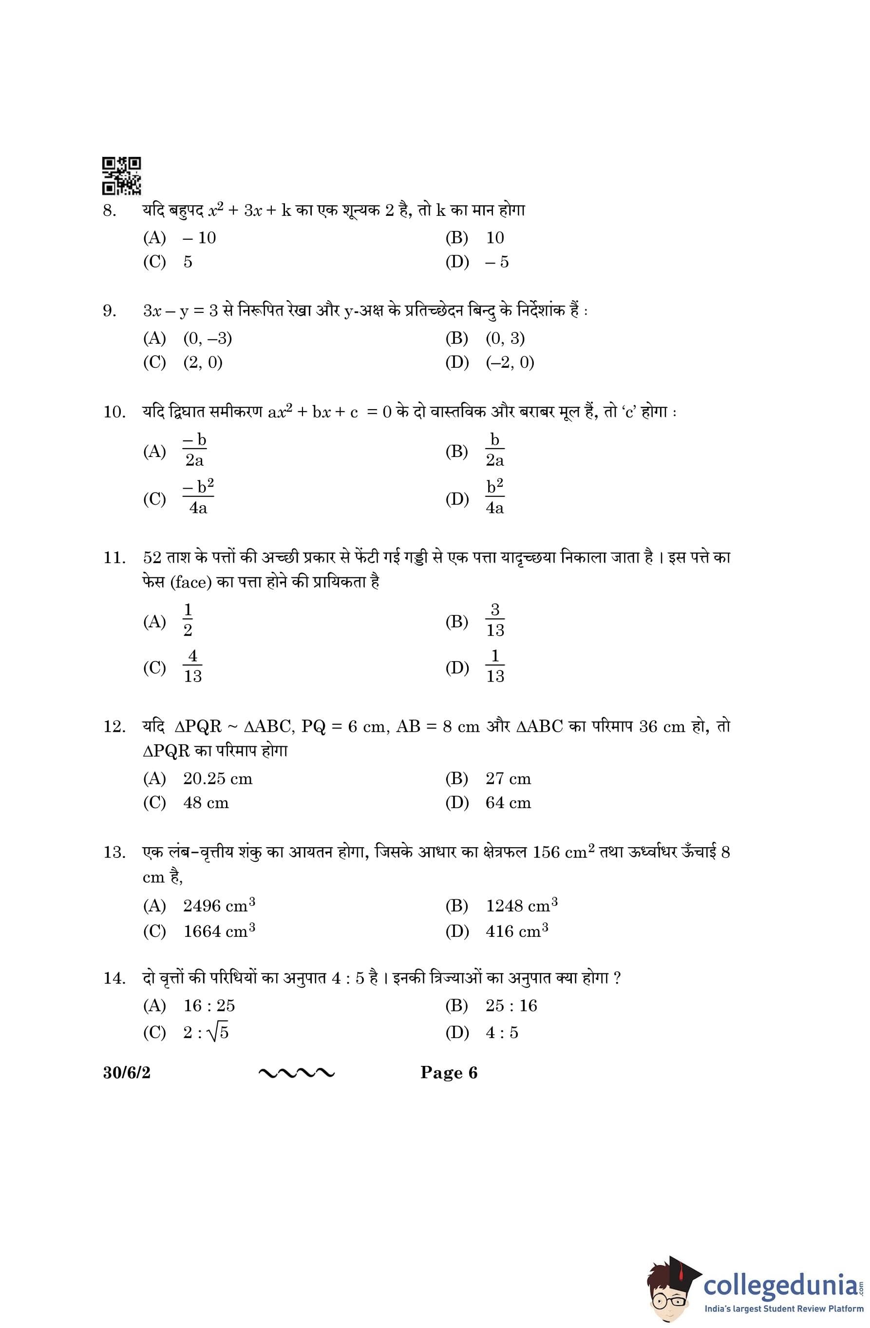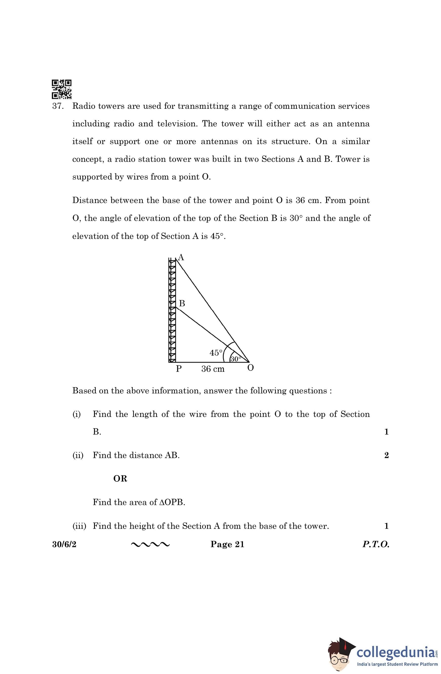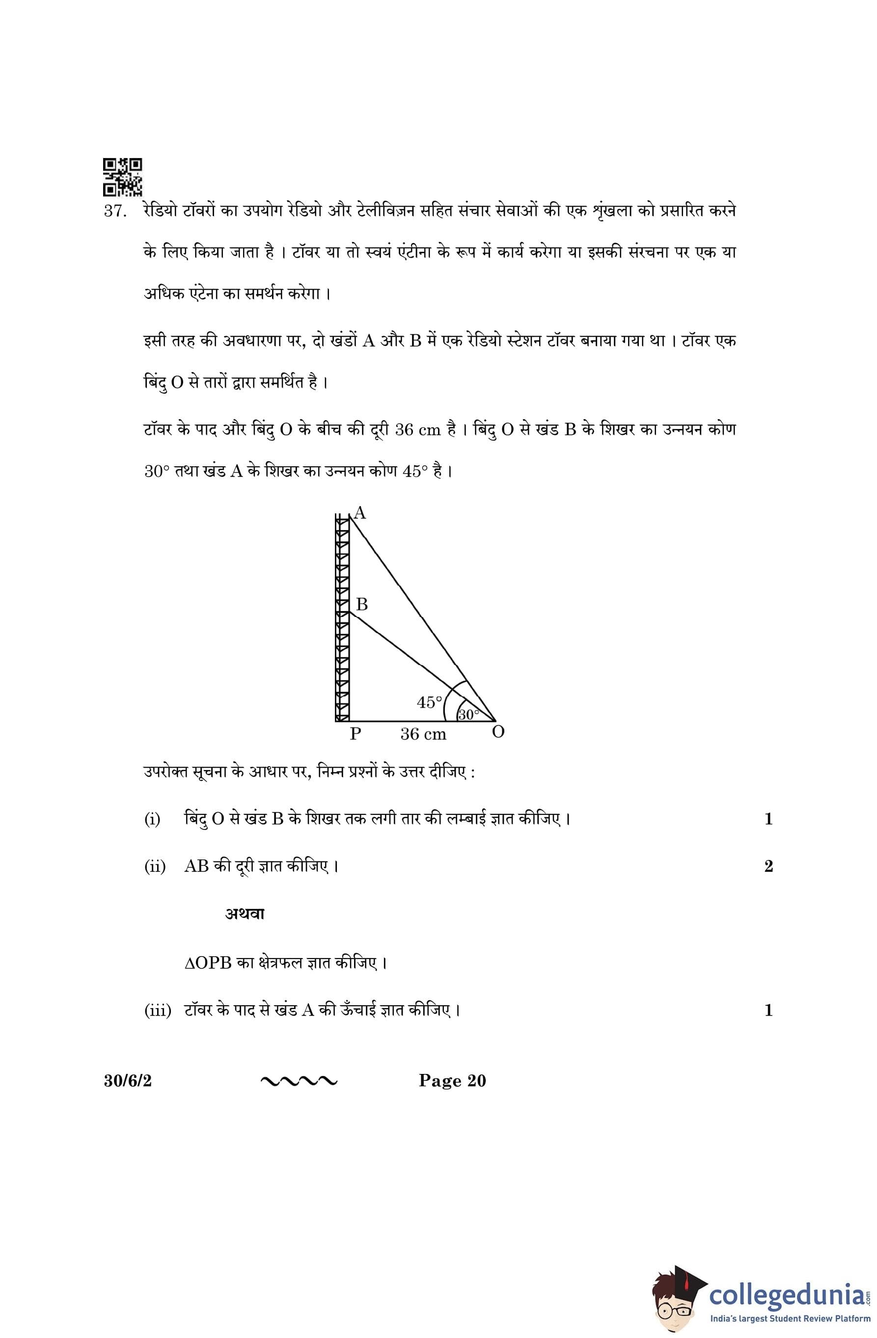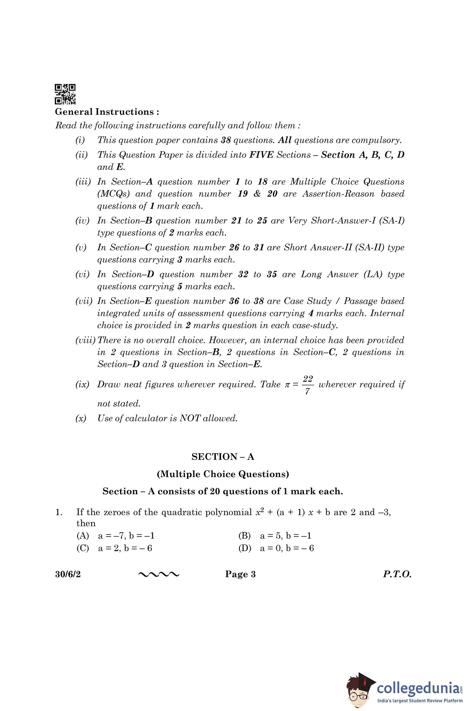 CBSE Class 10 Mathematics Standard Question Paper 2023 with Answer Key (Set 2- 30/6/2) is available for download here. The exam was conducted by the Central Board of Secondary Education on March 21, 2023 in the Morning Session 10:30 AM to 1:30 PM. The medium of paper was English & Hindi. According to initial student reaction, the CBSE Class 10 Mathematics Standard paper was rated as Moderate in difficulty level. The question paper comprised a total of 38 questions divided among 5 sections.