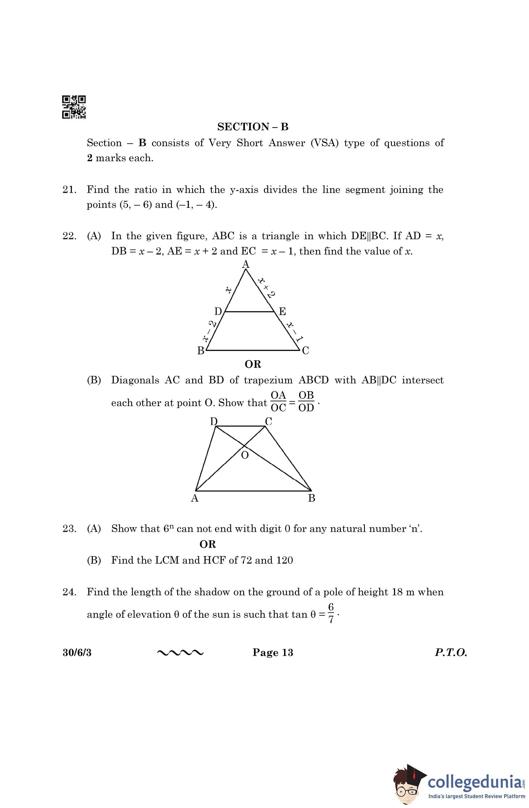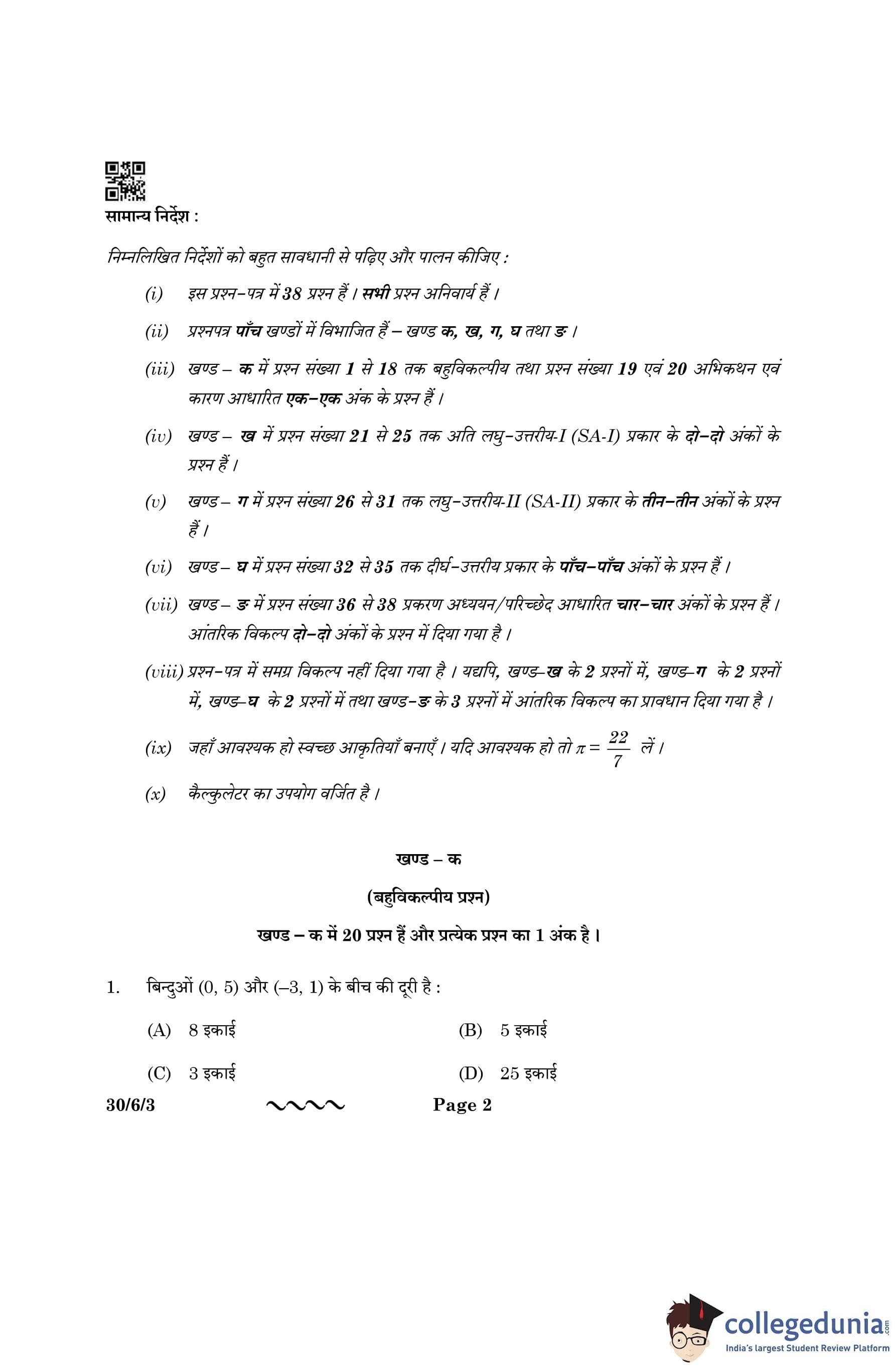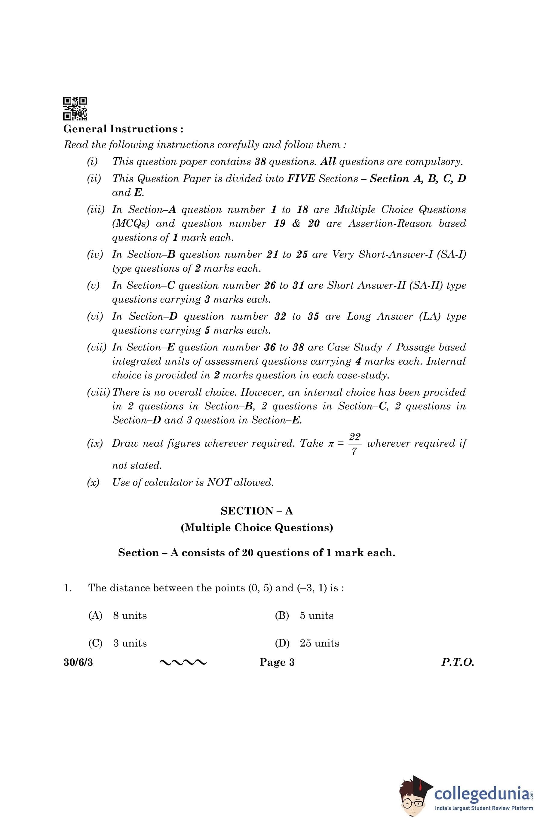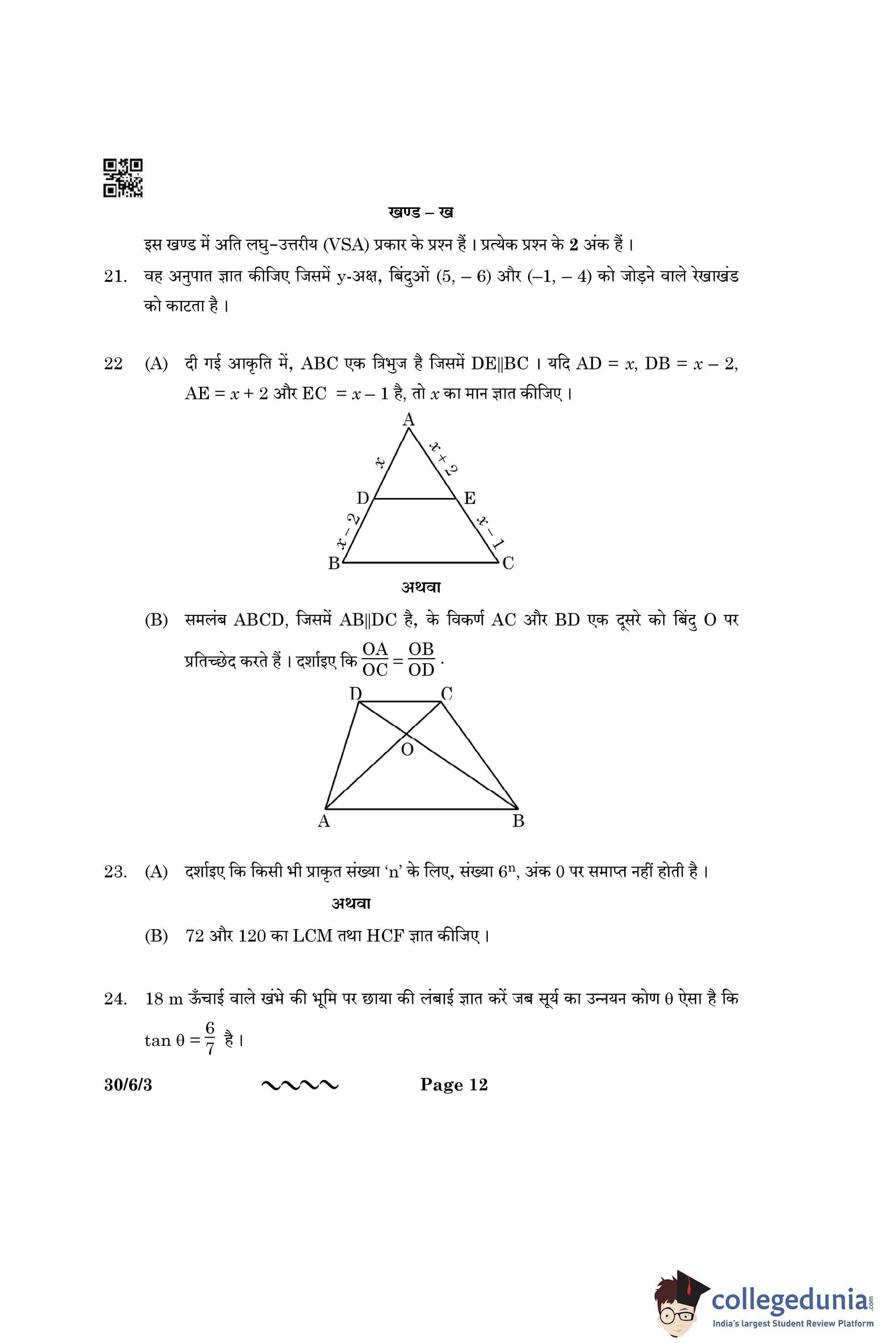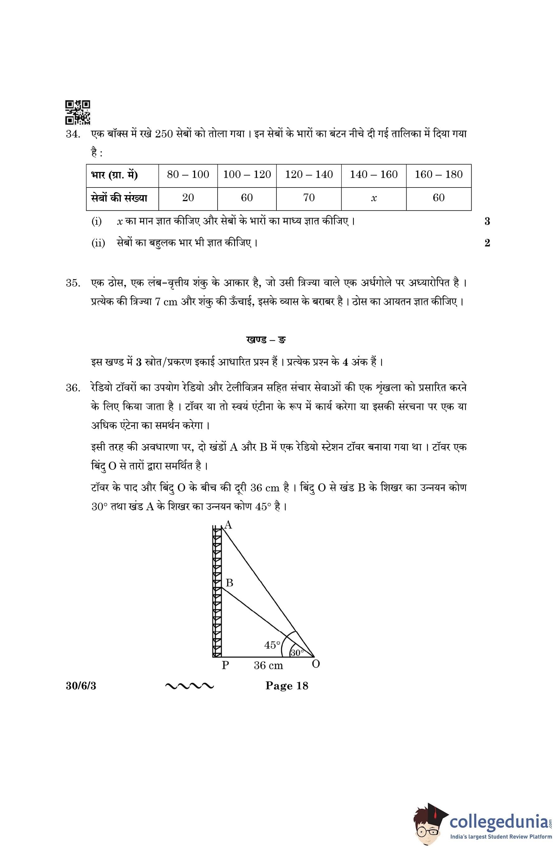 CBSE Class 10 Mathematics Standard Question Paper 2023 with Answer Key (Set 3- 30/6/3) is available for download here. The exam was conducted by the Central Board of Secondary Education on March 21, 2023 in the Morning Session 10:30 AM to 1:30 PM. The medium of paper was English & Hindi. According to initial student reaction, the CBSE Class 10 Mathematics Standard paper was rated as Moderate in difficulty level. The question paper comprised a total of 38 questions divided among 5 sections.