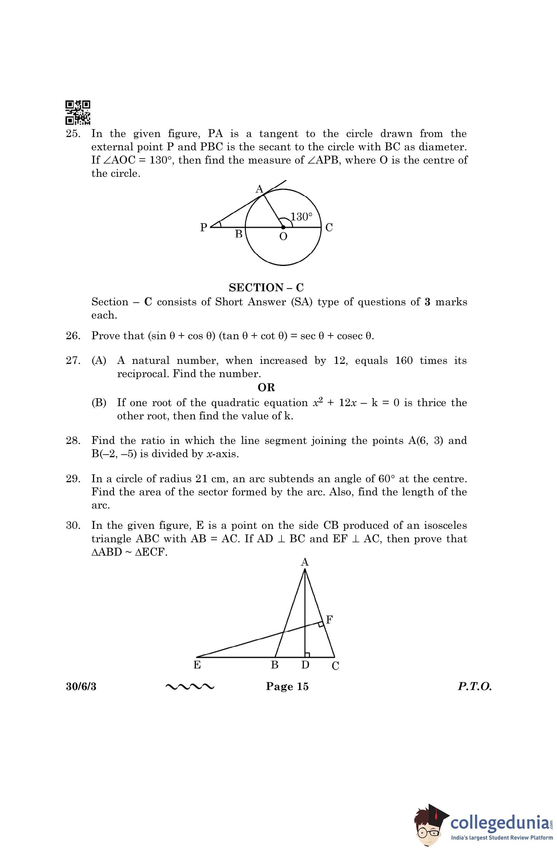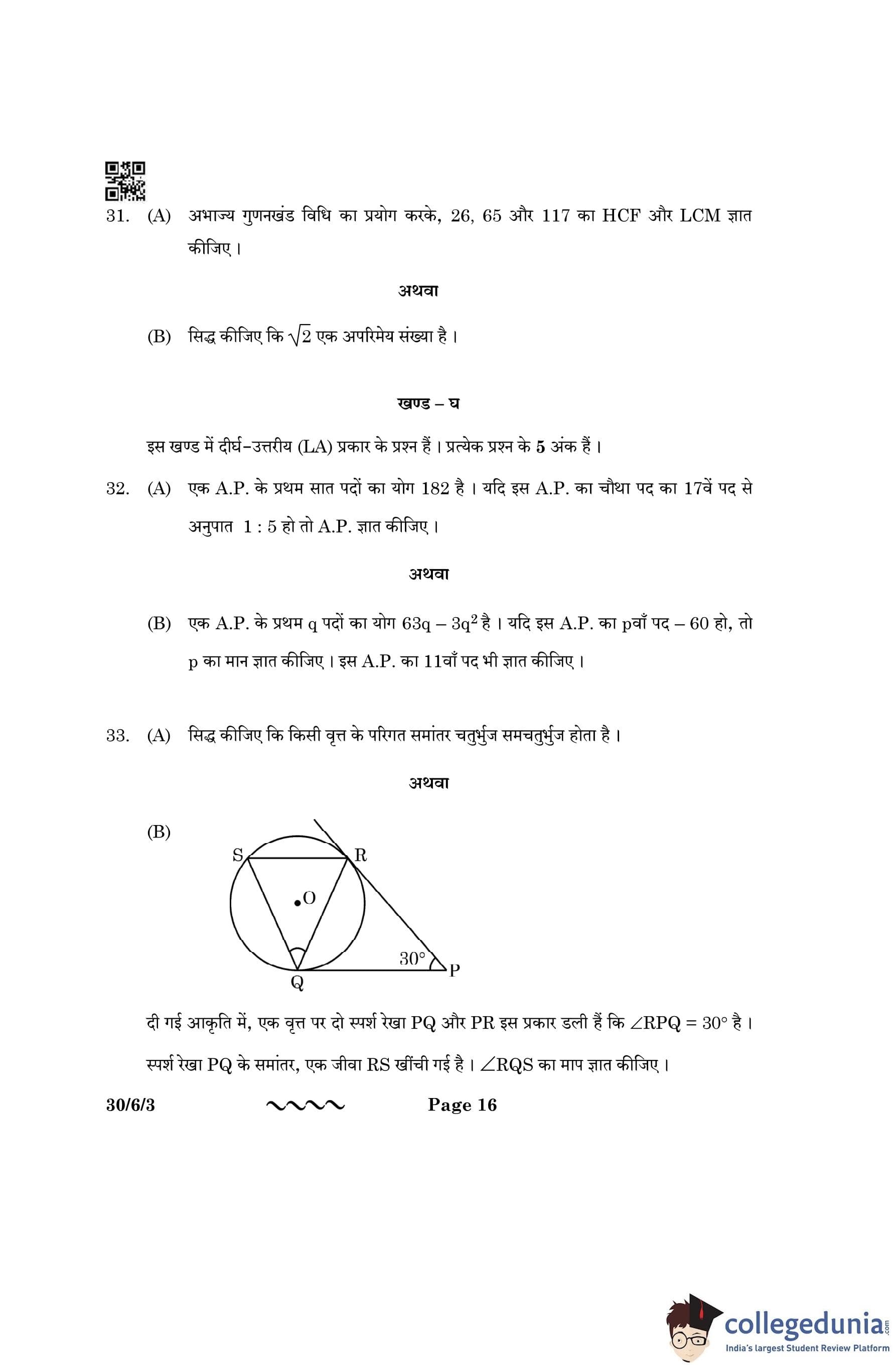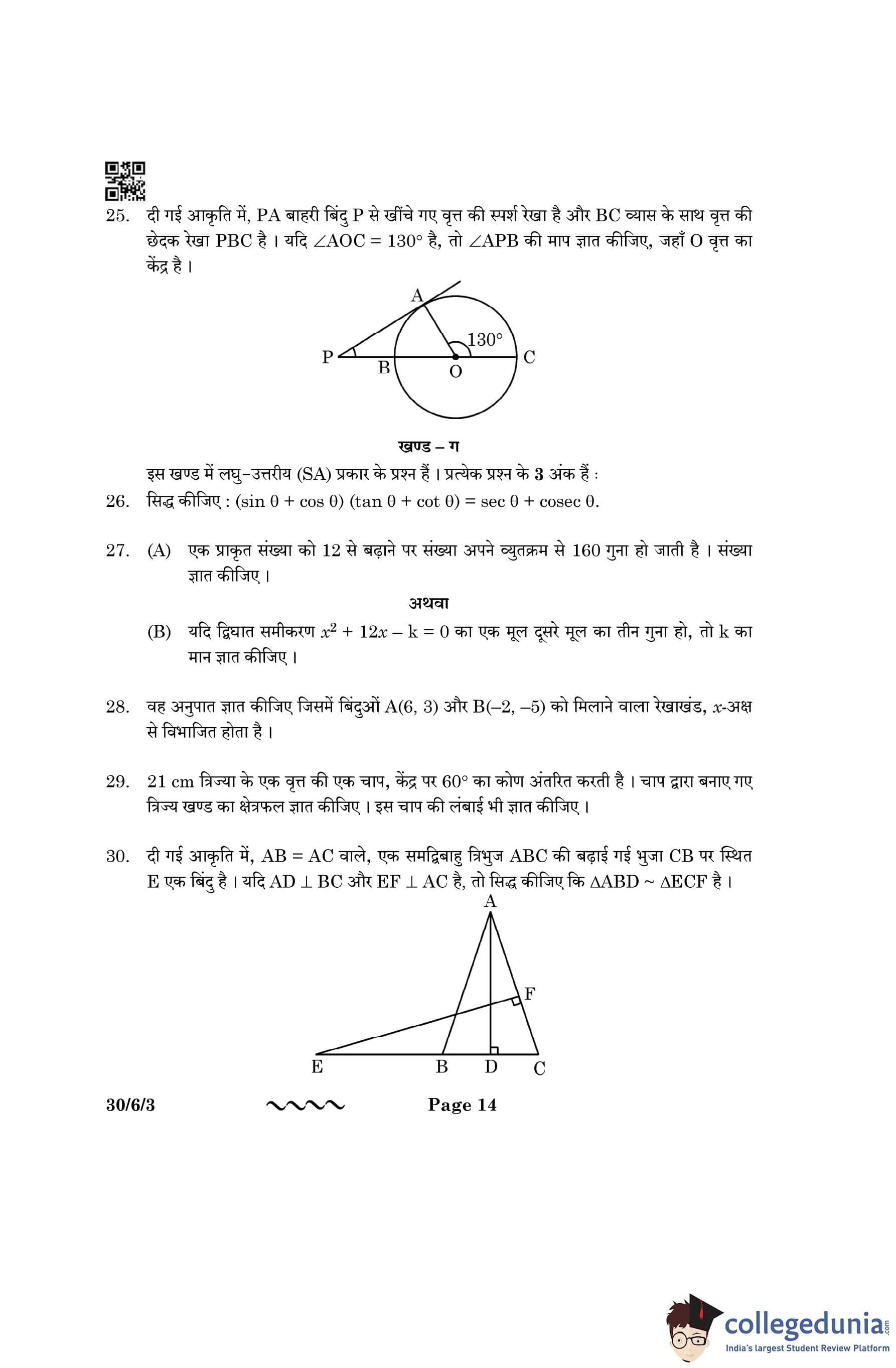 CBSE Class 10 Mathematics Standard (Set 3- 30/6/3) Question Paper 2023 with Answer Key