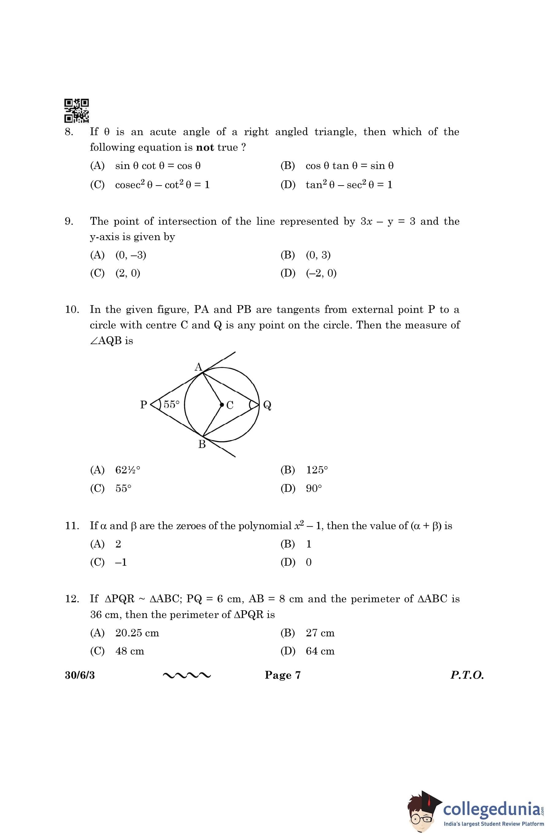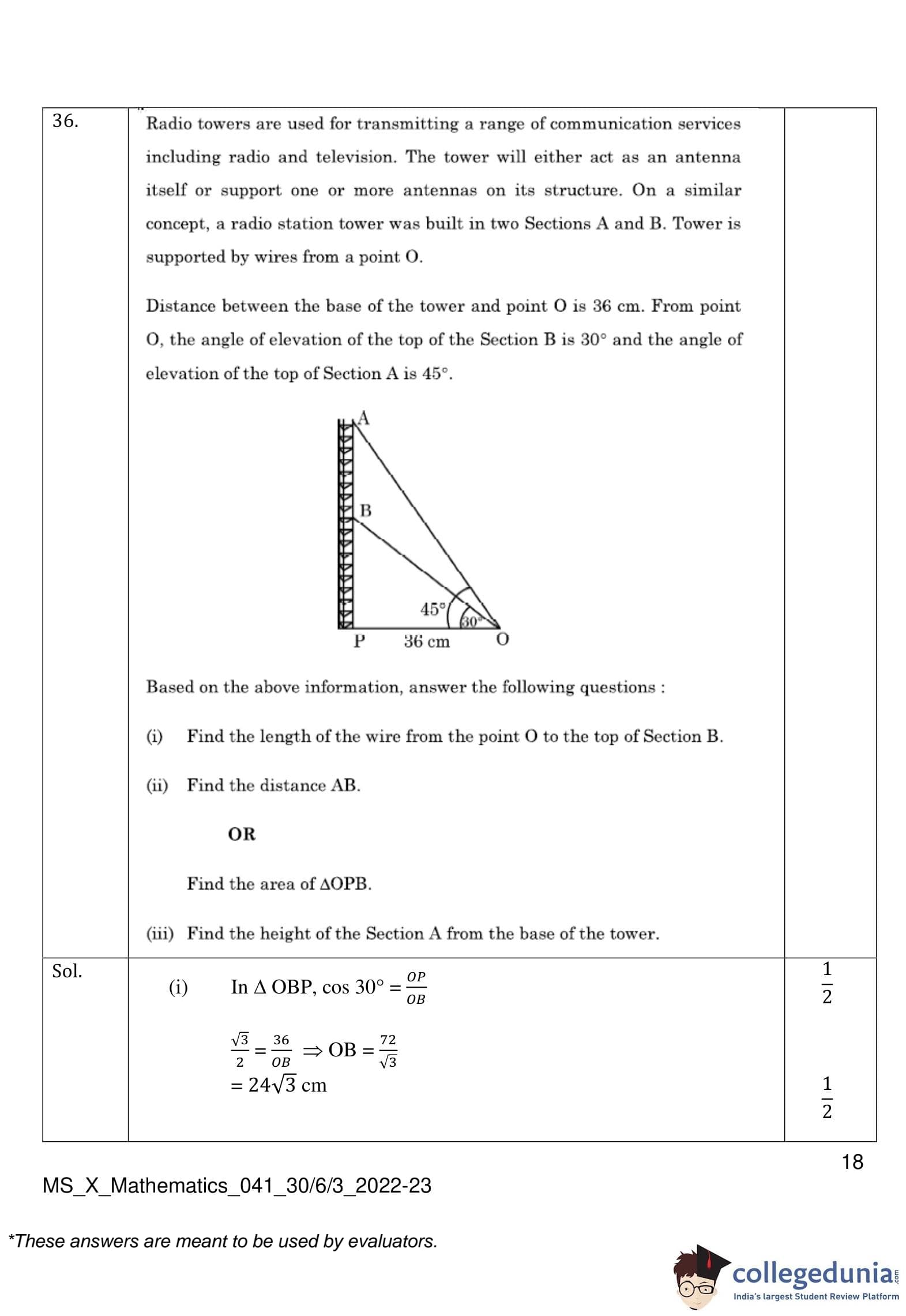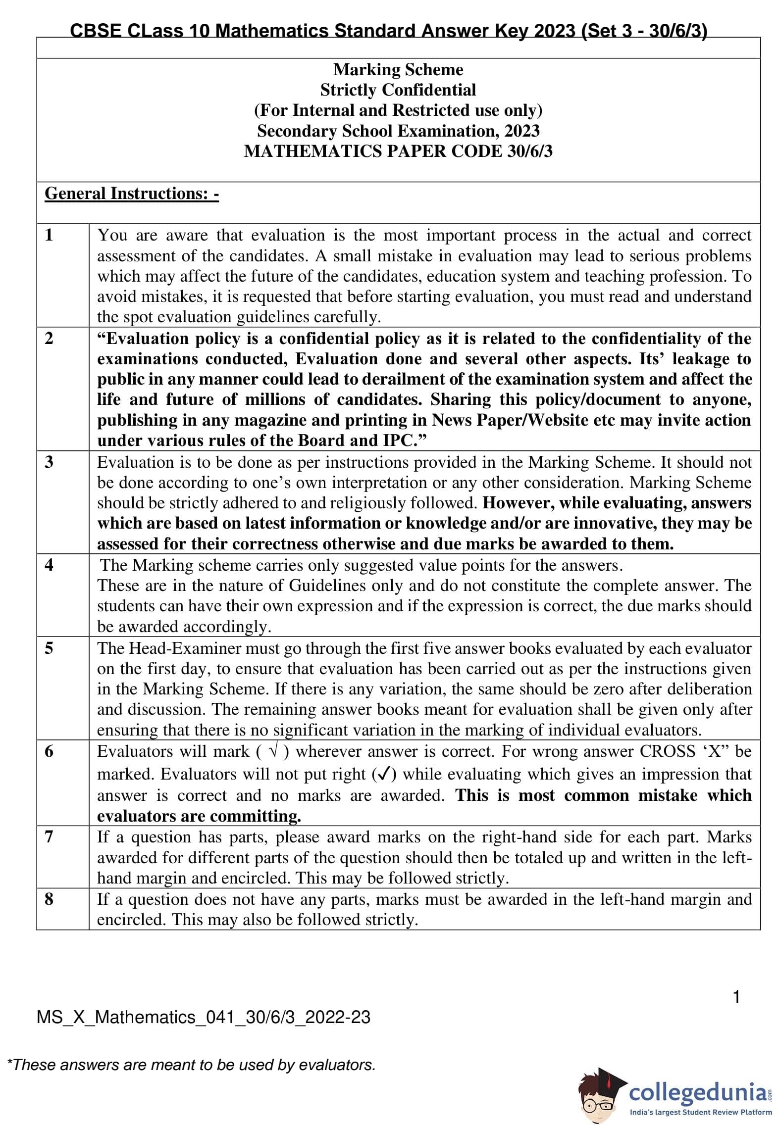 CBSE Class 10 Mathematics Standard (Set 3- 30/6/3) Question Paper 2023 with Answer Key