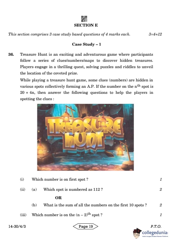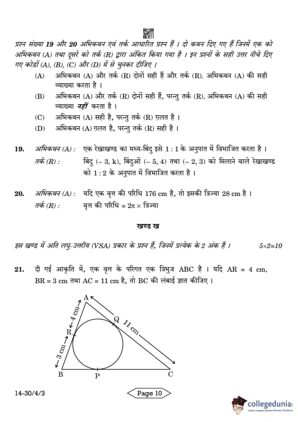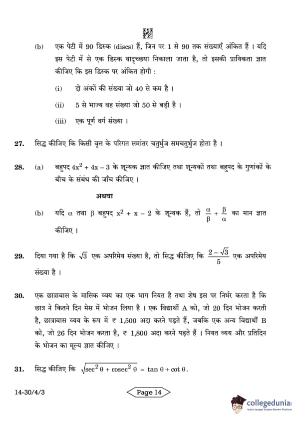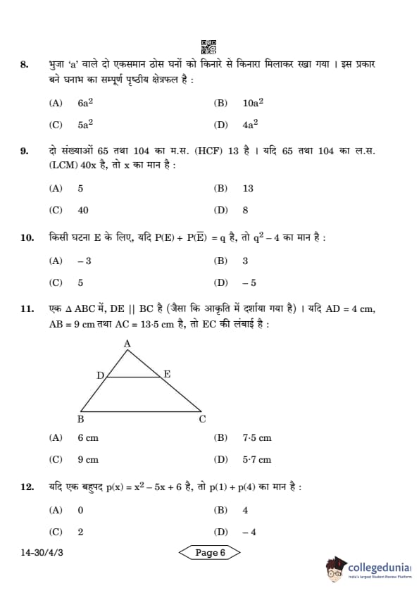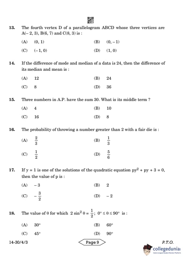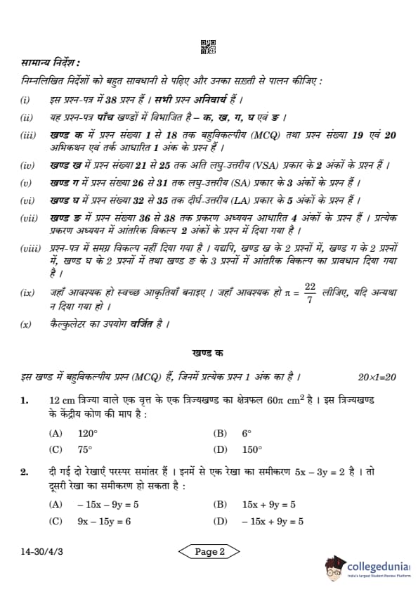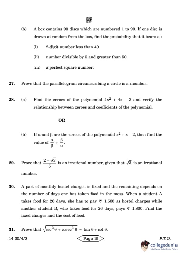 CBSE Class 10 Mathematics Standard Question Paper 2024 PDF (Set 3- 30/4/3) is available for download here. CBSE conducted the Mathematics Standard exam on March 11, 2024 from 10:30 AM to 1:30 PM. The total marks for the theory paper are 80. The question paper contains 20% MCQ-based questions, 40% competency-based questions, and 40% short and long answer type questions.