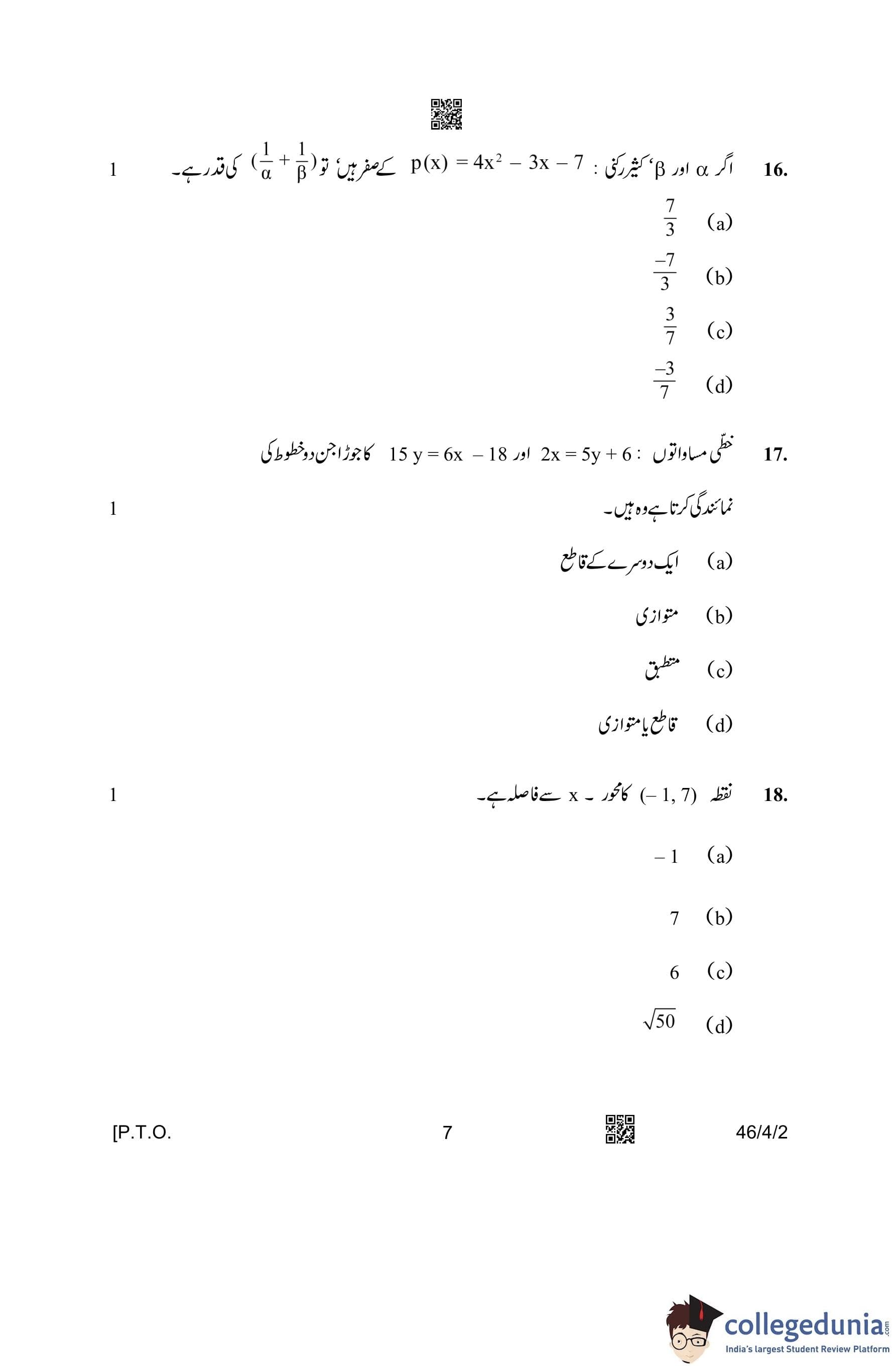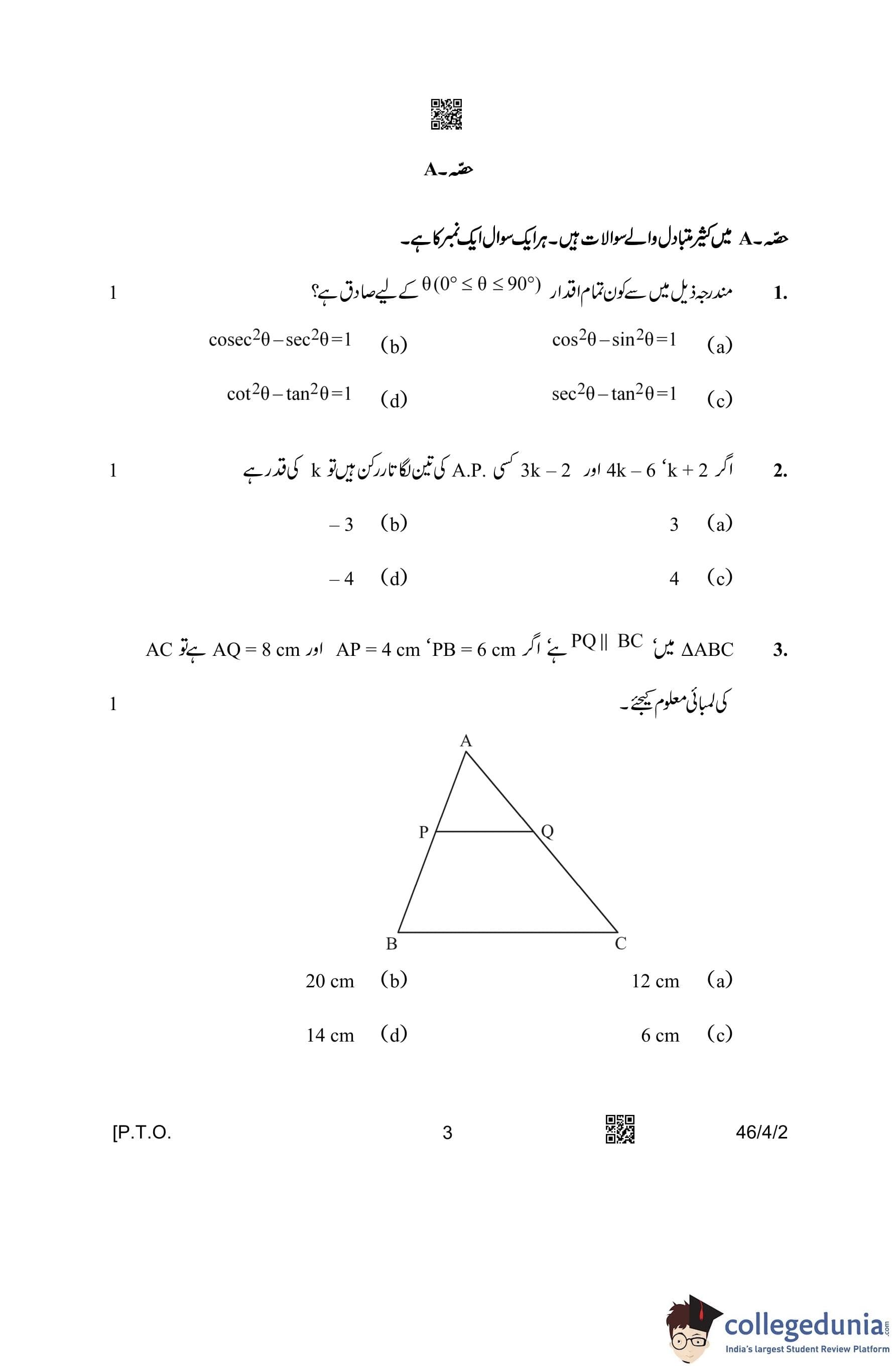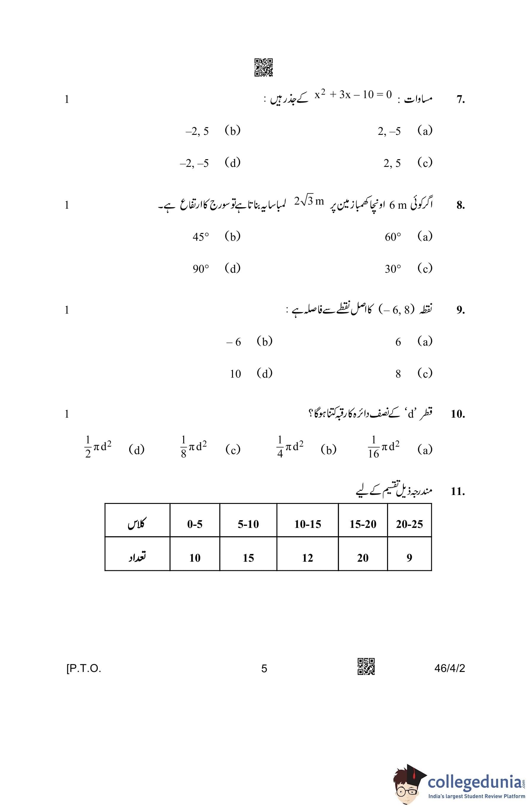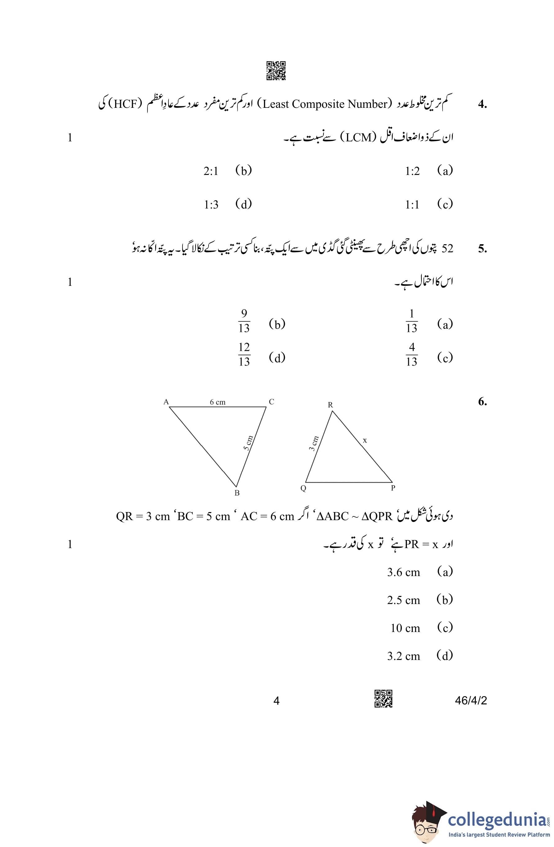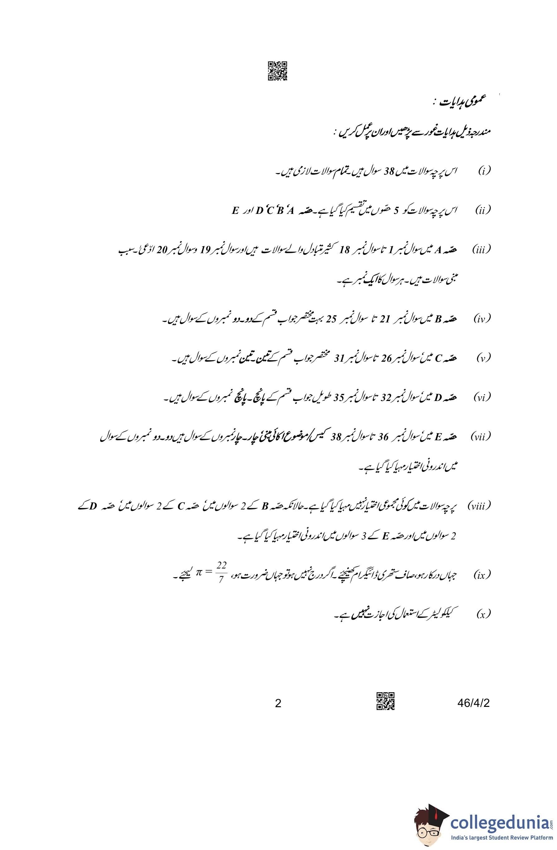 CBSE Class 10 Mathematics Standard (Set 2- 46/4/2) Urdu Question Paper 2023 with Answer Key