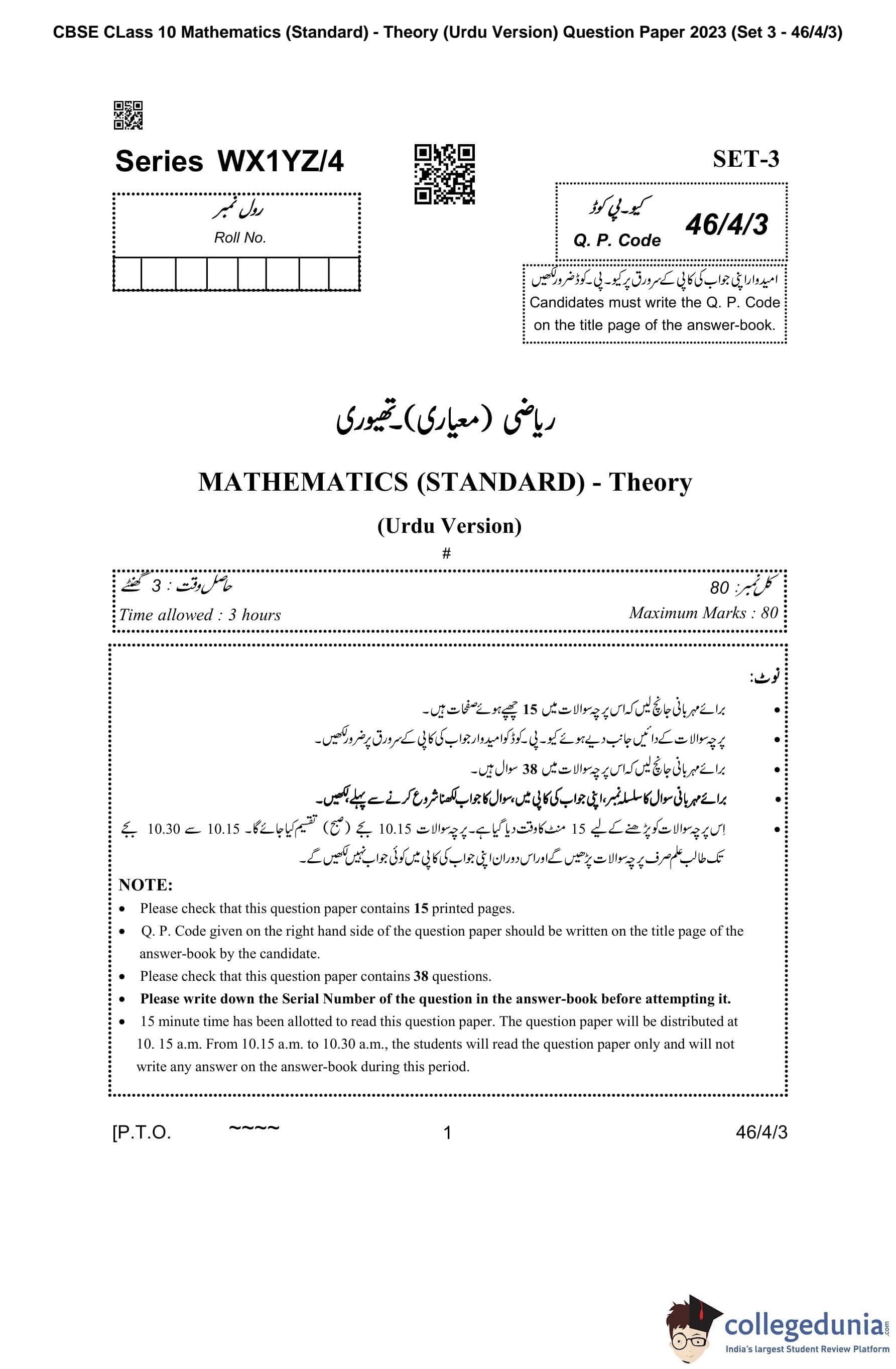 CBSE Class 10 Mathematics Standard Question Paper 2023 with Answer Key (Set 3- 46/4/3) is available for download here. The exam was conducted by the Central Board of Secondary Education on March 21, 2023 in the Morning Session 10:30 AM to 1:30 PM. The medium of paper was Urdu. According to initial student reaction, the CBSE Class 10 Mathematics Standard paper was rated as Moderate in difficulty level. The question paper comprised a total of 38 questions divided among 5 sections.