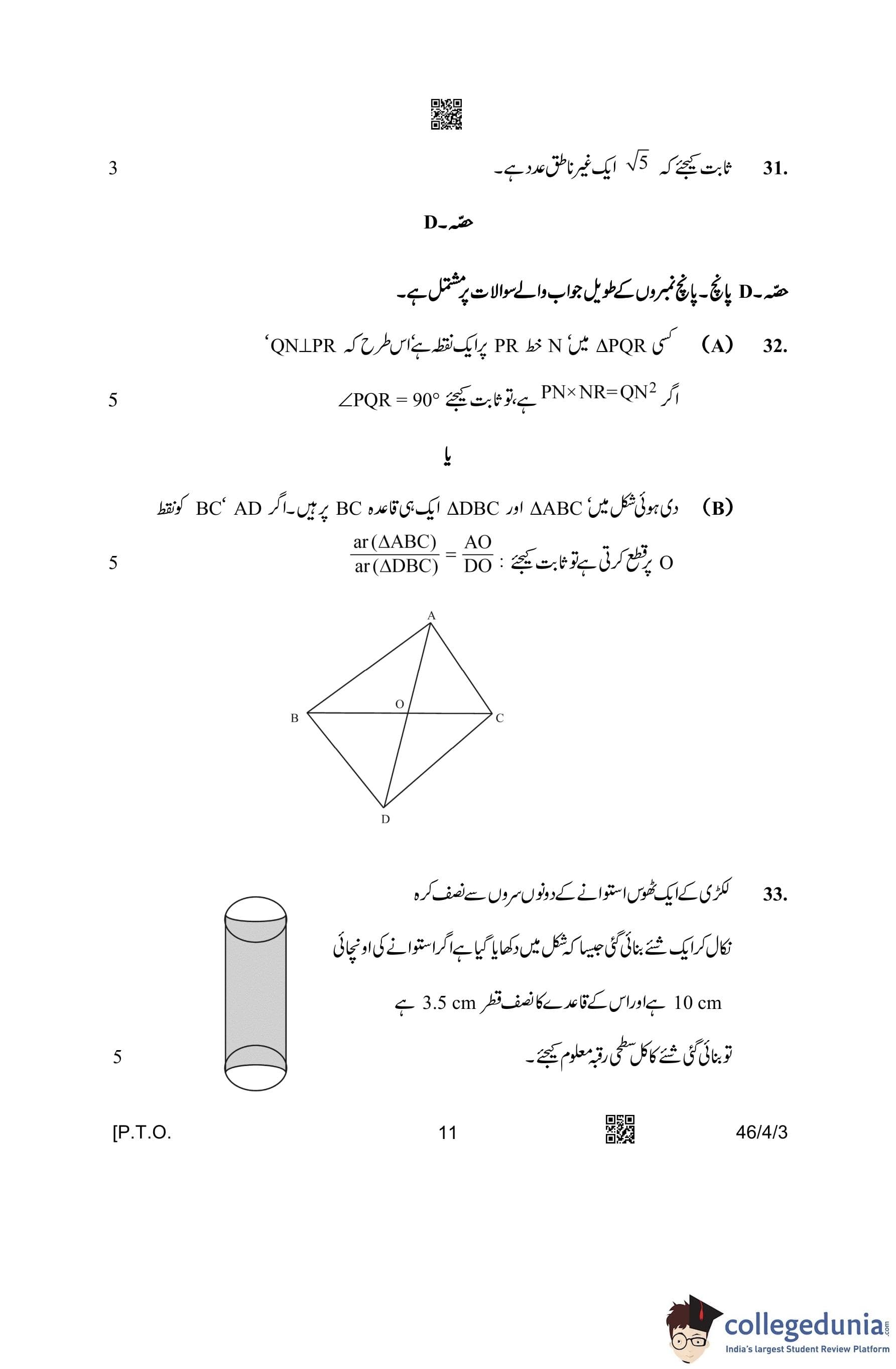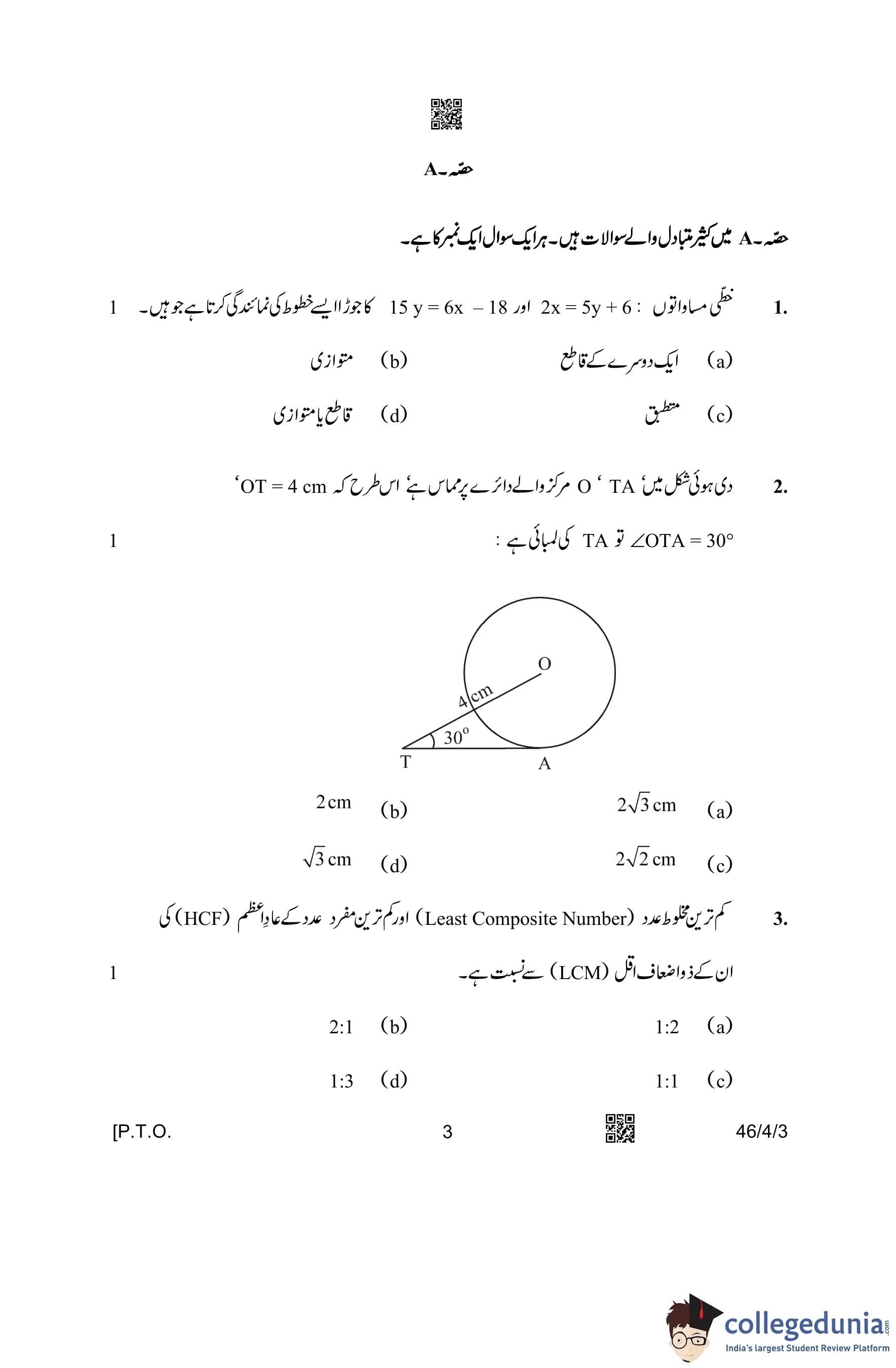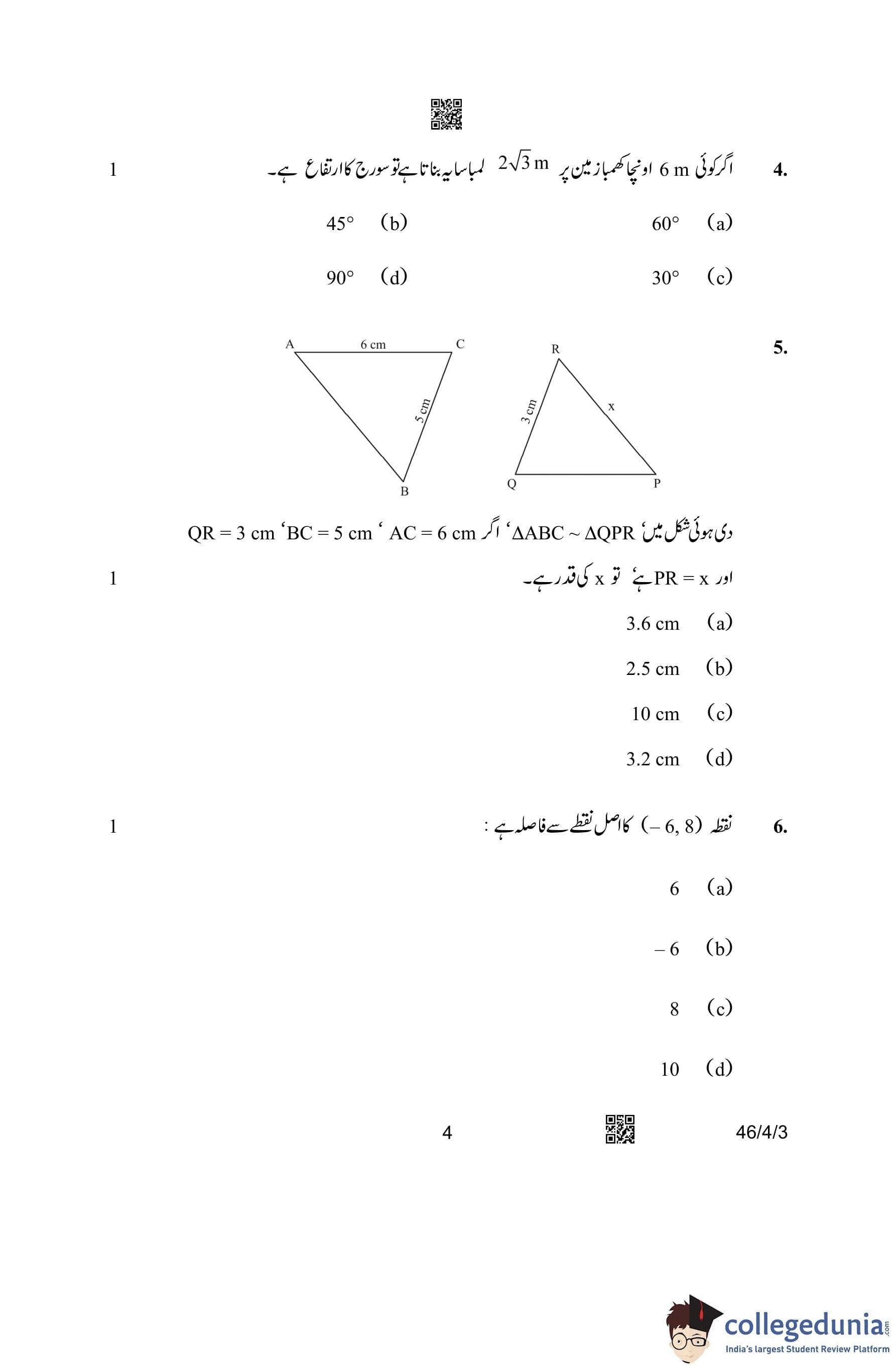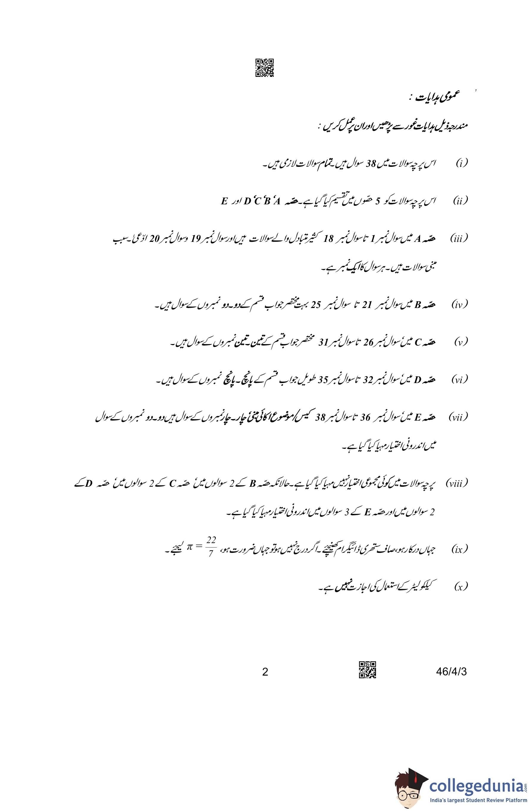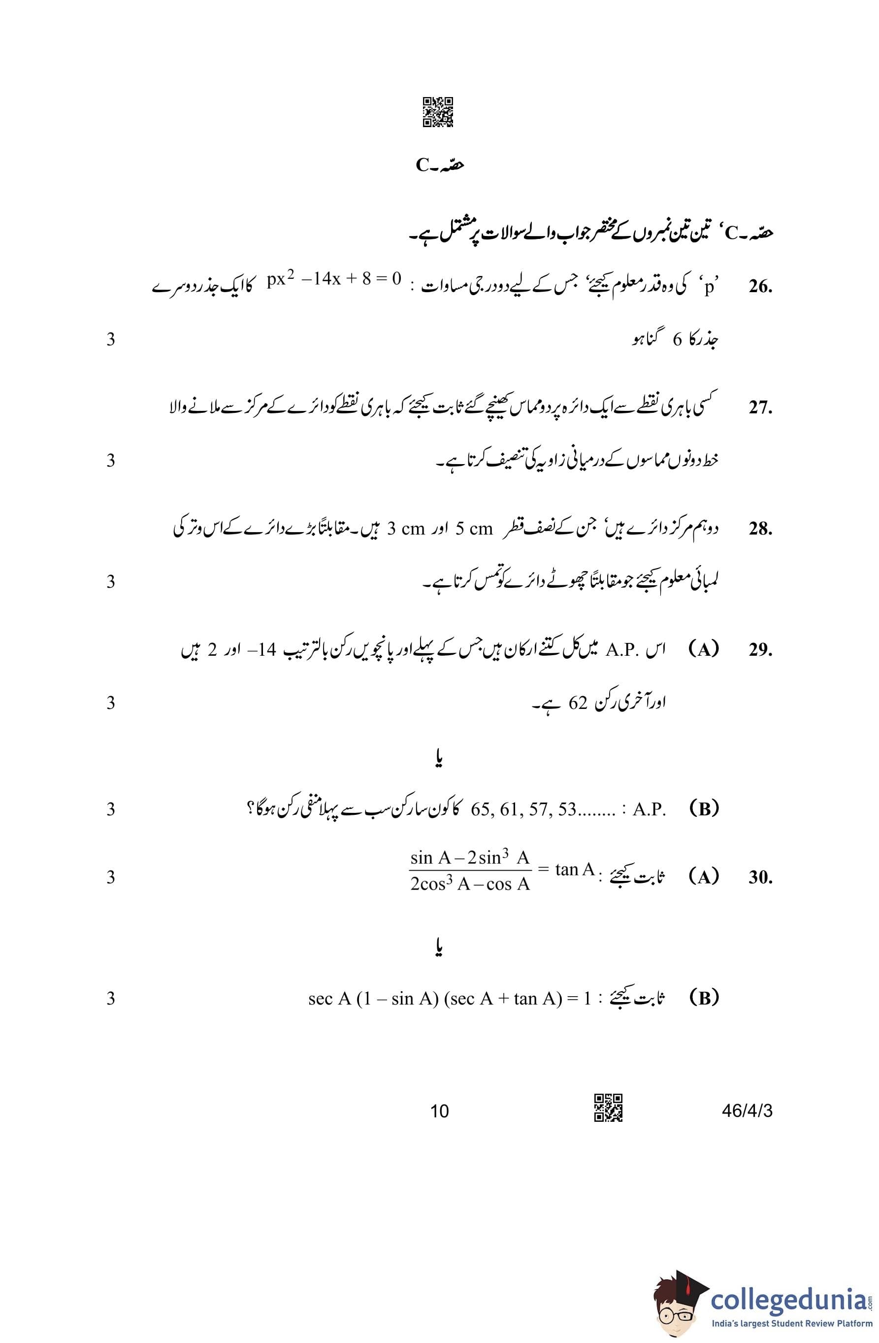 CBSE Class 10 Mathematics Standard (Set 3- 46/4/3) Urdu Question Paper 2023 with Answer Key