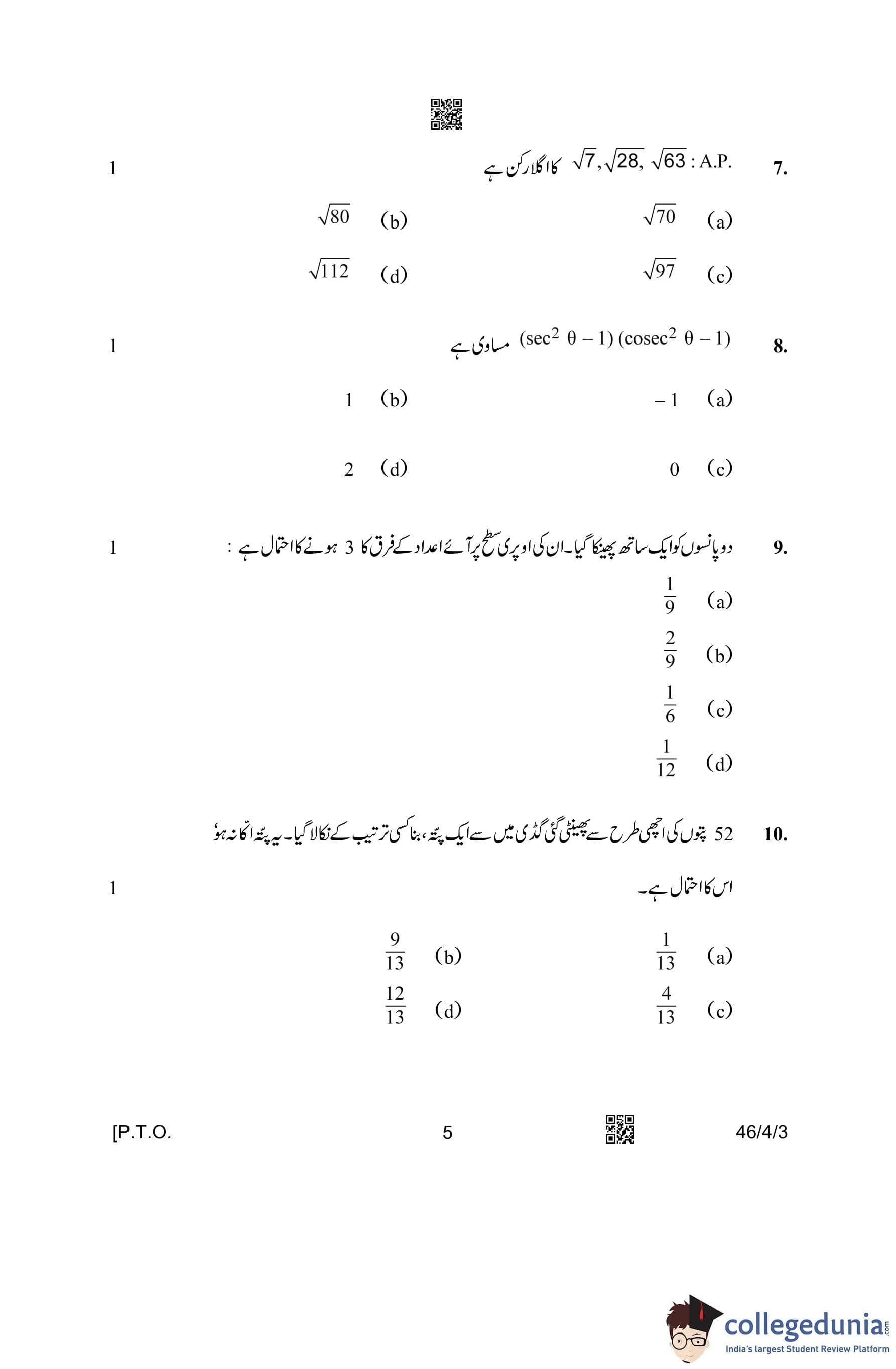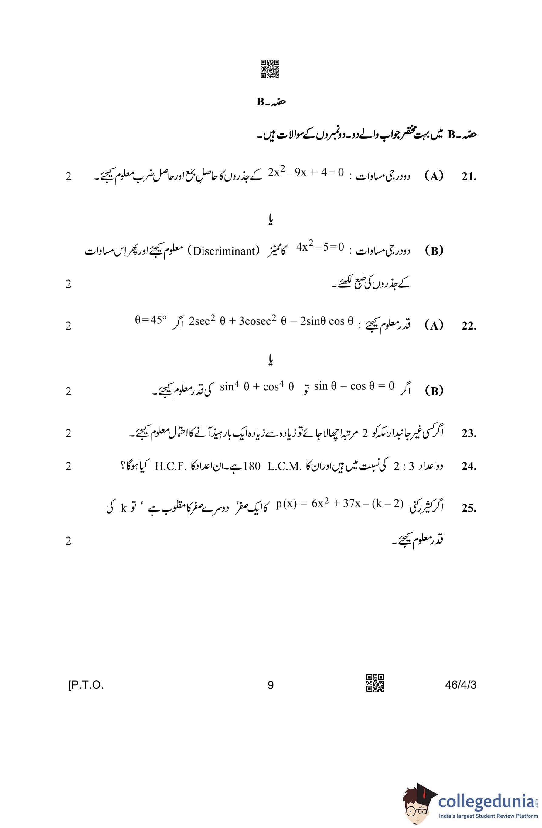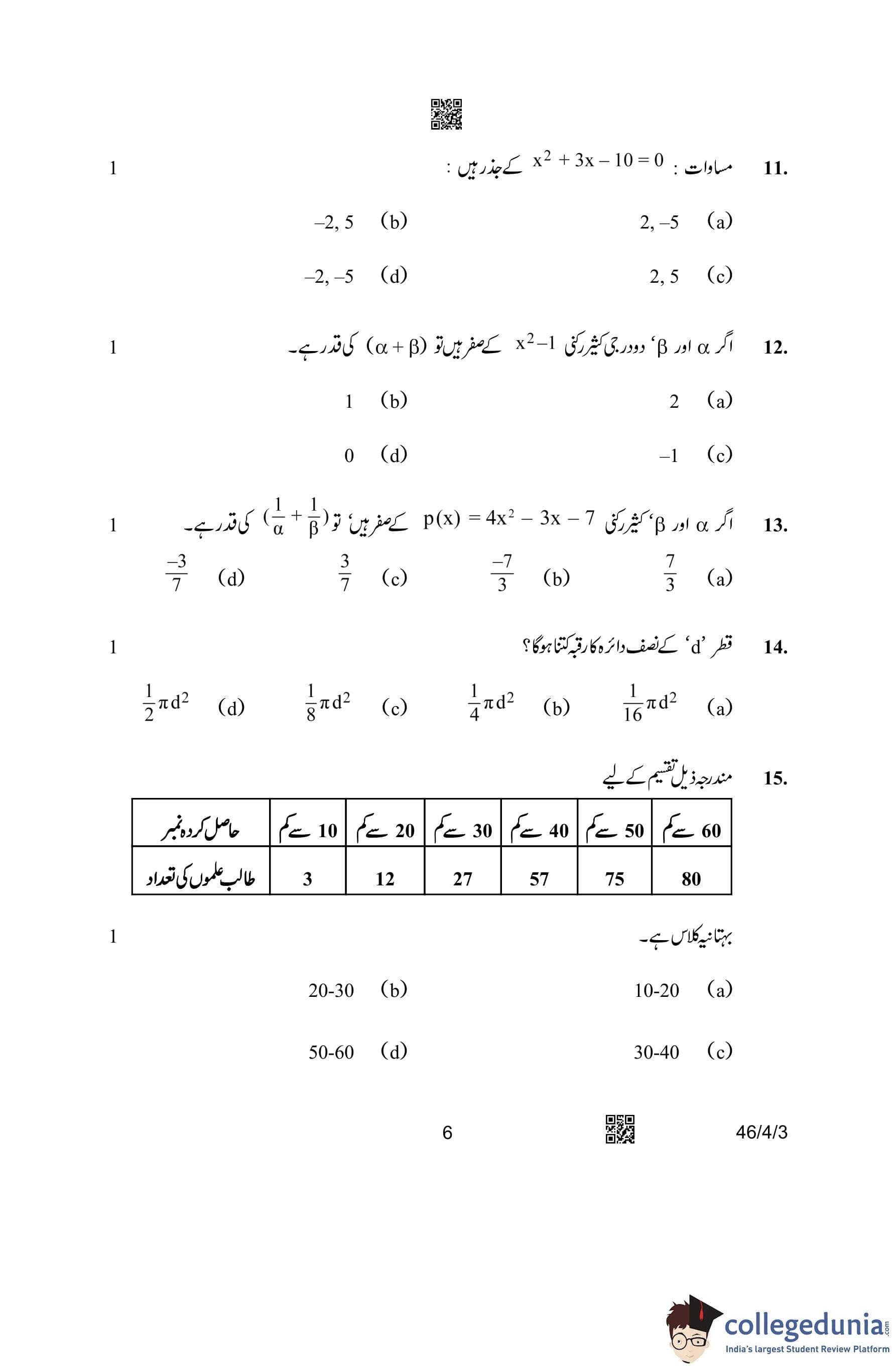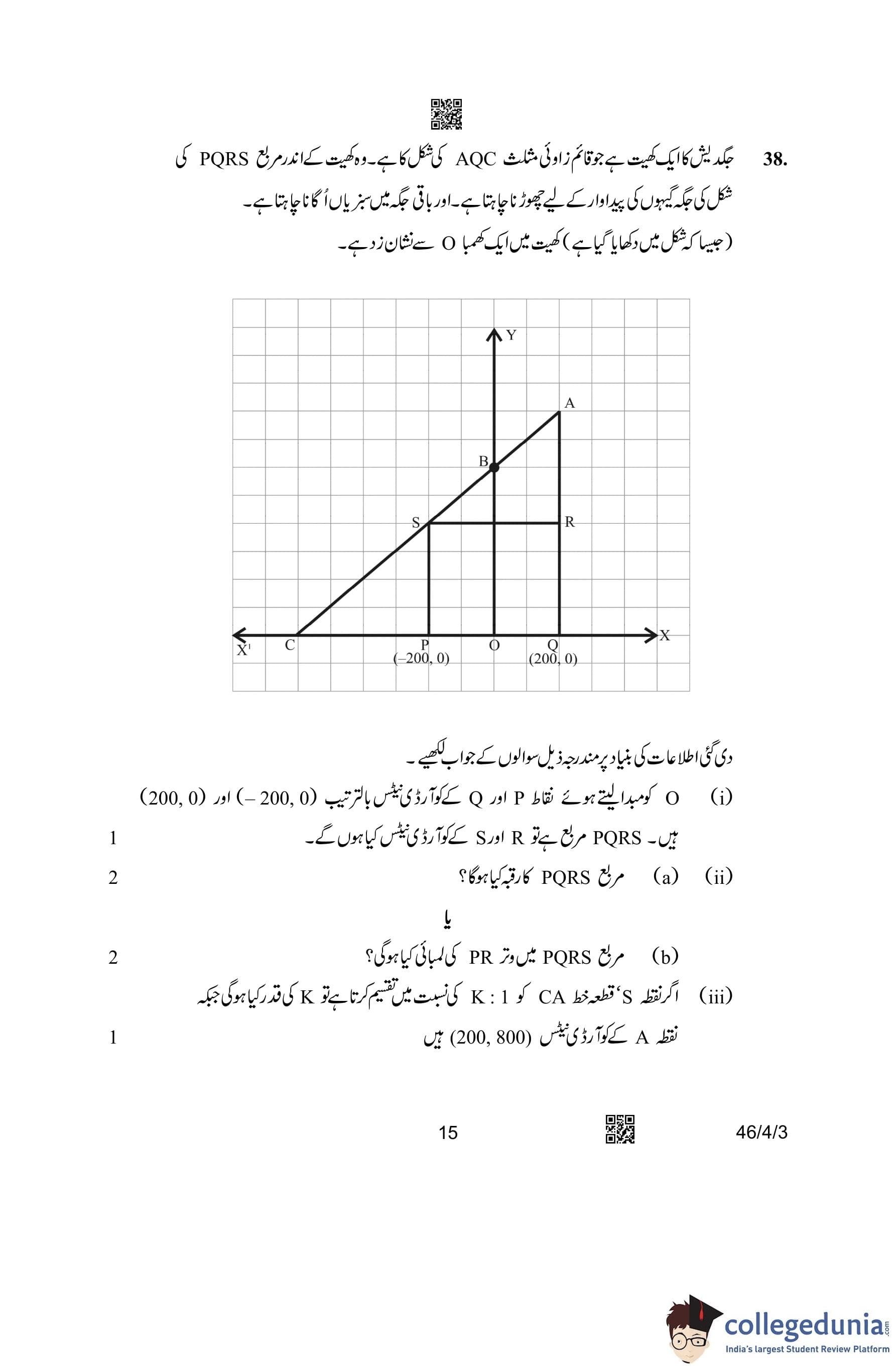 CBSE Class 10 Mathematics Standard (Set 3- 46/4/3) Urdu Question Paper 2023 with Answer Key