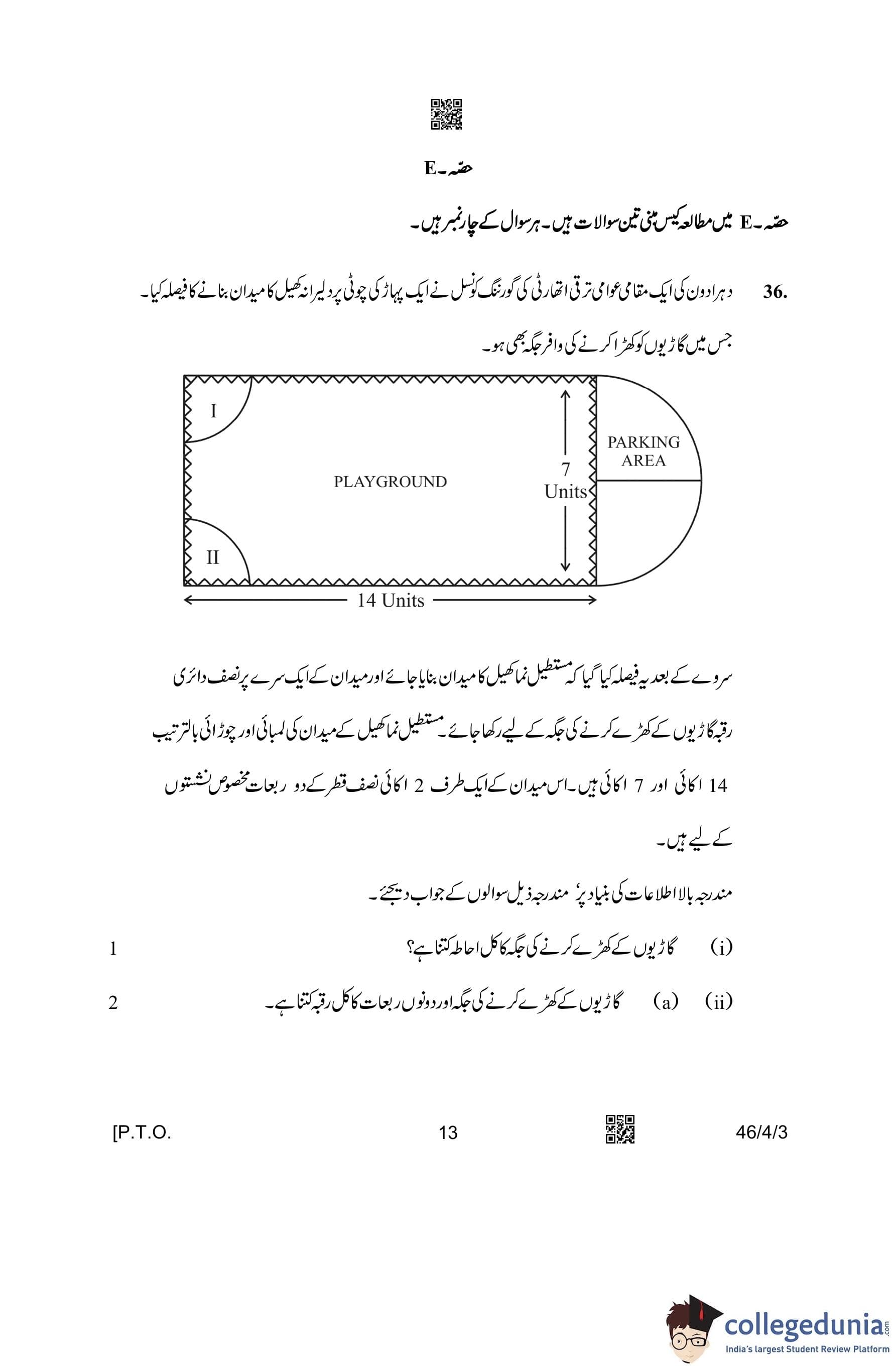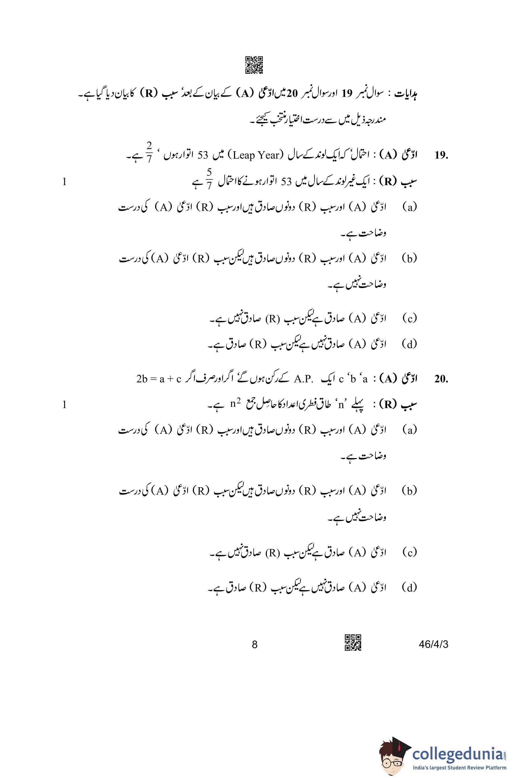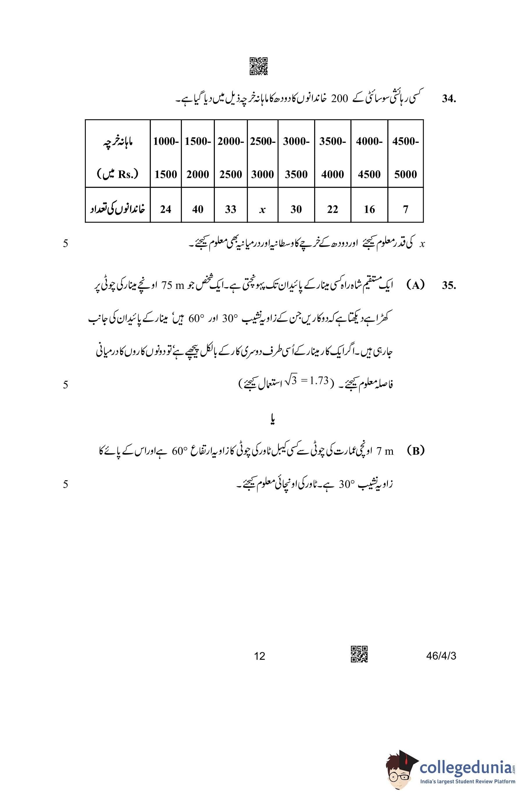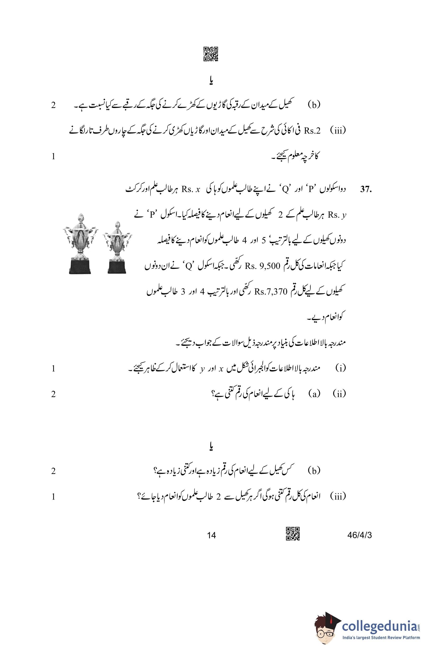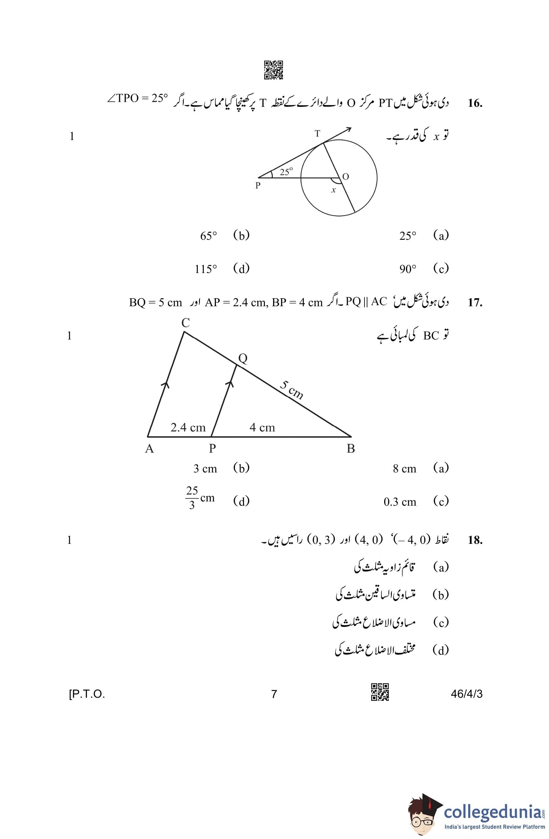 CBSE Class 10 Mathematics Standard (Set 3- 46/4/3) Urdu Question Paper 2023 with Answer Key