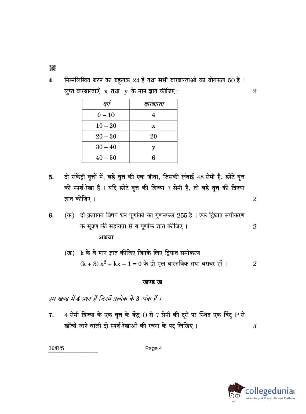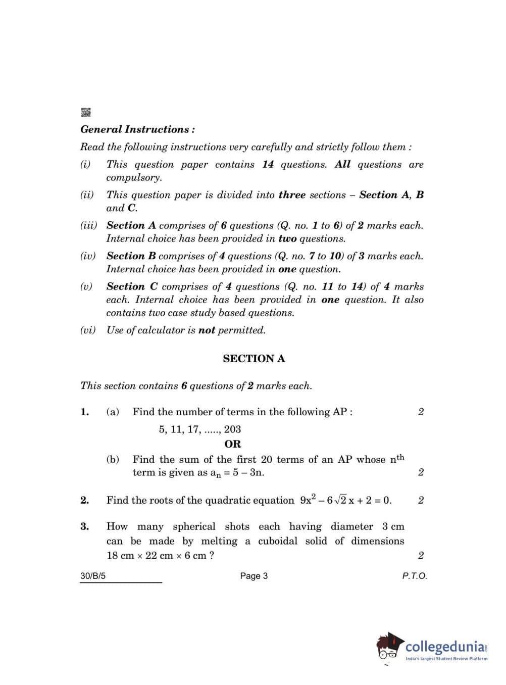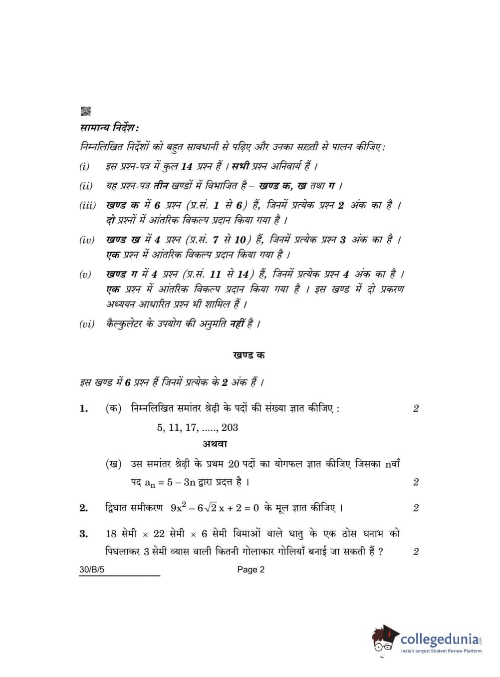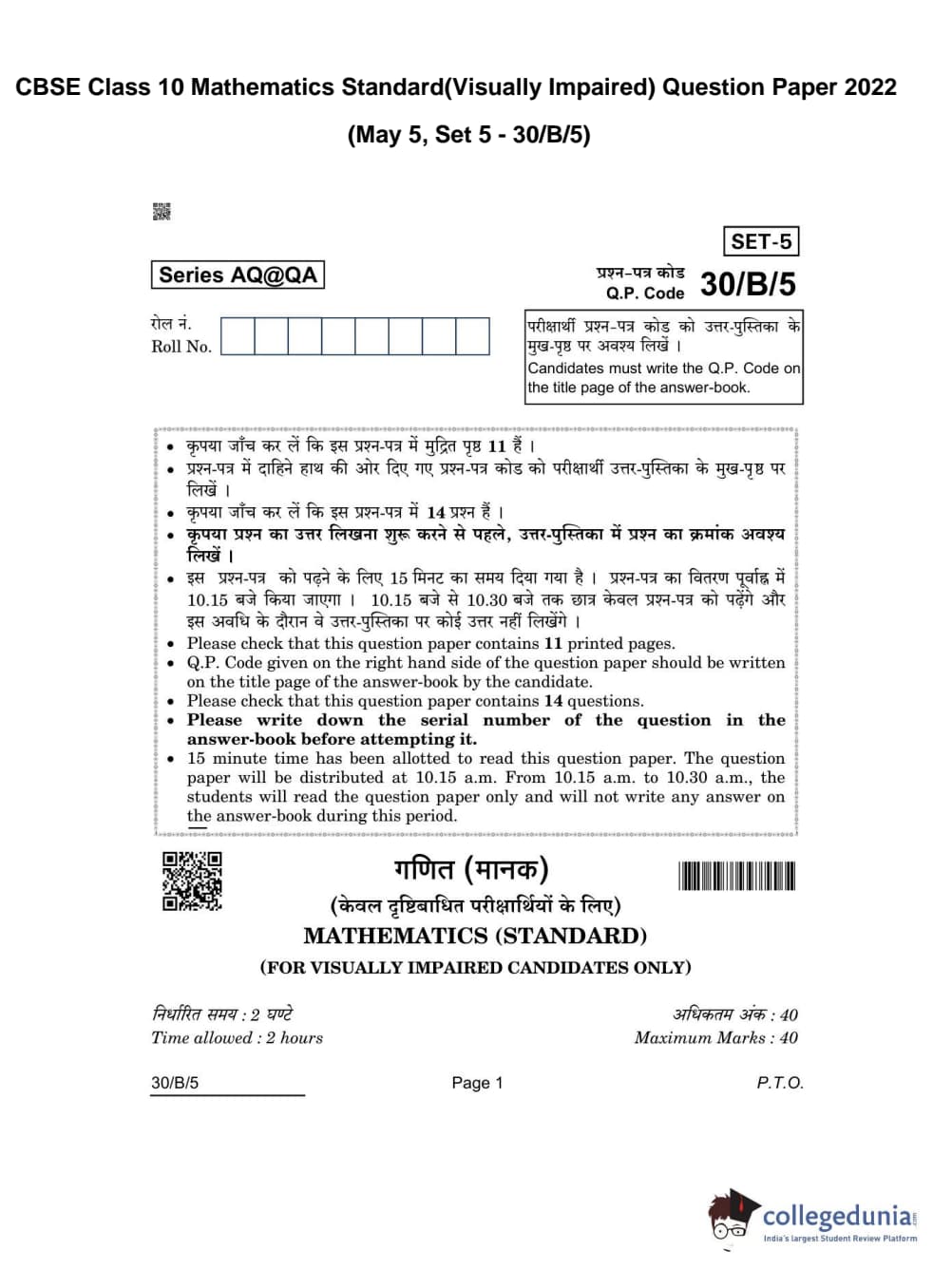 CBSE Class 10 Mathematics Standard(Visually Impaired) Question Paper 2022 with Answer Key Set 5 - 30/B/5 is available for download. The exam was conducted by the Central Board of Secondary Education on May 5, 2022 in the Morning Session 10:30 AM to 12:30 PM. The medium of paper was English & Hindi. The question paper comprised a total of 14 questions divided among 3 sections.