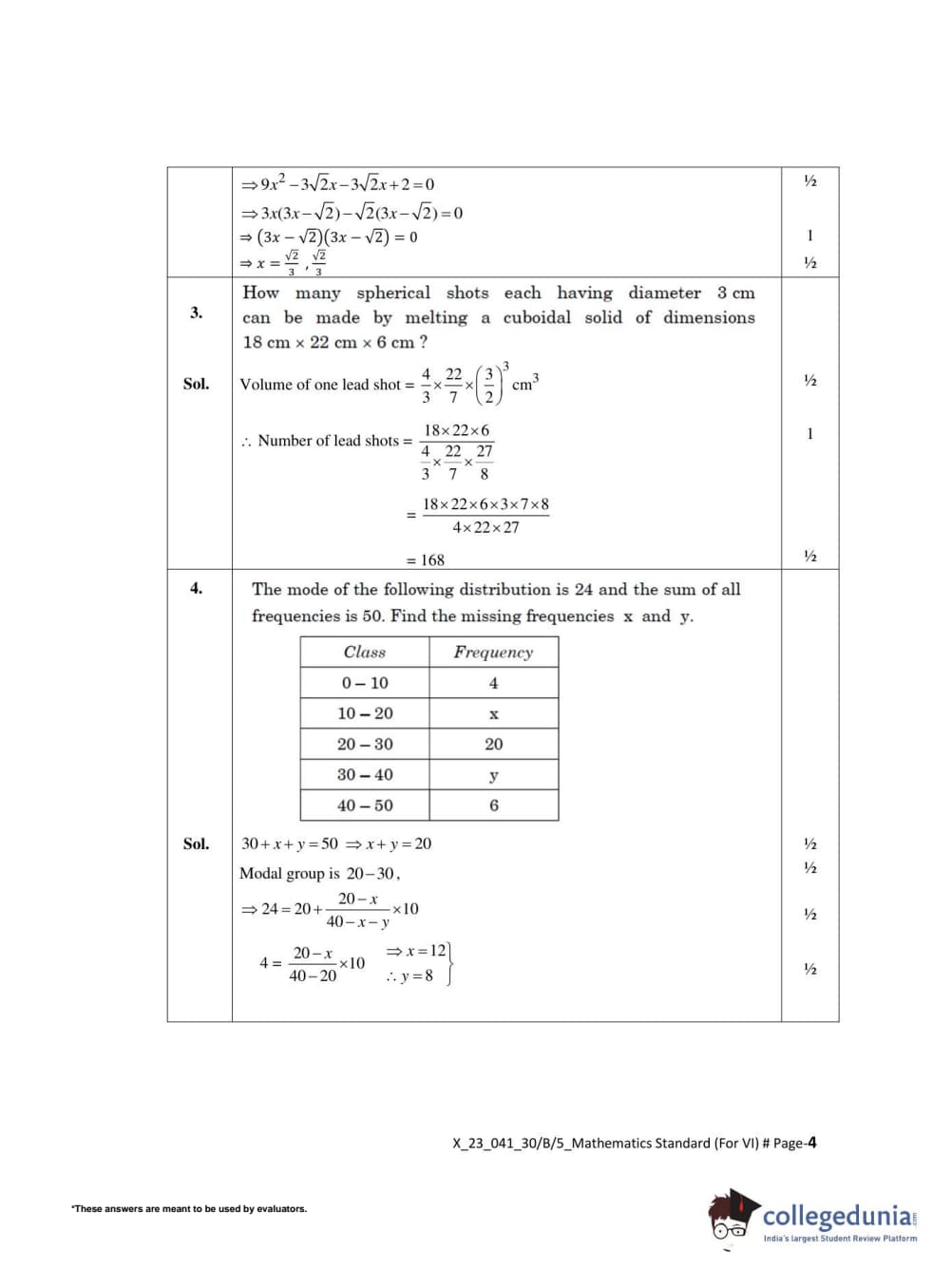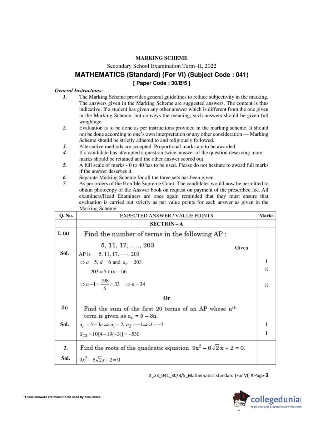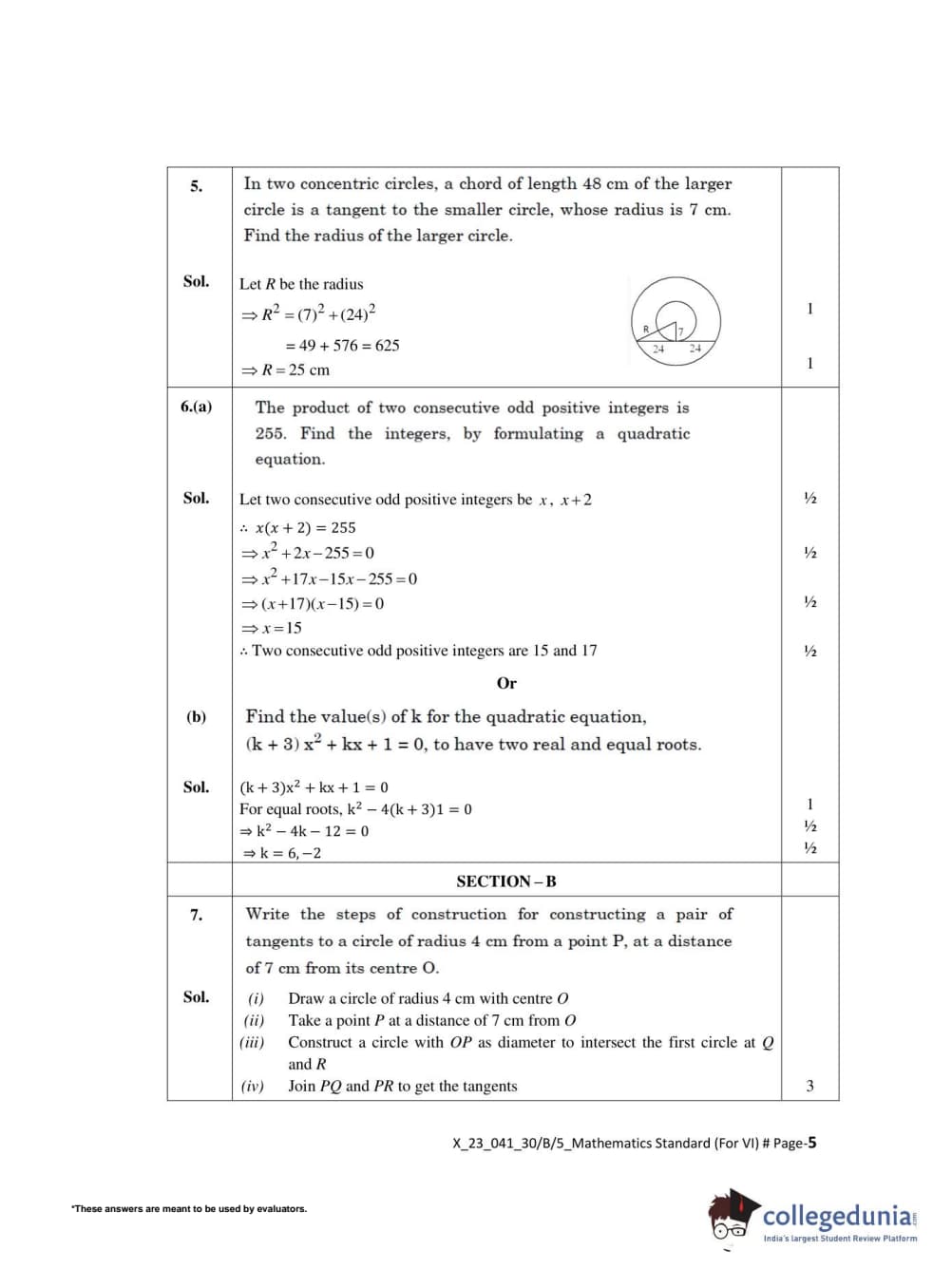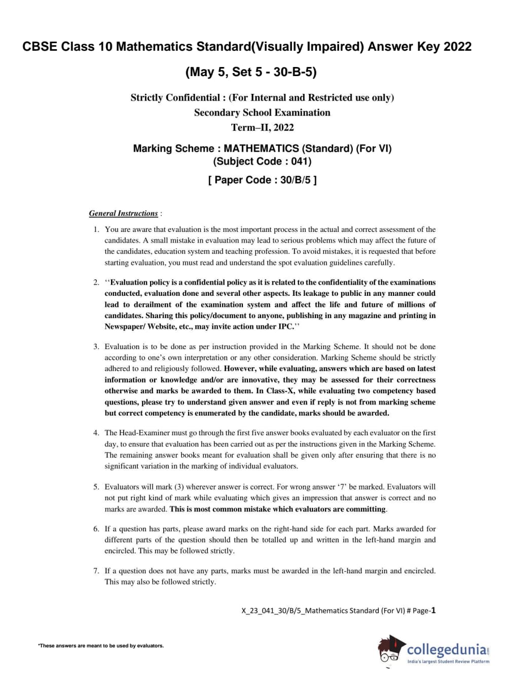 CBSE Class 10 Mathematics Standard(Visually Impaired) Set 5 - 30/B/5 Question Paper 2022 with Answer Key (May 5)