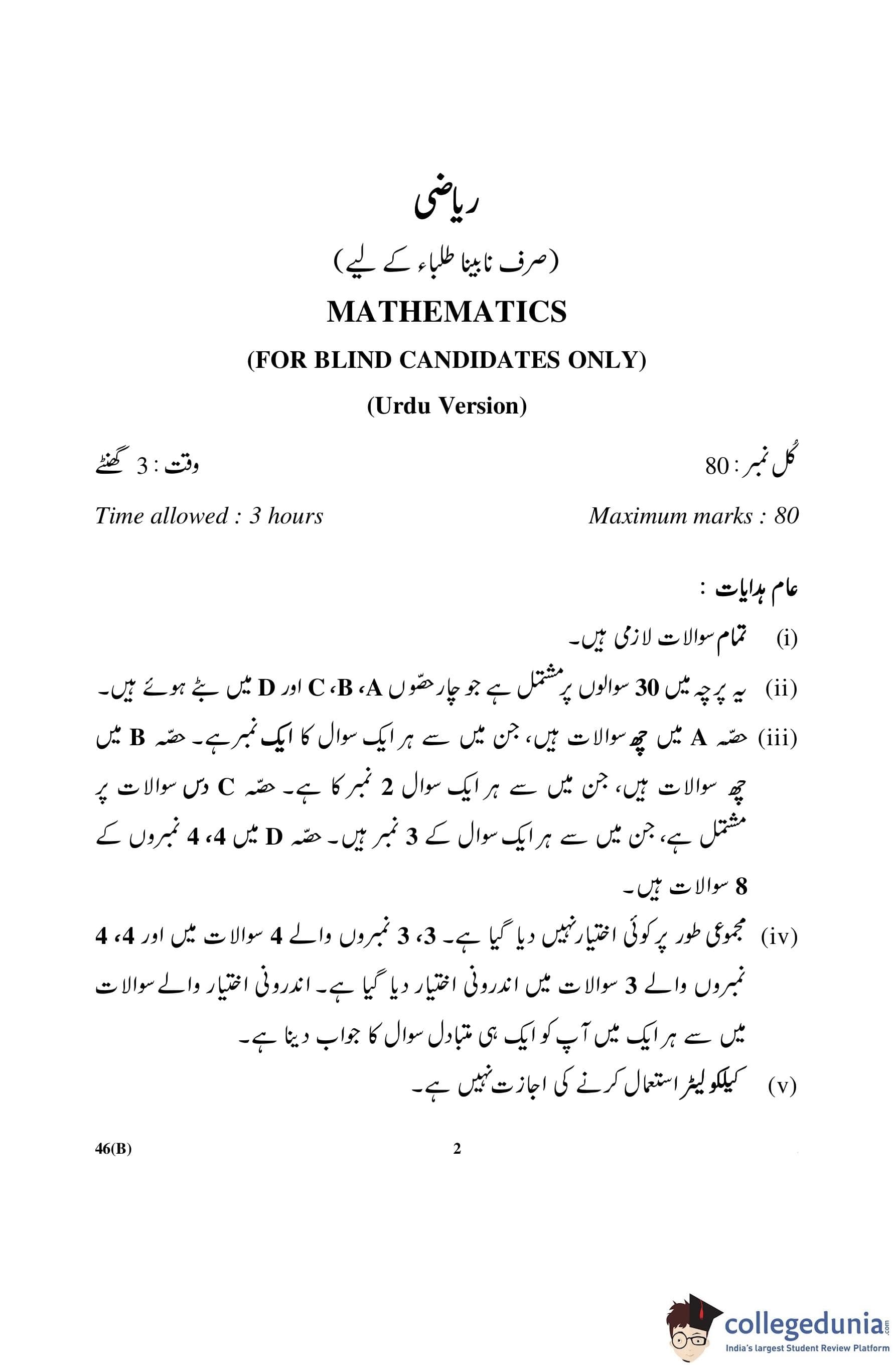 CBSE Class 10 Mathematics Urdu (For Blind) Question Paper 2018 with Answer Key Set 4 - 46(B) is available for download. The exam was conducted by the Central Board of Secondary Education on March 28, 2018 in the Morning Session 10:30 AM to 1:30 PM. The medium of paper was Urdu. The question paper comprised a total of 30 questions divided among 4 sections.