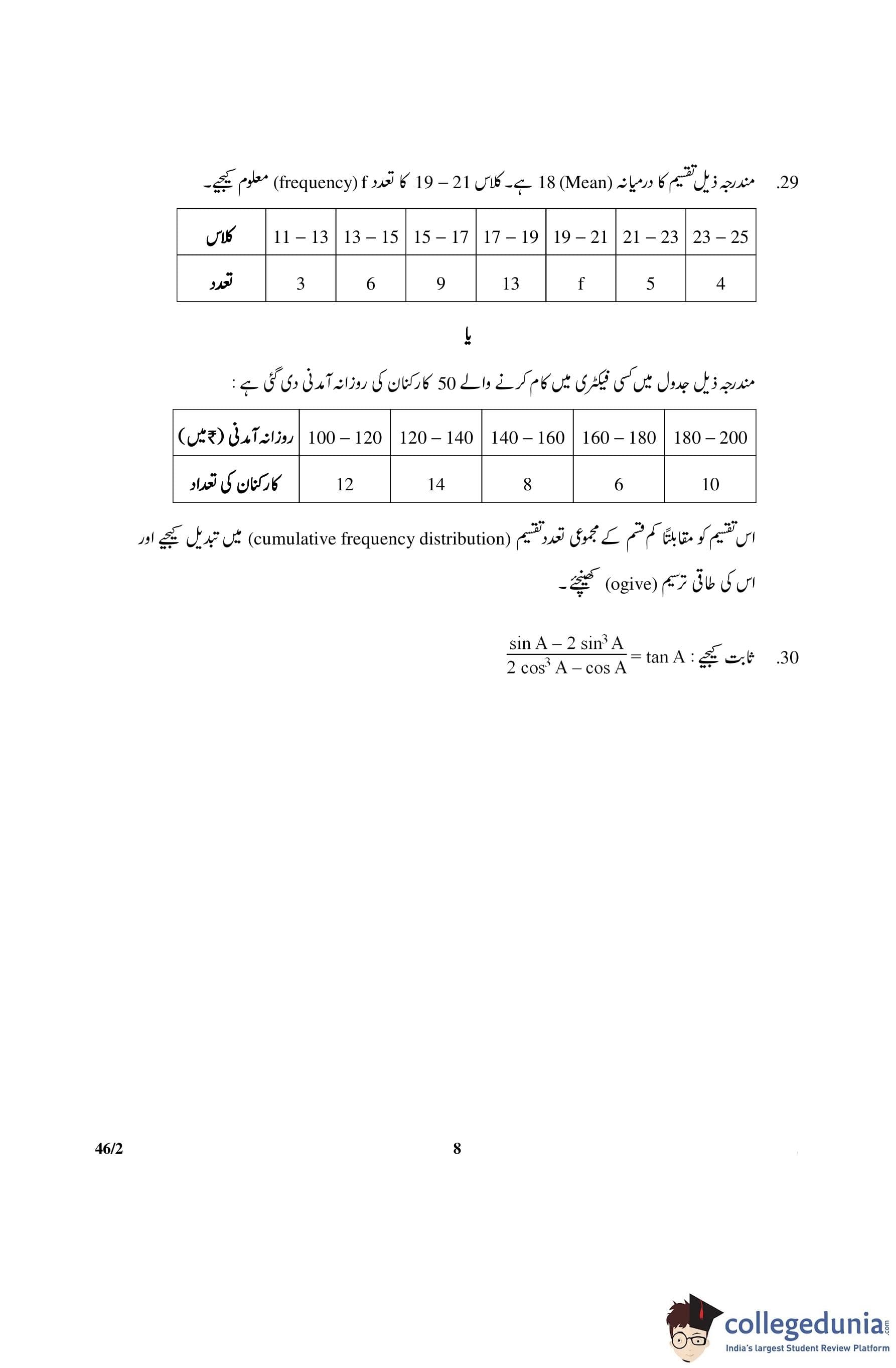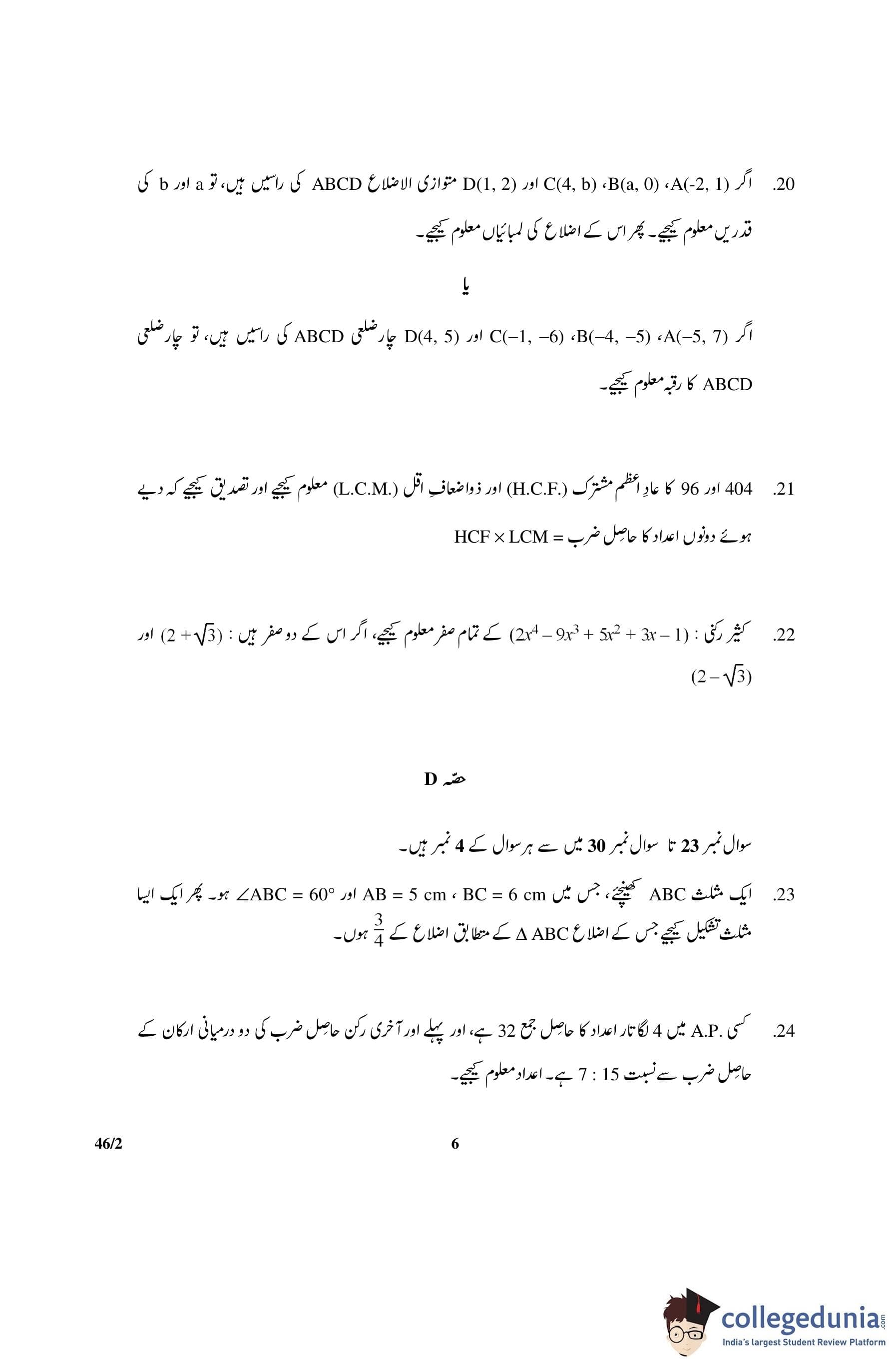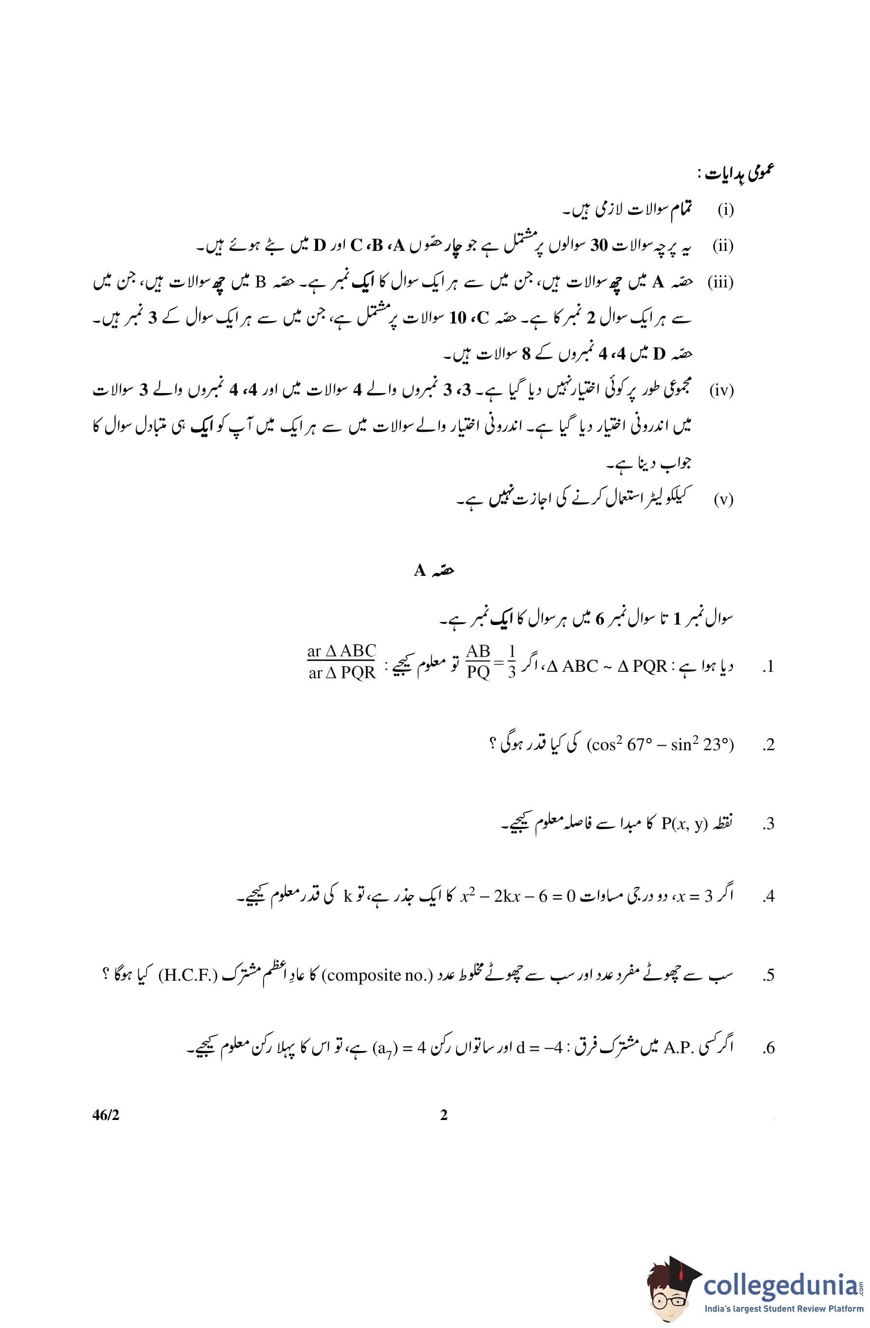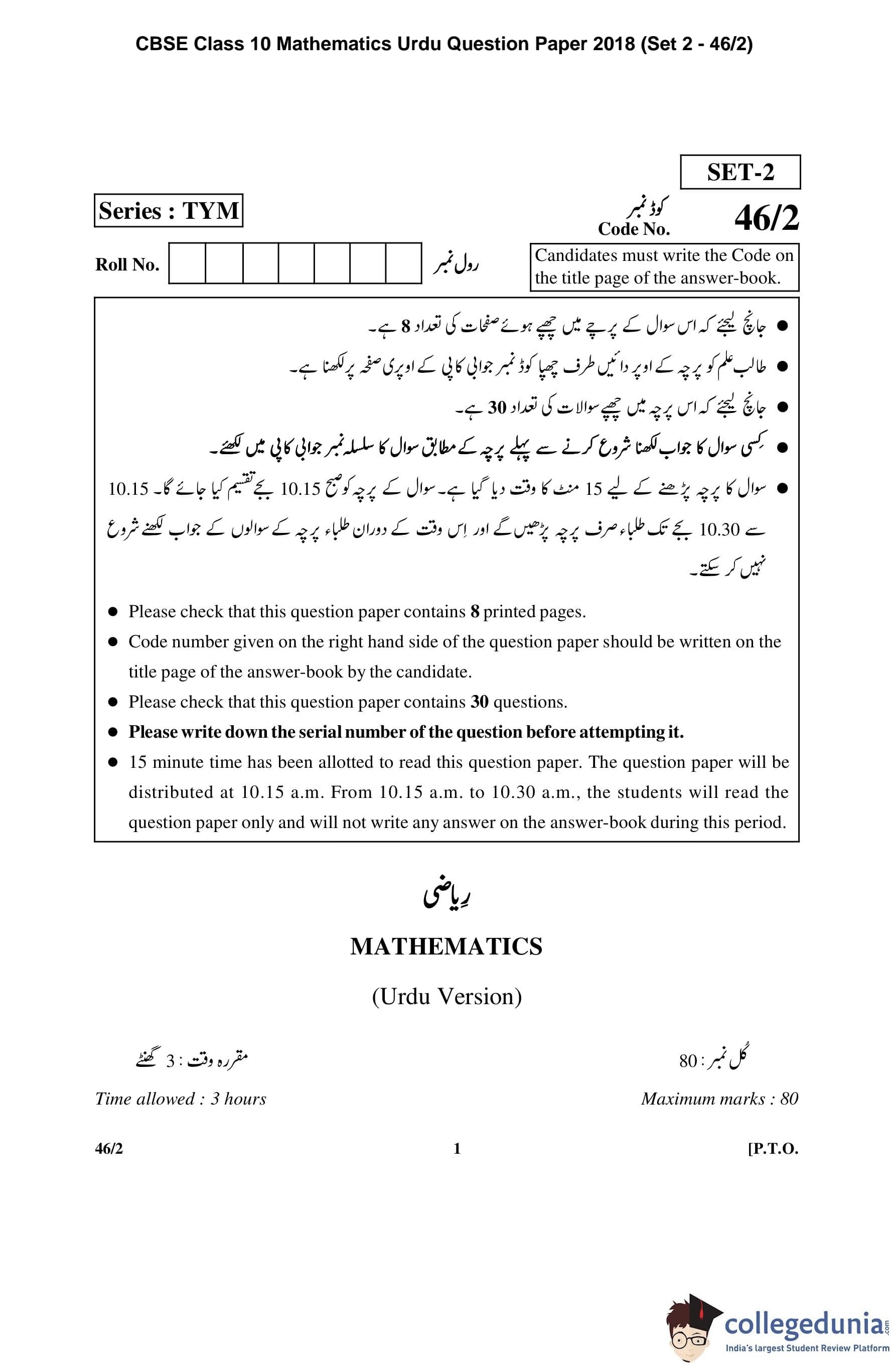 CBSE Class 10 Mathematics Urdu Question Paper 2018 with Answer Key Set 2 - 46/2 is available for download. The exam was conducted by the Central Board of Secondary Education on March 28, 2018 in the Morning Session 10:30 AM to 1:30 PM. The medium of paper was Urdu.The question paper comprised a total of 30 questions divided among 4 sections.