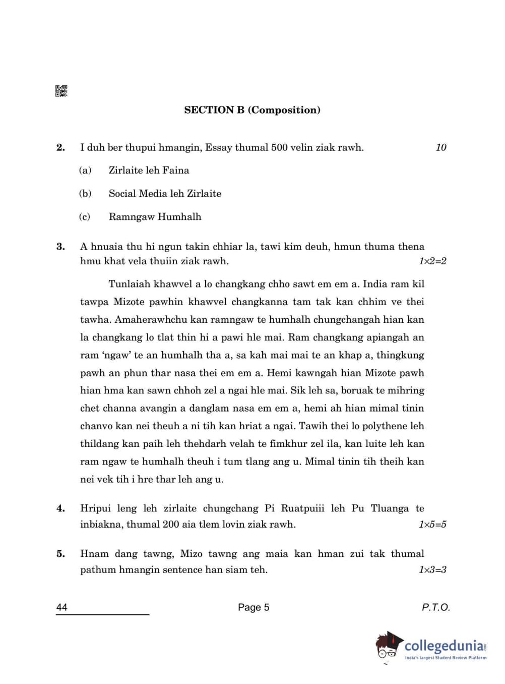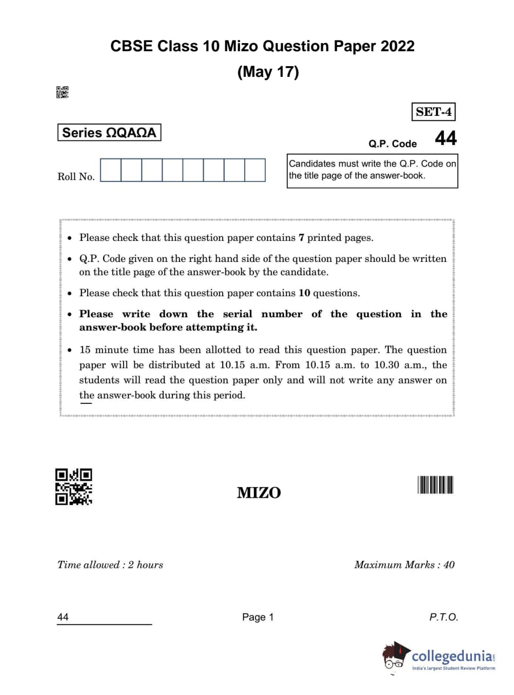 CBSE Class 10 Mizo Question Paper 2022 with Answer Key Set 4 is available for download. The exam was conducted by the Central Board of Secondary Education on May 17, 2022 in the Morning Session 10:30 AM to 12:30 PM. The medium of paper was Mizo. The question paper comprised a total of 10 questions divided among 3 sections.