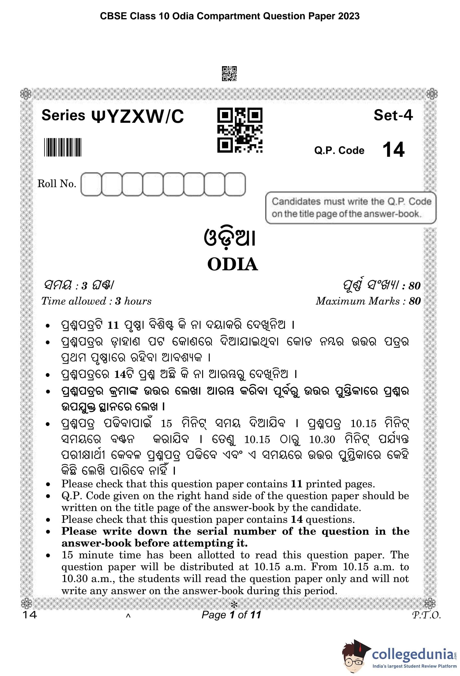 CBSE Class 10 Odia Compartment Question Paper 2023 with Answer Key