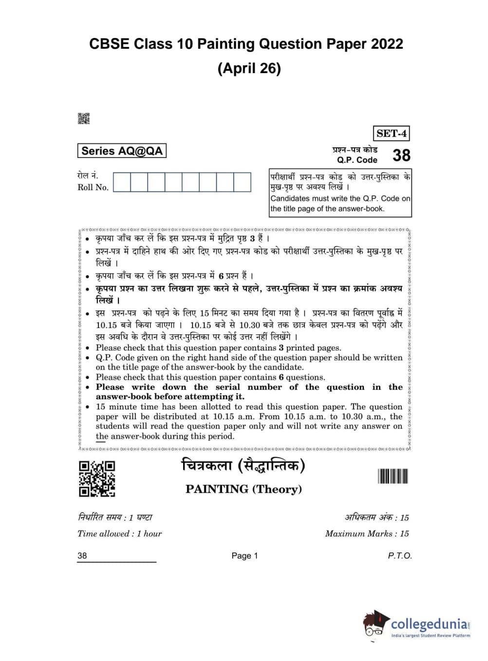 CBSE Class 10 Painting Question Paper 2022 with Answer Key Set 4 is available for download. The exam was conducted by the Central Board of Secondary Education on April 26, 2022 in the Morning Session 10:30 AM to 11:30 AM. The medium of paper was English & Hindi. The question paper comprised a total of 6 questions.