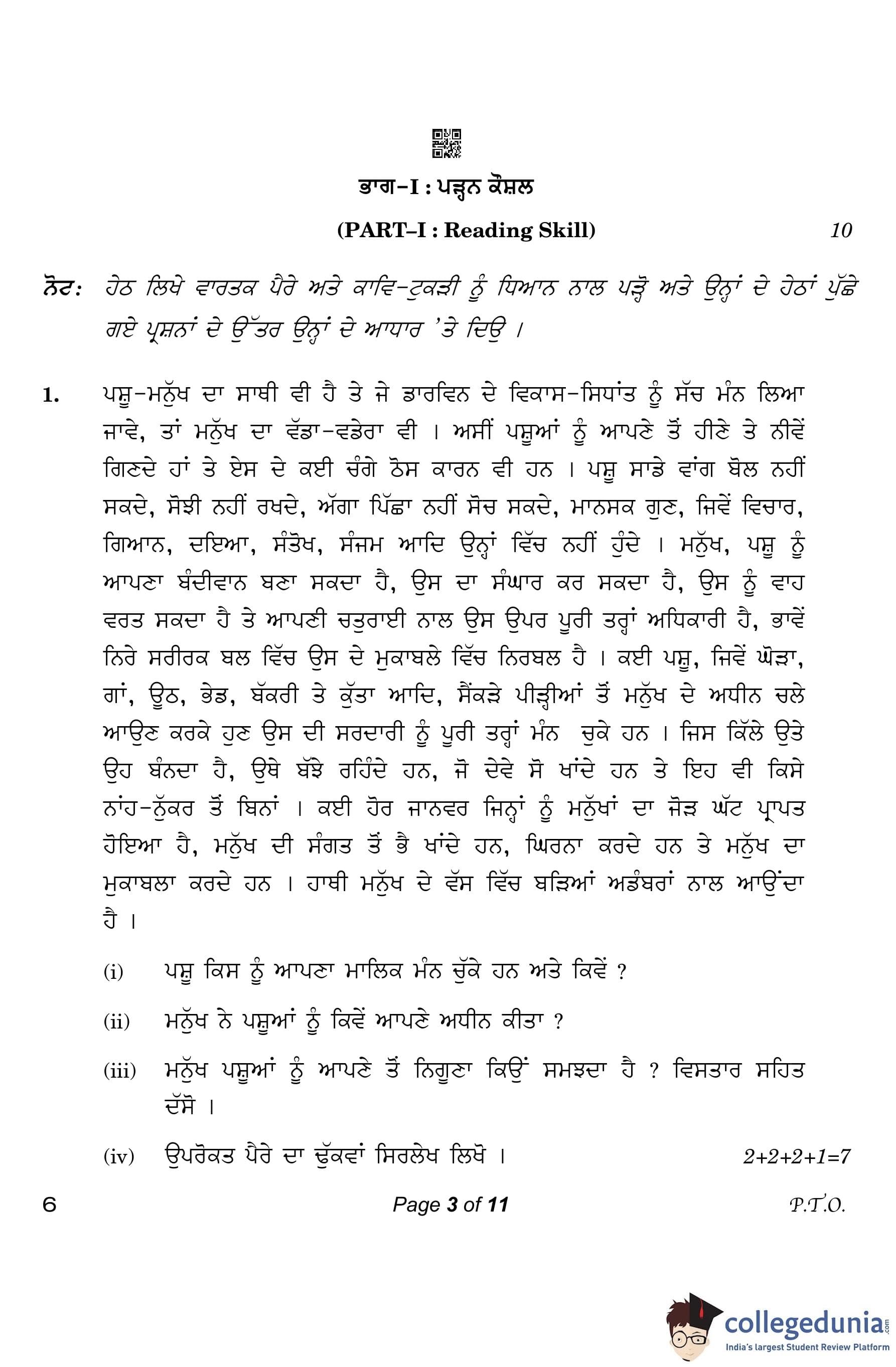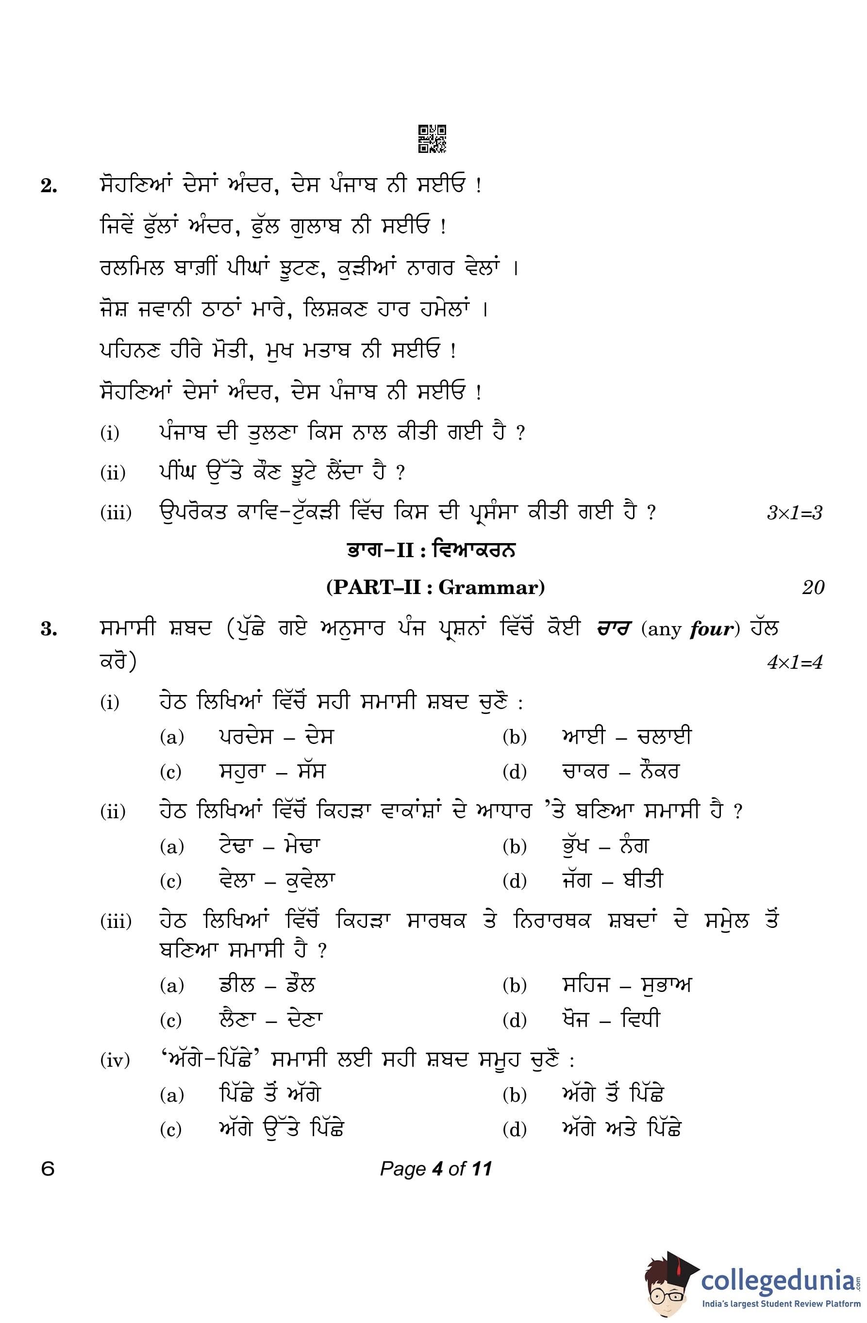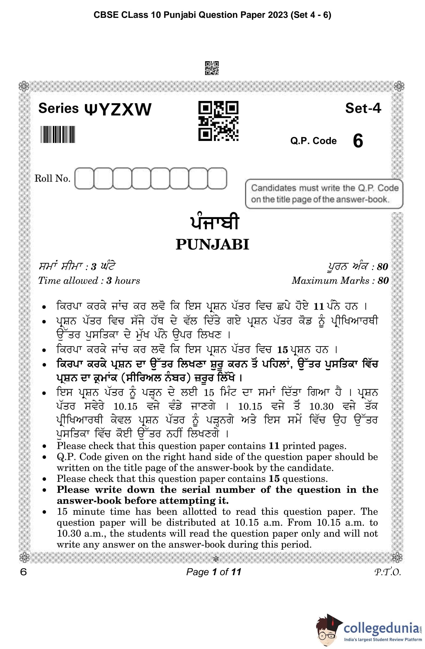CBSE Class 10 Punjabi Question Paper 2023 (Set 4- 6) with Answer Key pdf is available for download here. The exam was conducted by Central Board of Secondary Education on March 1, 2023. The question paper comprised a total of 15 questions divided among 4 sections.