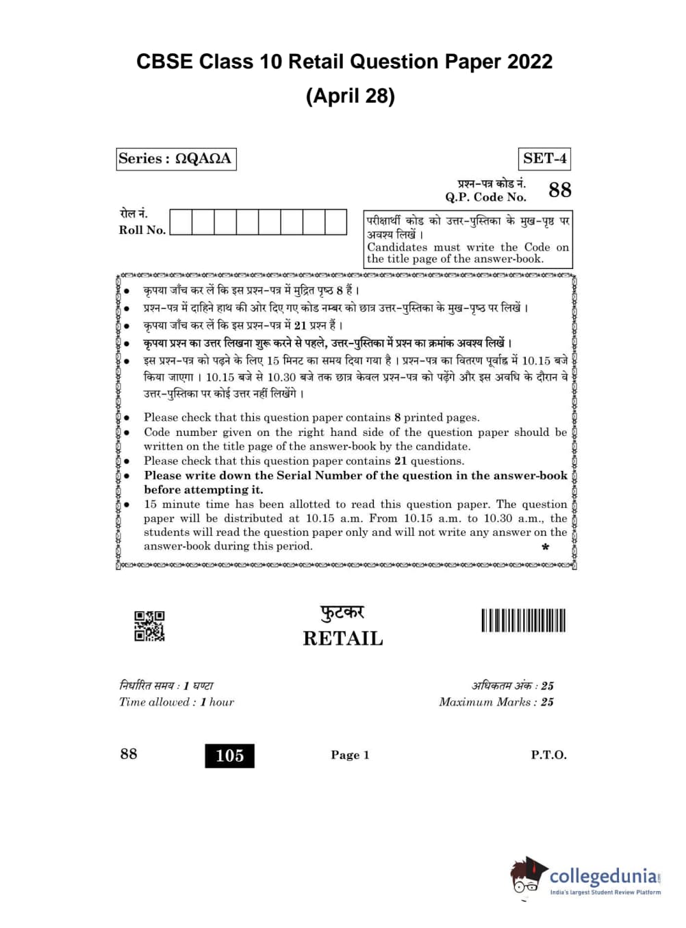 CBSE Class 10 Retail Question Paper 2022 with Answer Key (April 28)