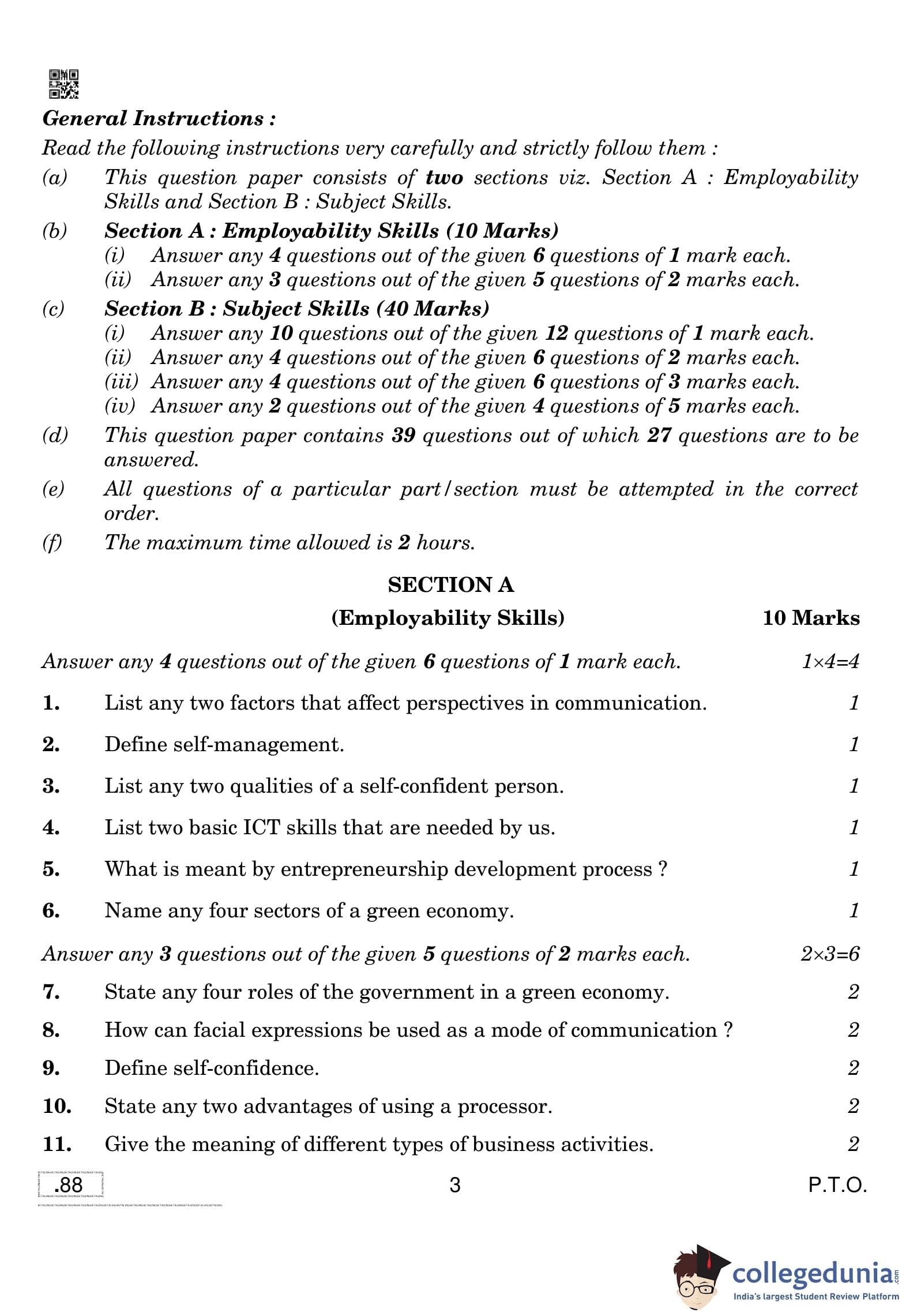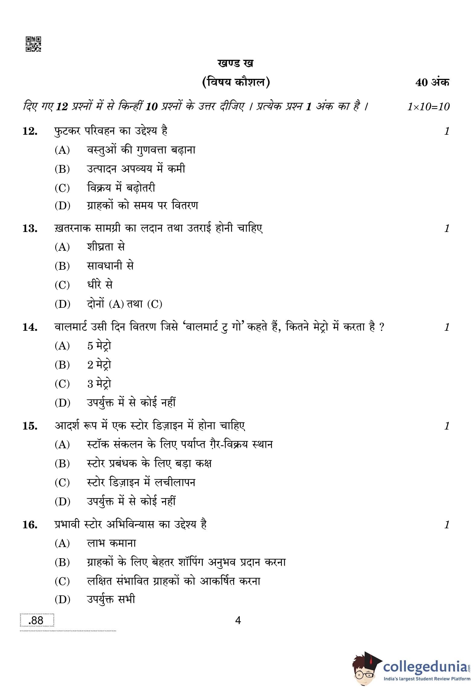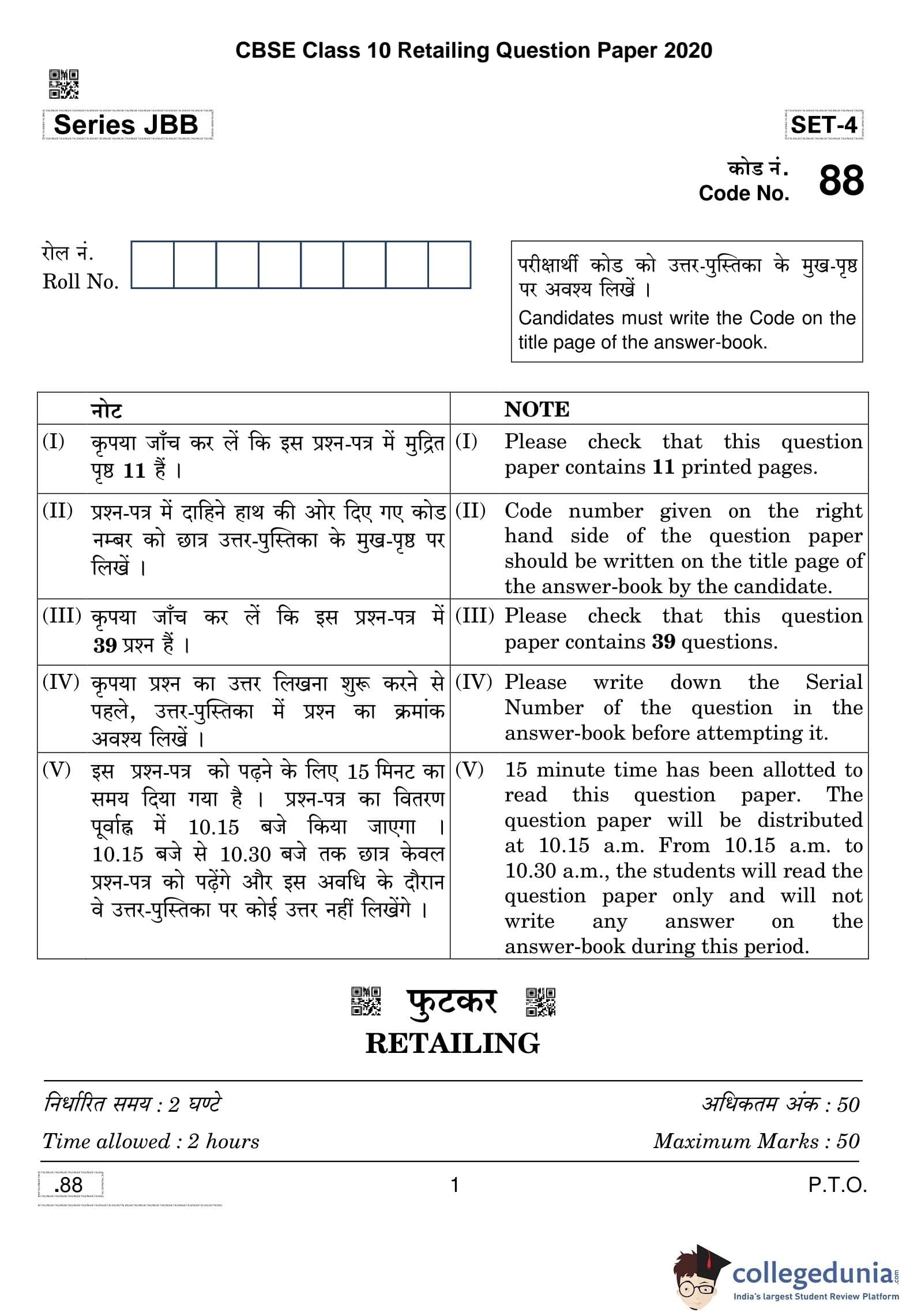 CBSE Class 10 Retailing Question Paper 2020 with Answer Key Set 4 is available for download. The exam was conducted by the Central Board of Secondary Education on February 15, 2020 in the Morning Session 10:30 AM to 12:30 PM. The medium of paper was English and Hindi. The question paper comprised a total of 39 questions divided among 2 sections.
