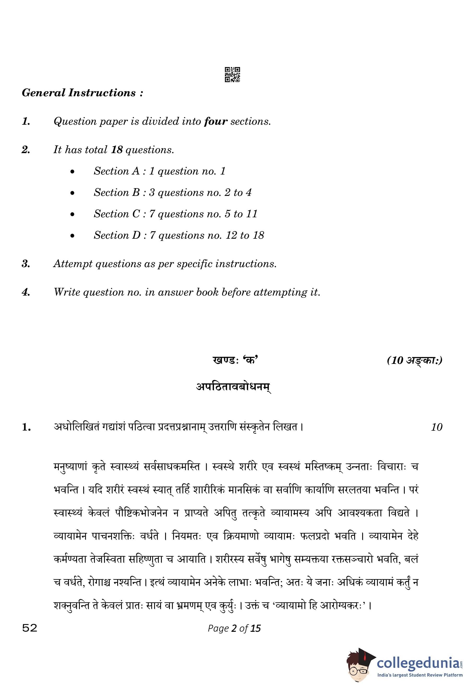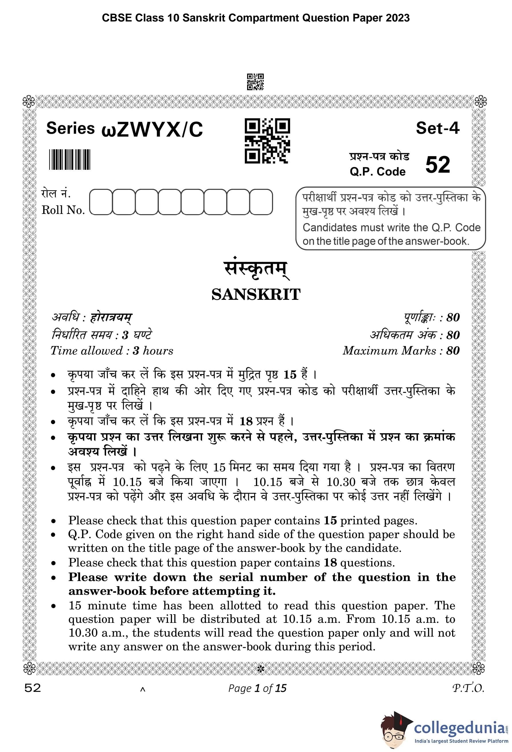 CBSE Class 10 Sanskrit Compartment Question Paper 2023 with Answer Key pdf is available for download here. The exam was conducted by Central Board of Secondary Education on July 21, 2023 in the Morning Session 10:30 AM to 1:30 PM. The question paper comprised a total of 18 questions divided among 4 sections.