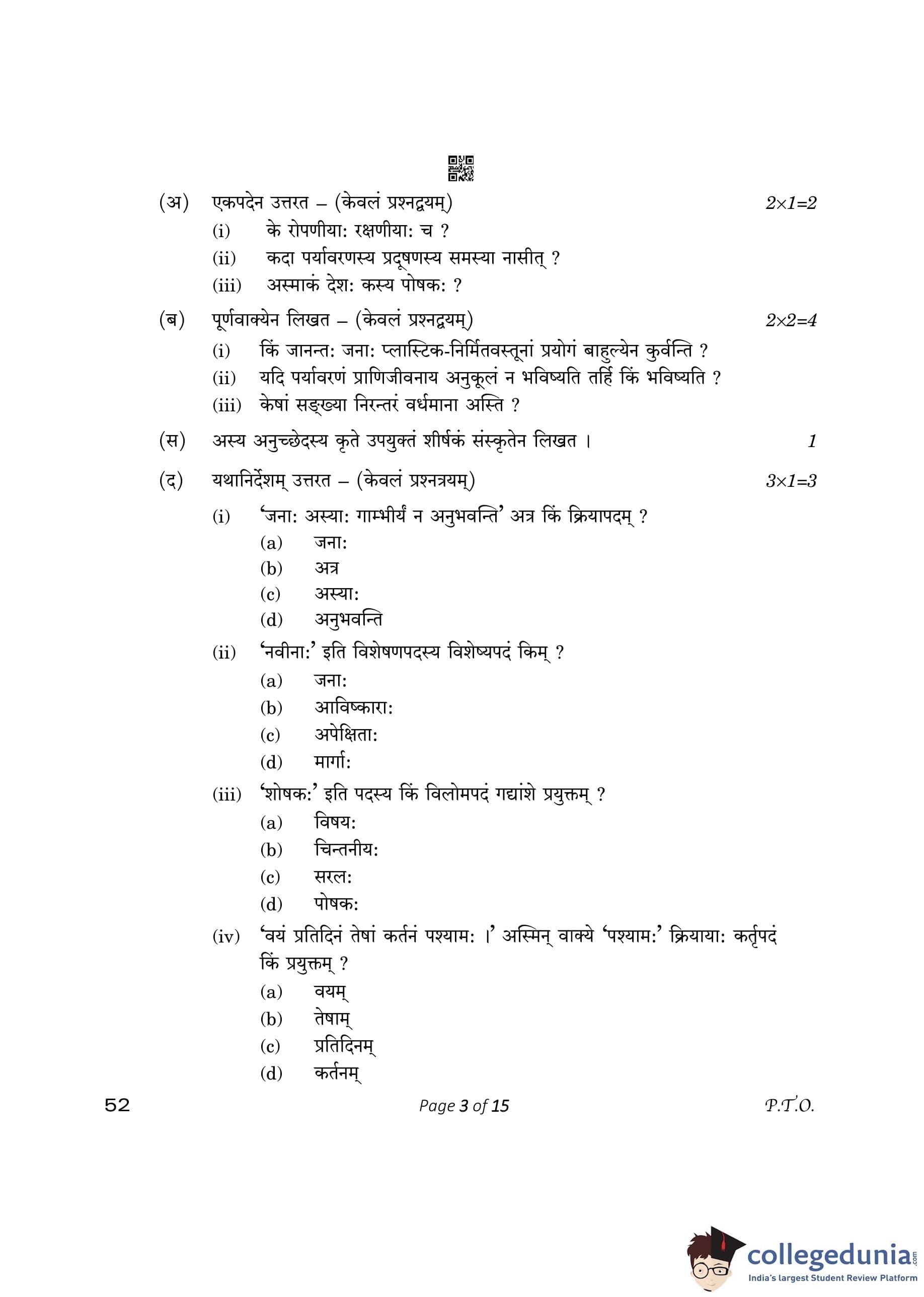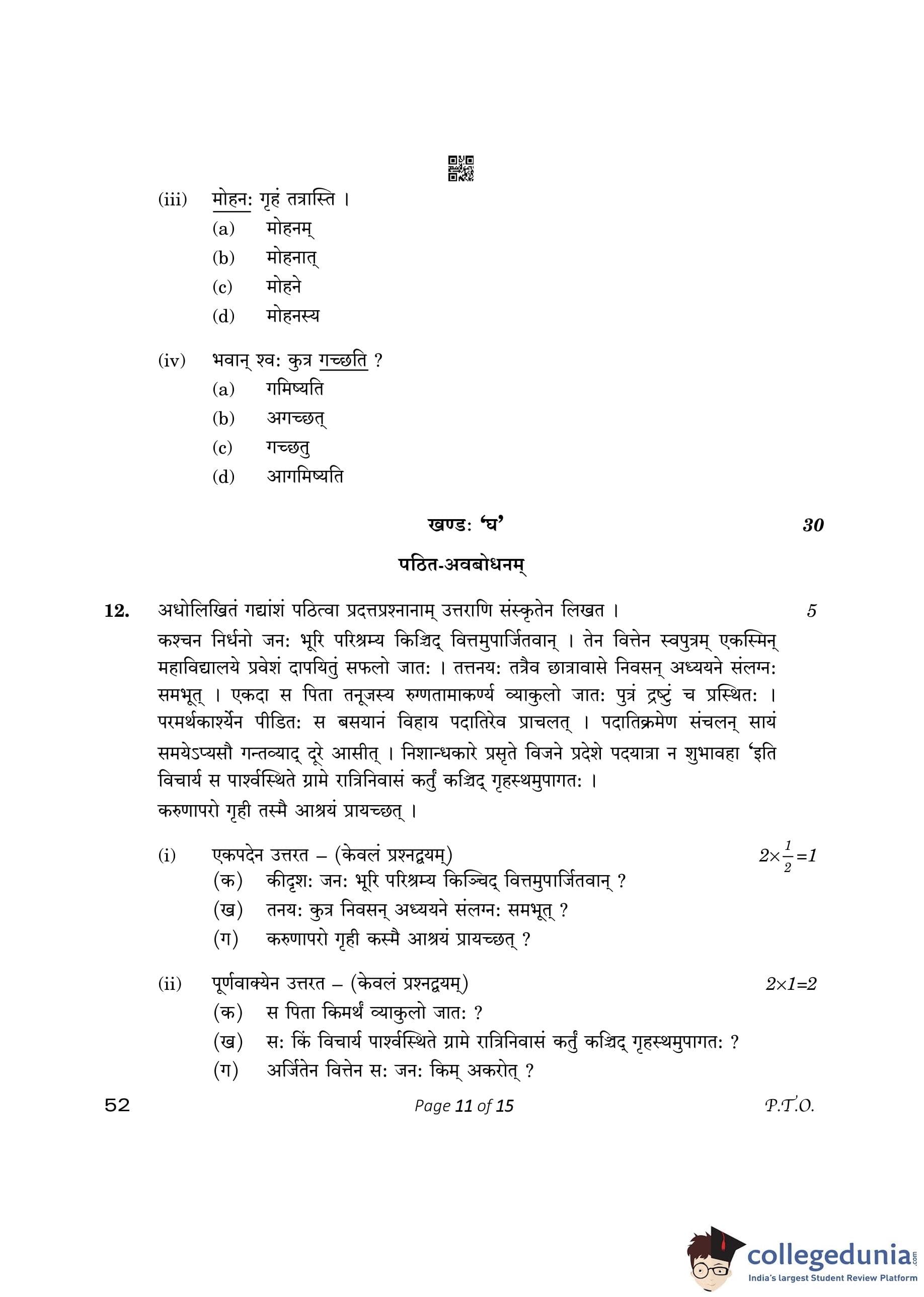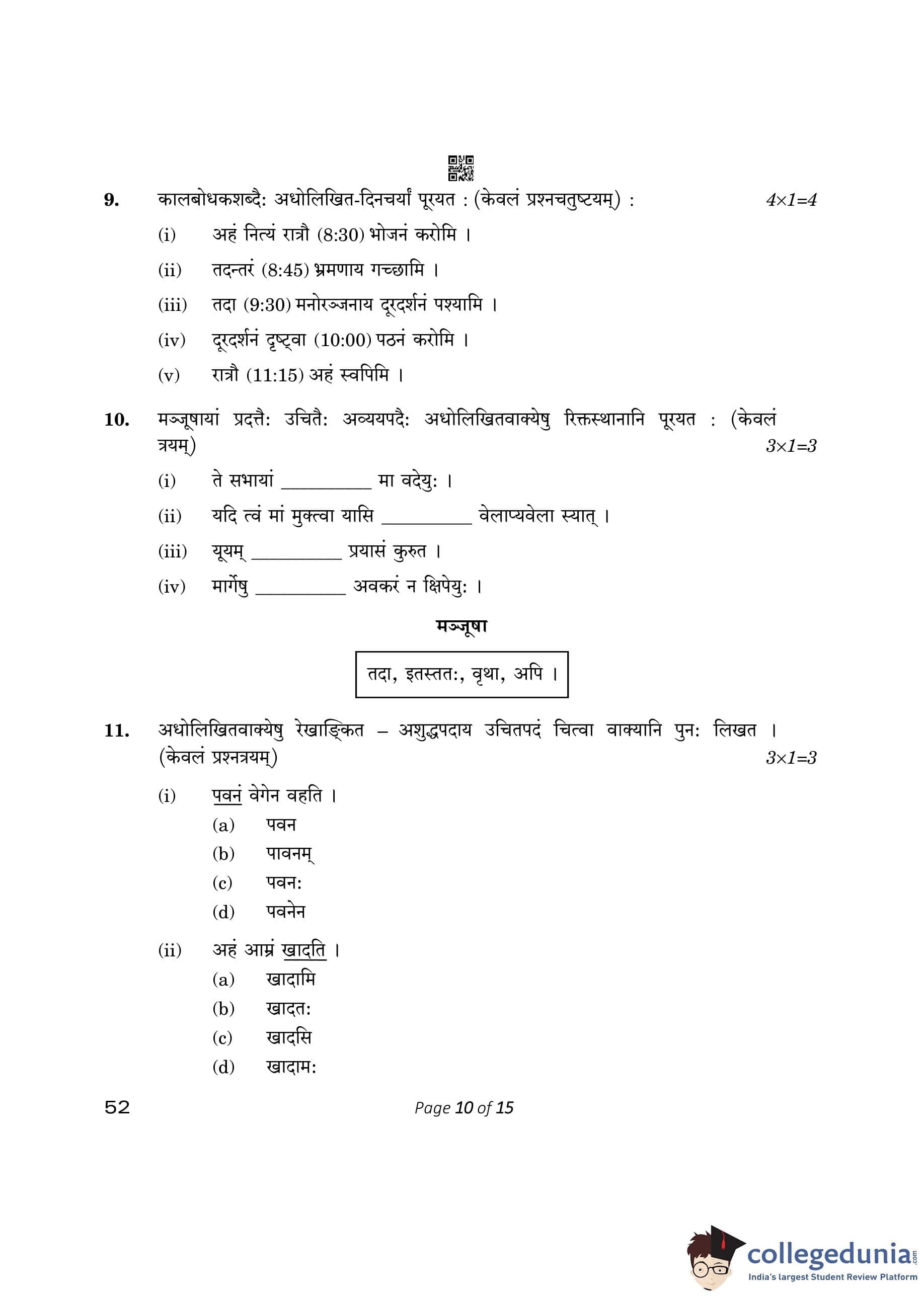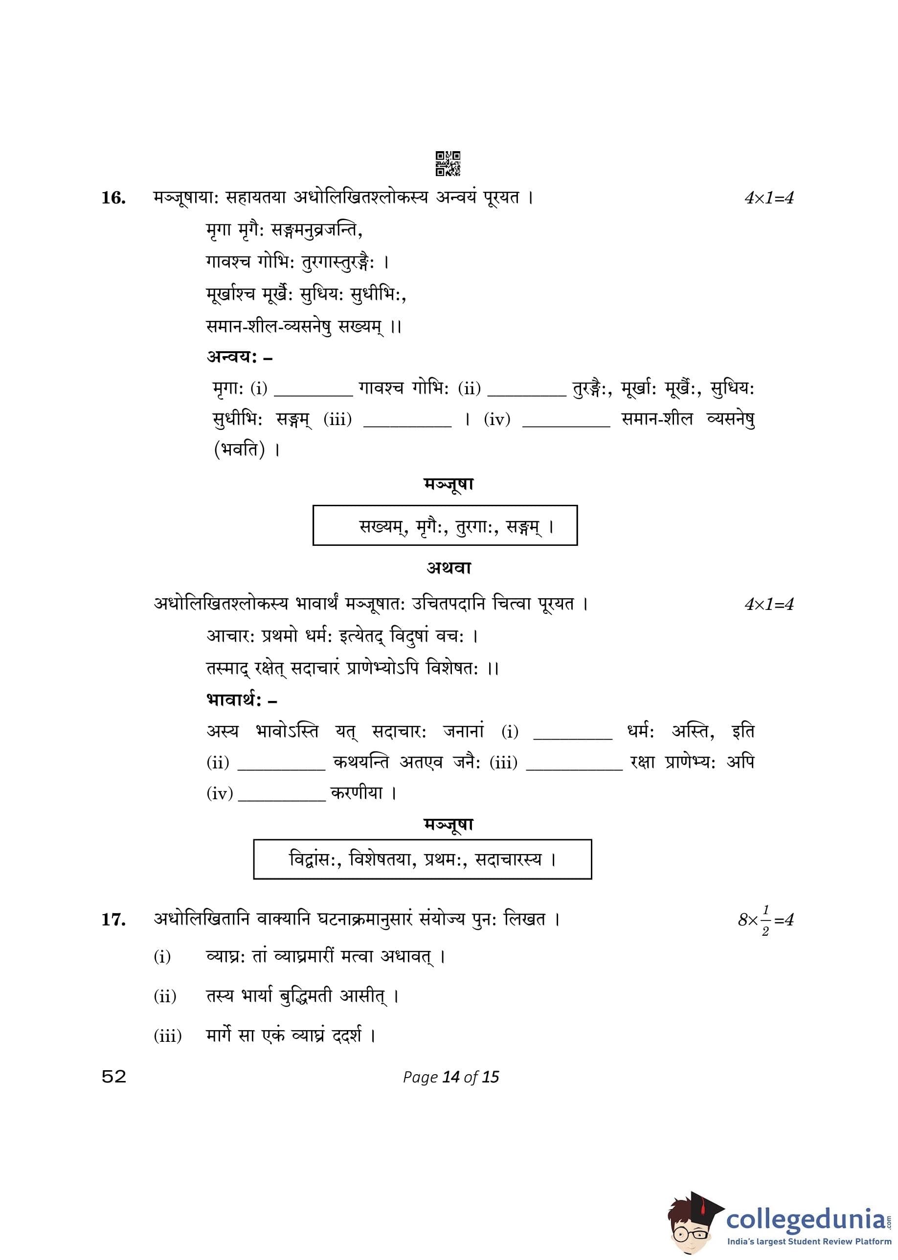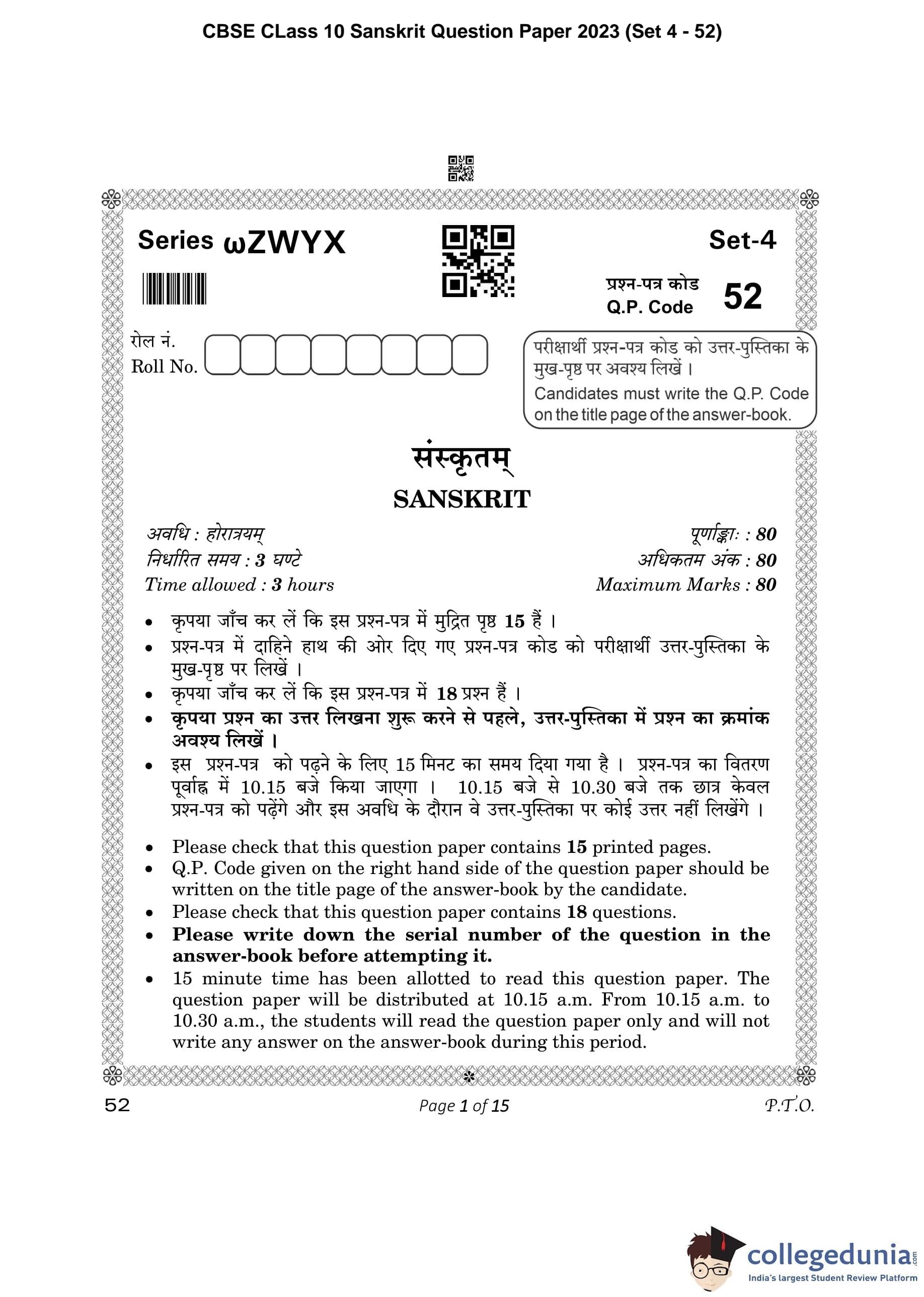 CBSE Class 10 Sanskrit Question Paper 2023 (Set 4- 52) with Answer Key pdf is available for download here. The exam was conducted by Central Board of Secondary Education on March 11, 2023. The question paper comprised a total of 18 questions divided among 4 sections.