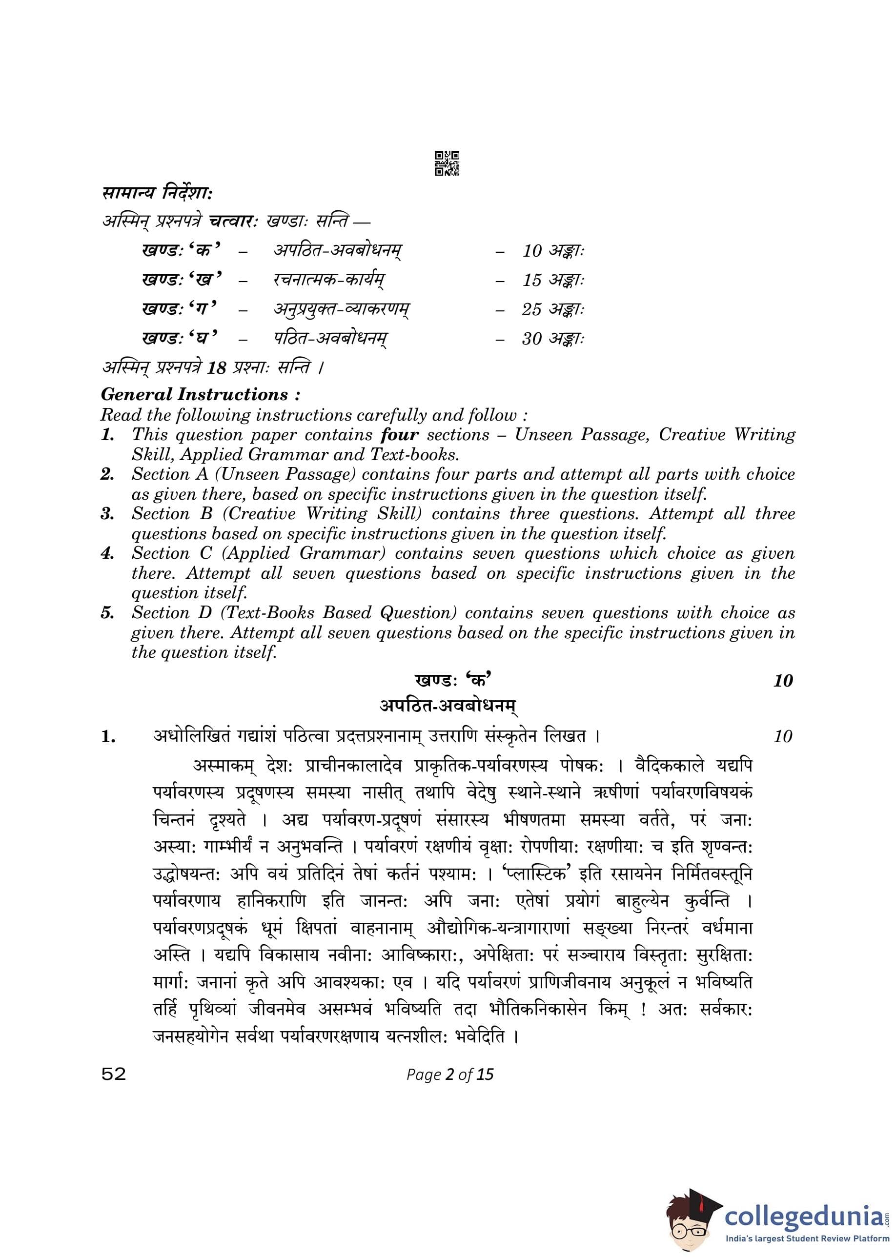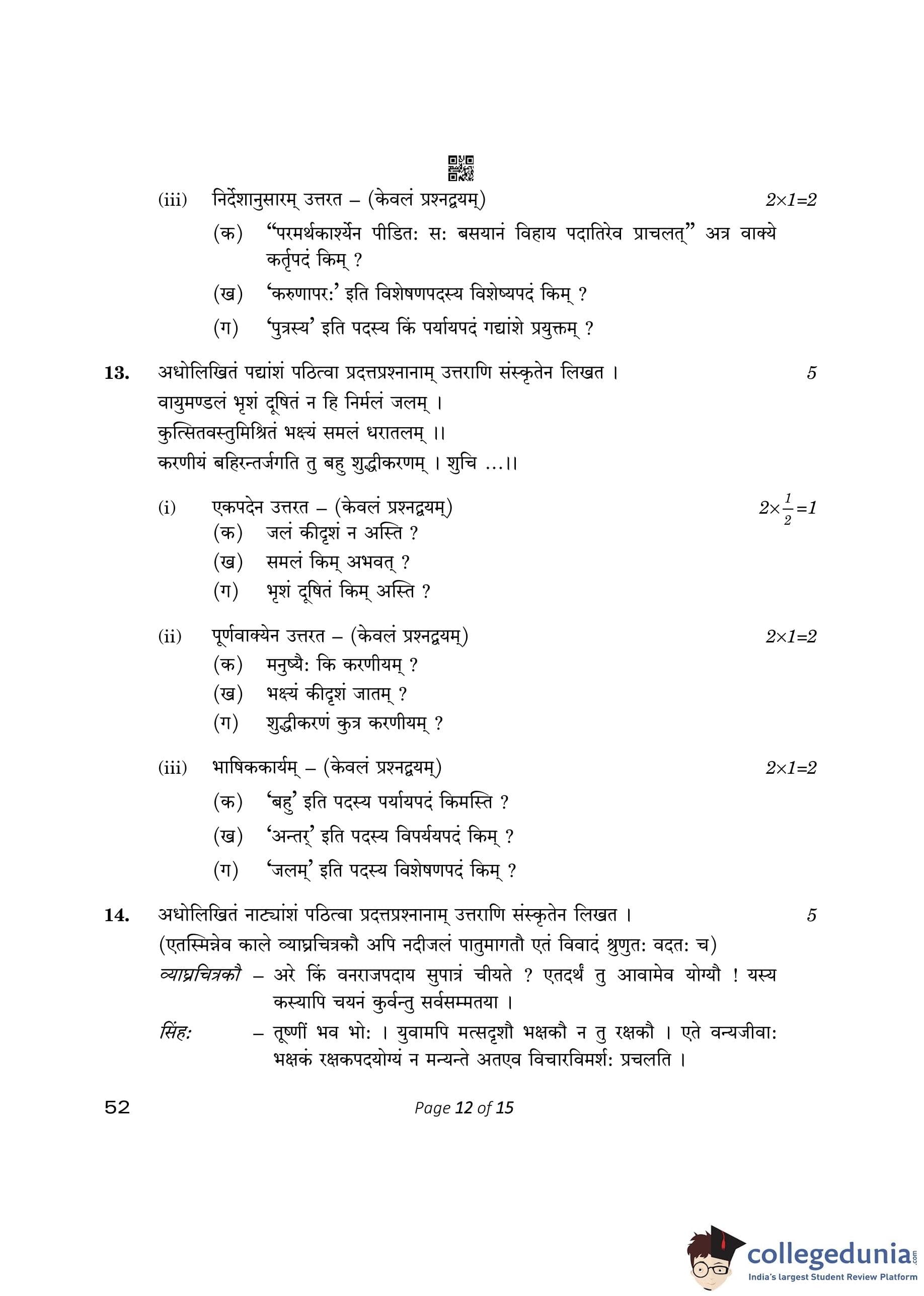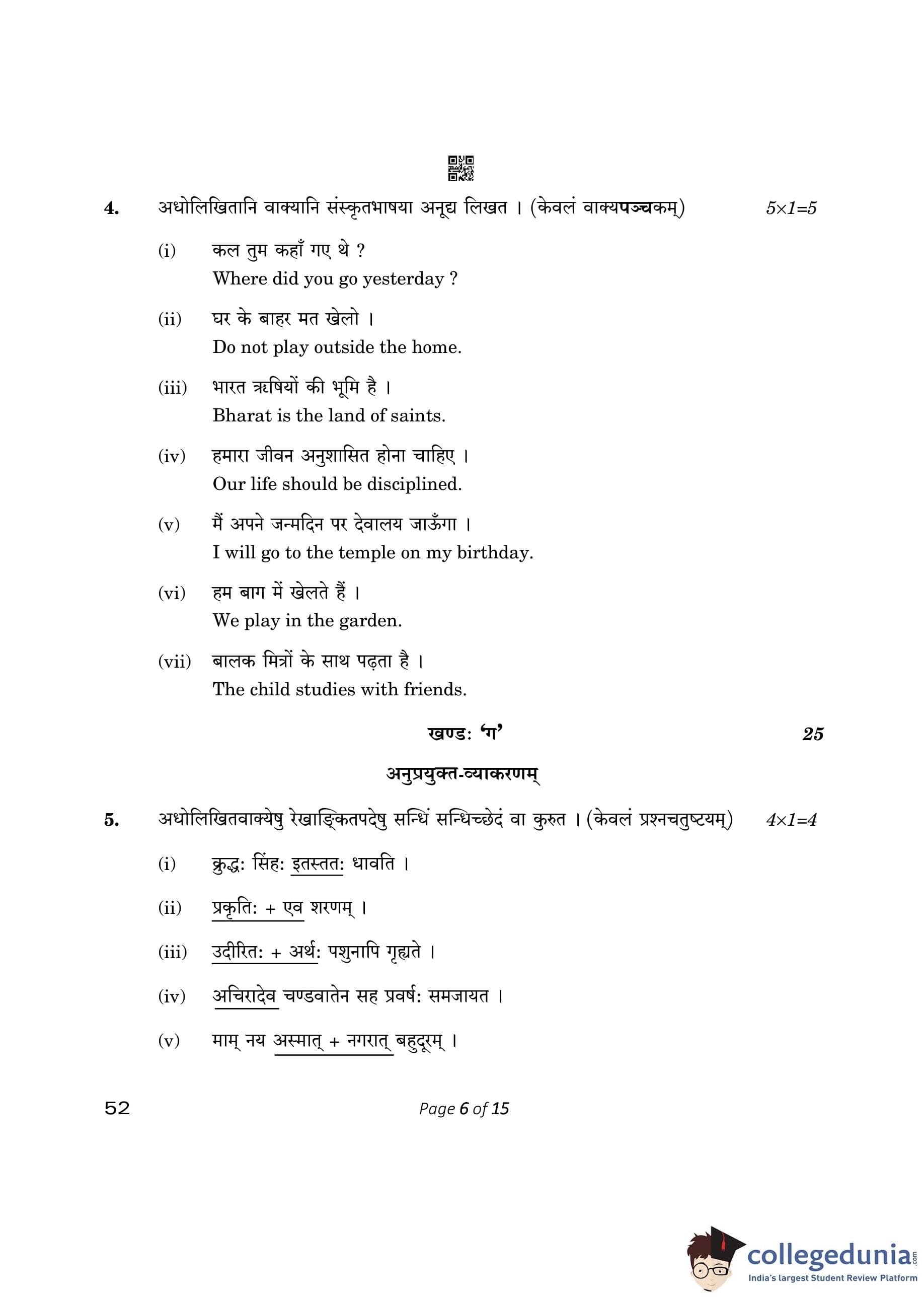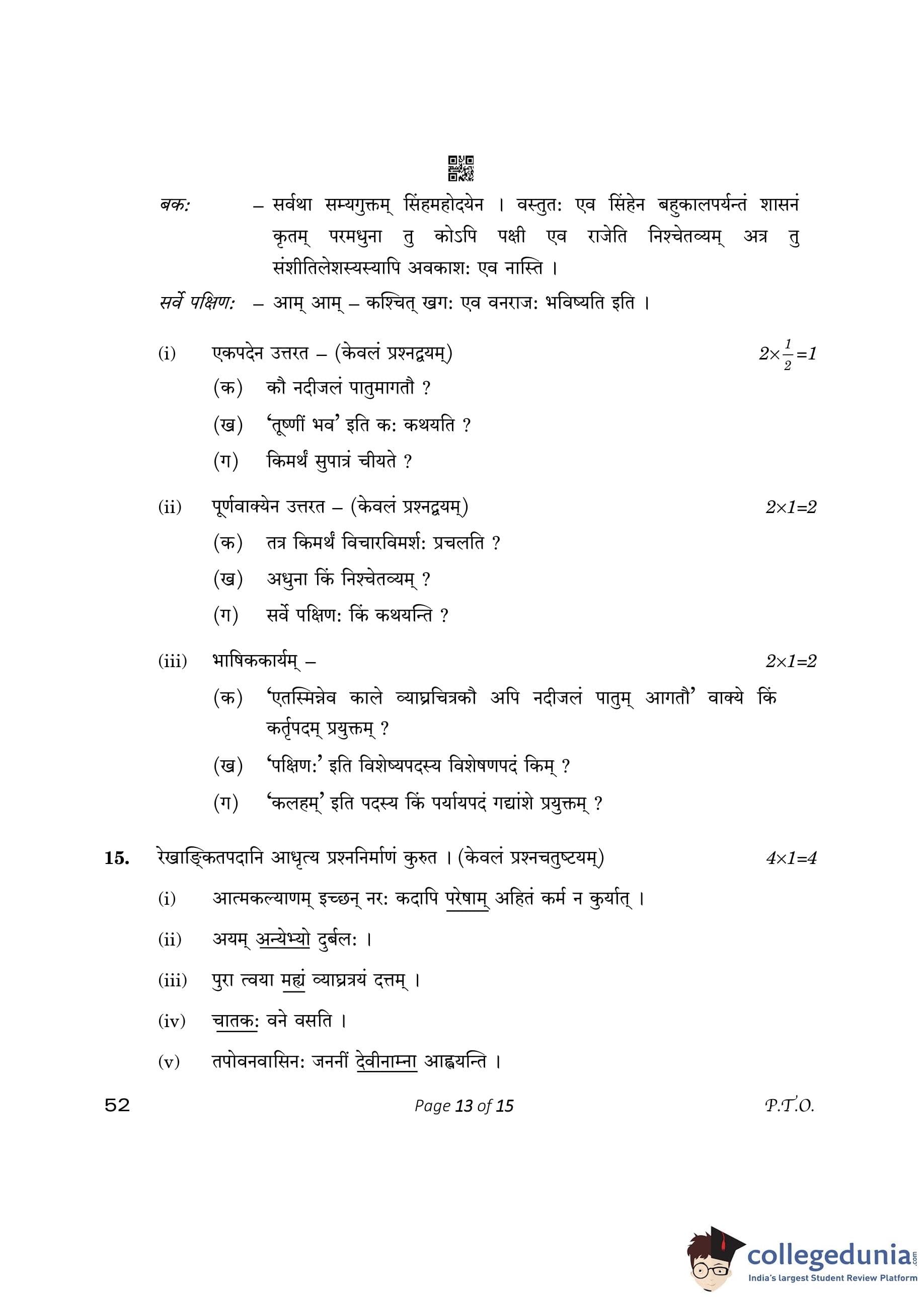 CBSE Class 10 Sanskrit Question Paper 2023 (Set 4- 52) with Answer Key pdf is available for download here. The exam was conducted by Central Board of Secondary Education on March 11, 2023. The question paper comprised a total of 18 questions divided among 4 sections.