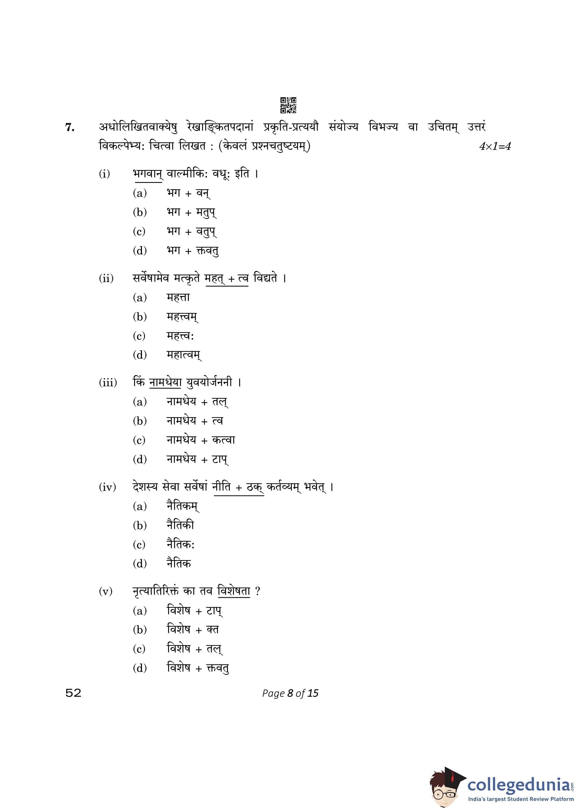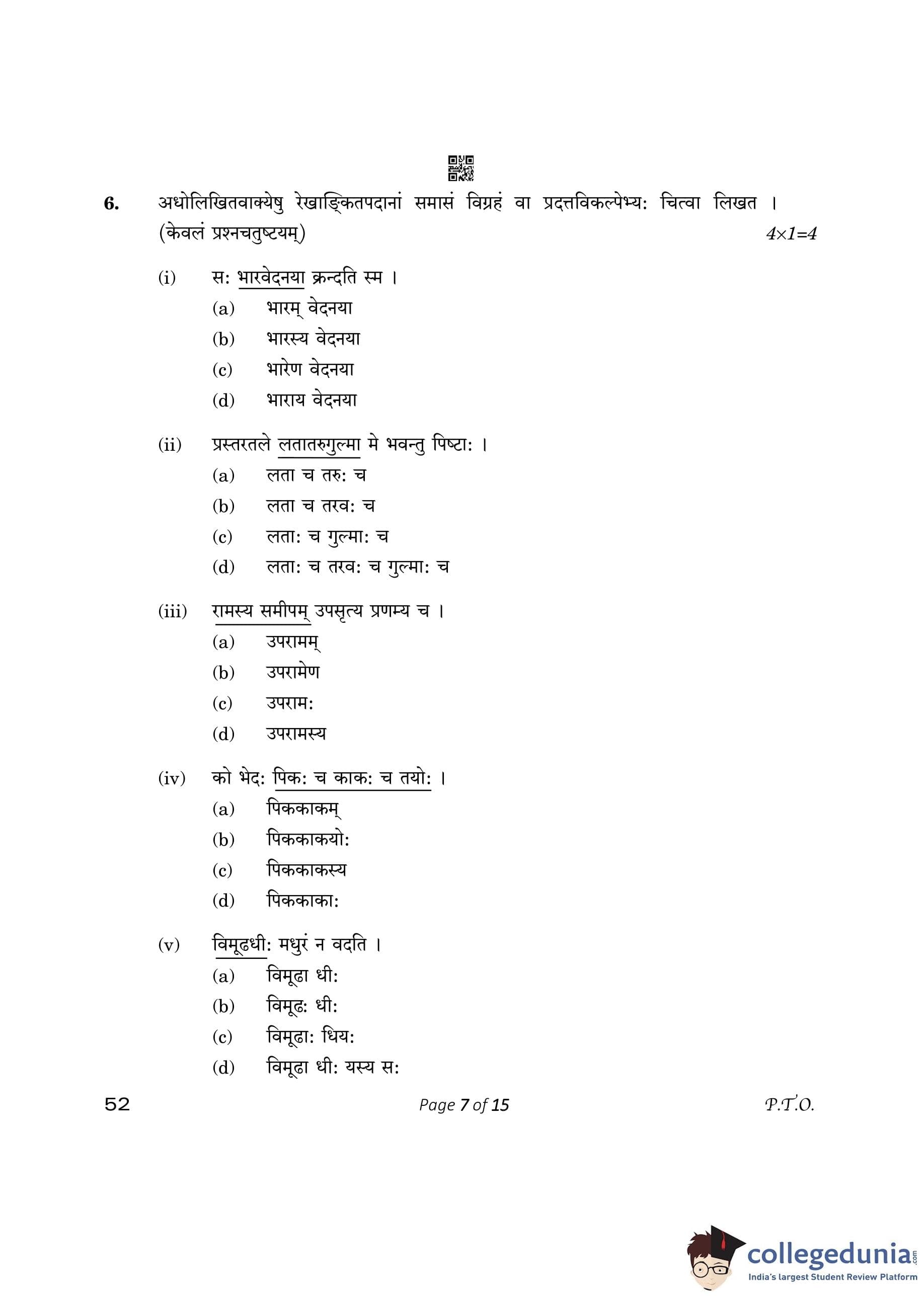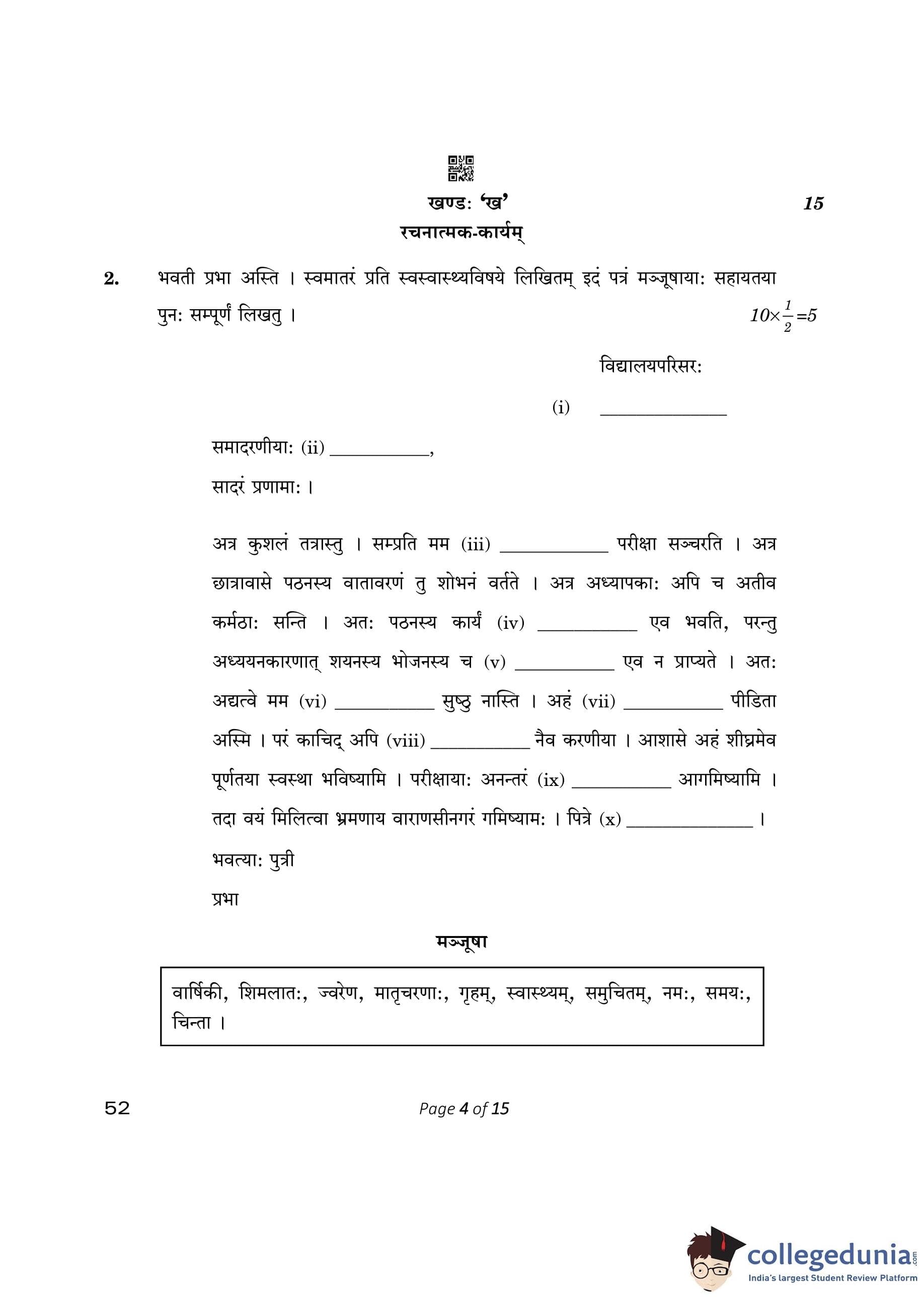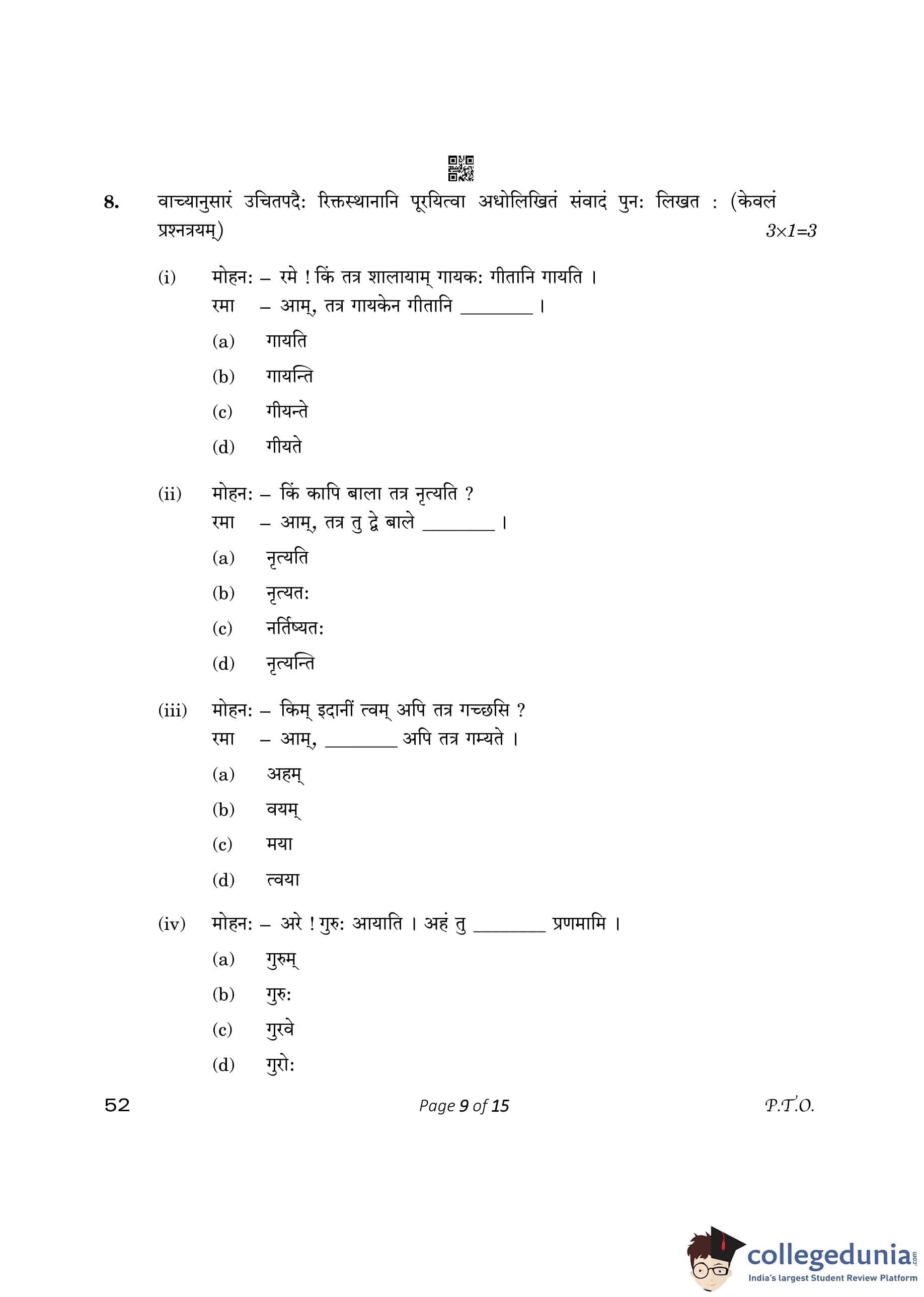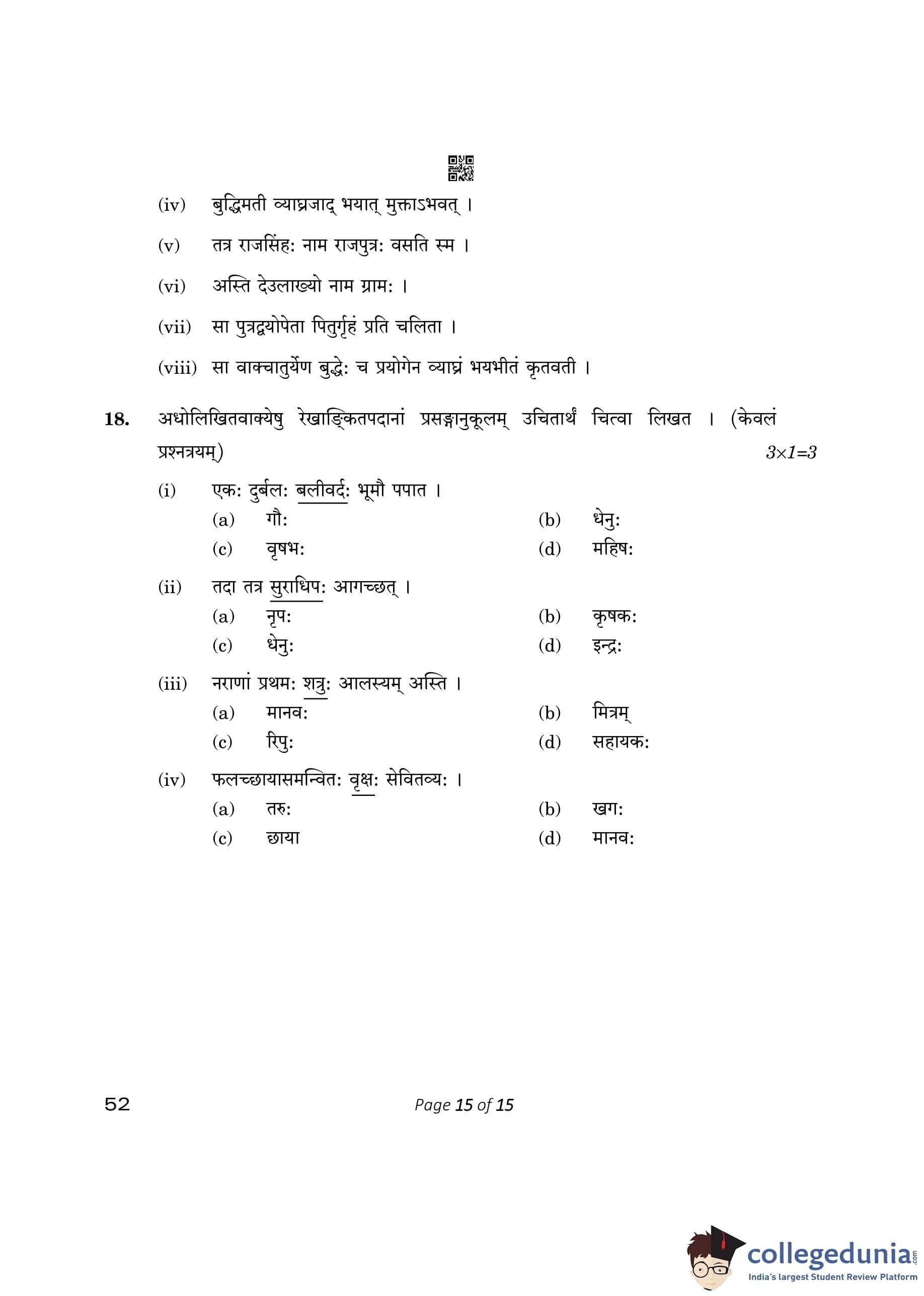 CBSE Class 10 Sanskrit Question Paper 2023 (Set 4- 52) with Answer Key pdf is available for download here. The exam was conducted by Central Board of Secondary Education on March 11, 2023. The question paper comprised a total of 18 questions divided among 4 sections.
