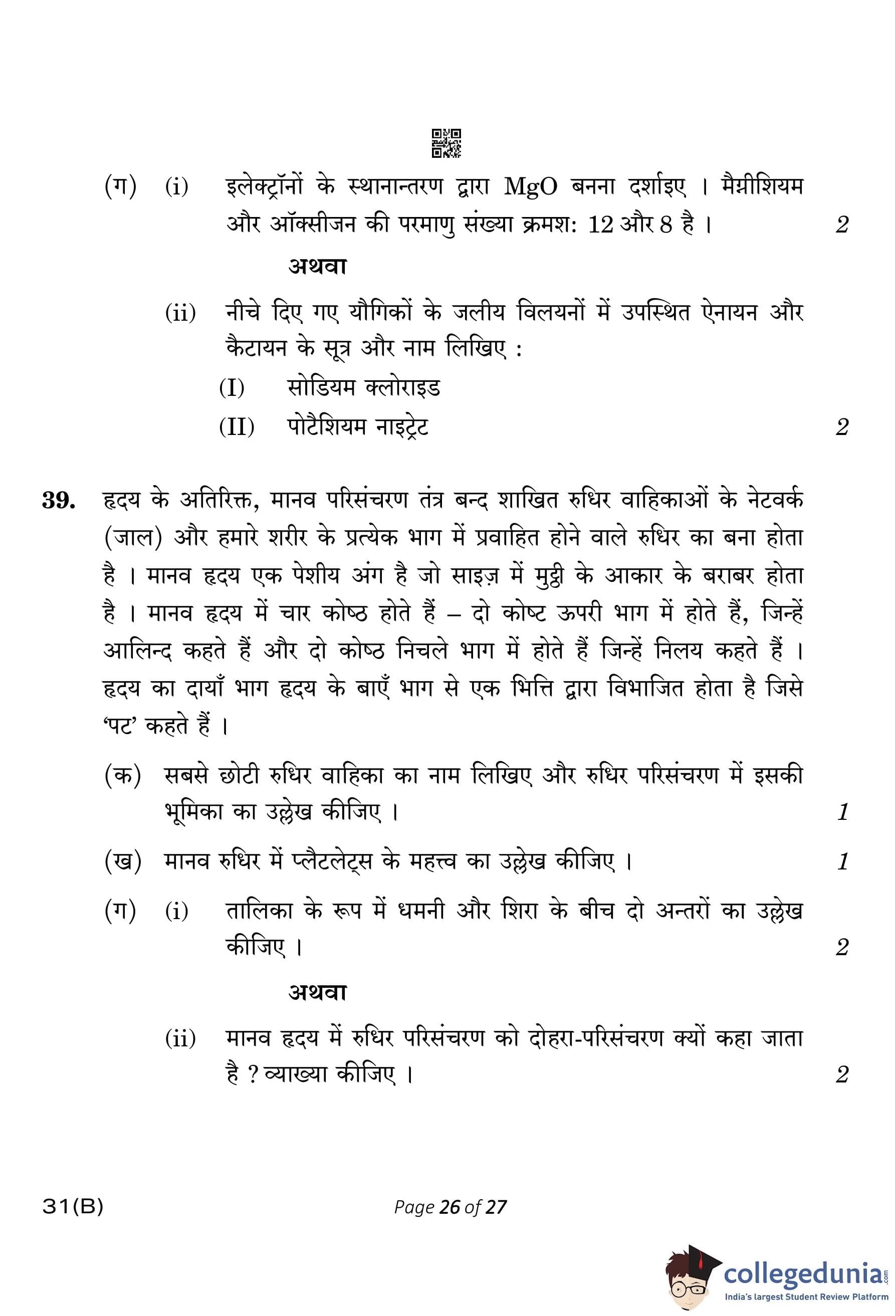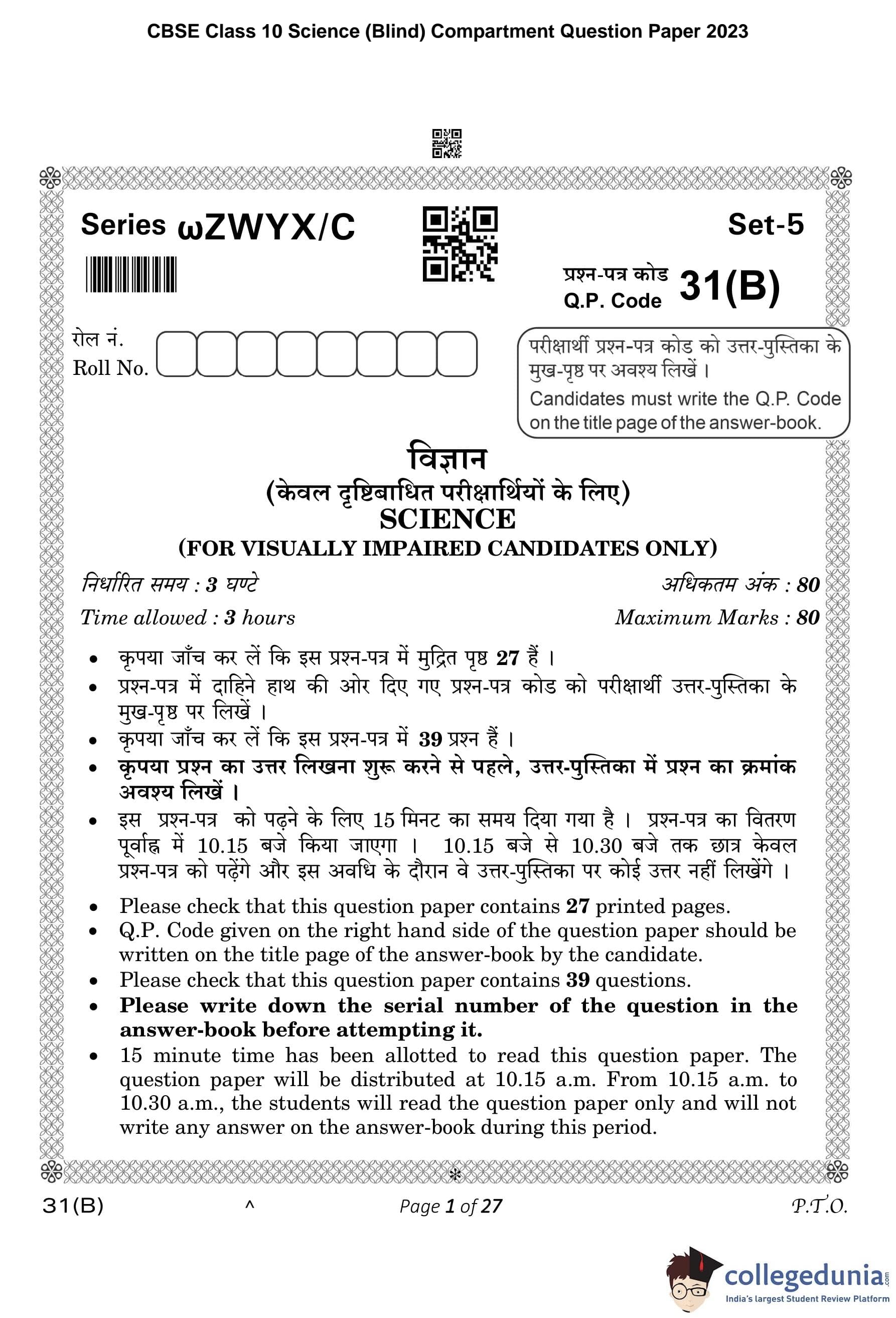 CBSE Class 10 Science (Blind) Compartment Question Paper 2023 with Answer Key pdf is available for download here. The exam was conducted by Central Board of Secondary Education on July 20, 2023 in the Morning Session 10:30 AM to 1:30 PM. The question paper comprised a total of 39 questions divided among 5 sections.