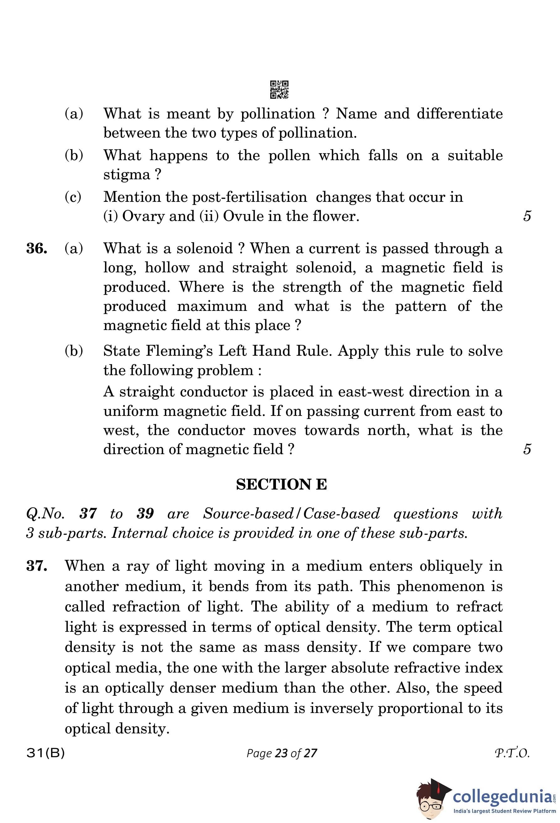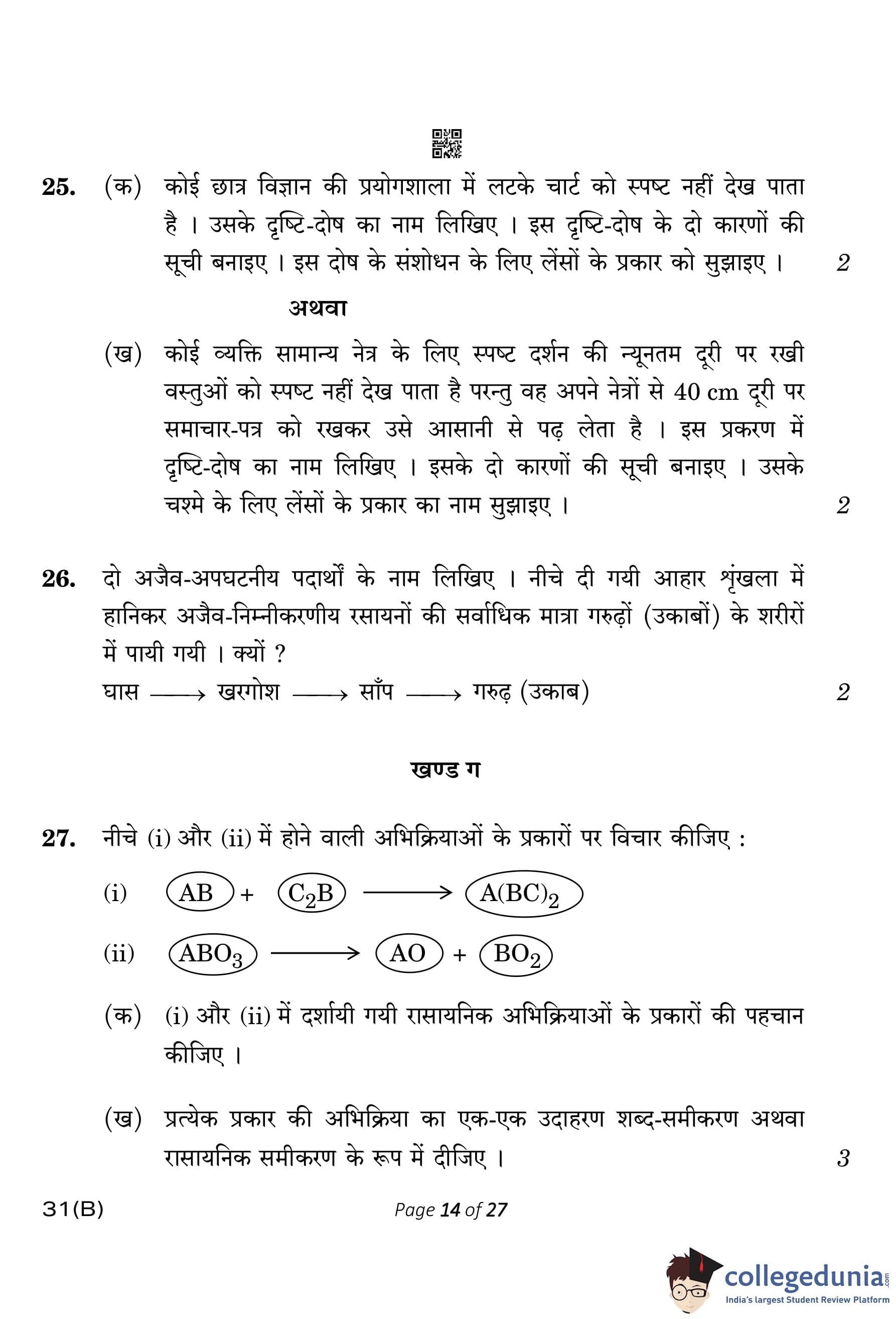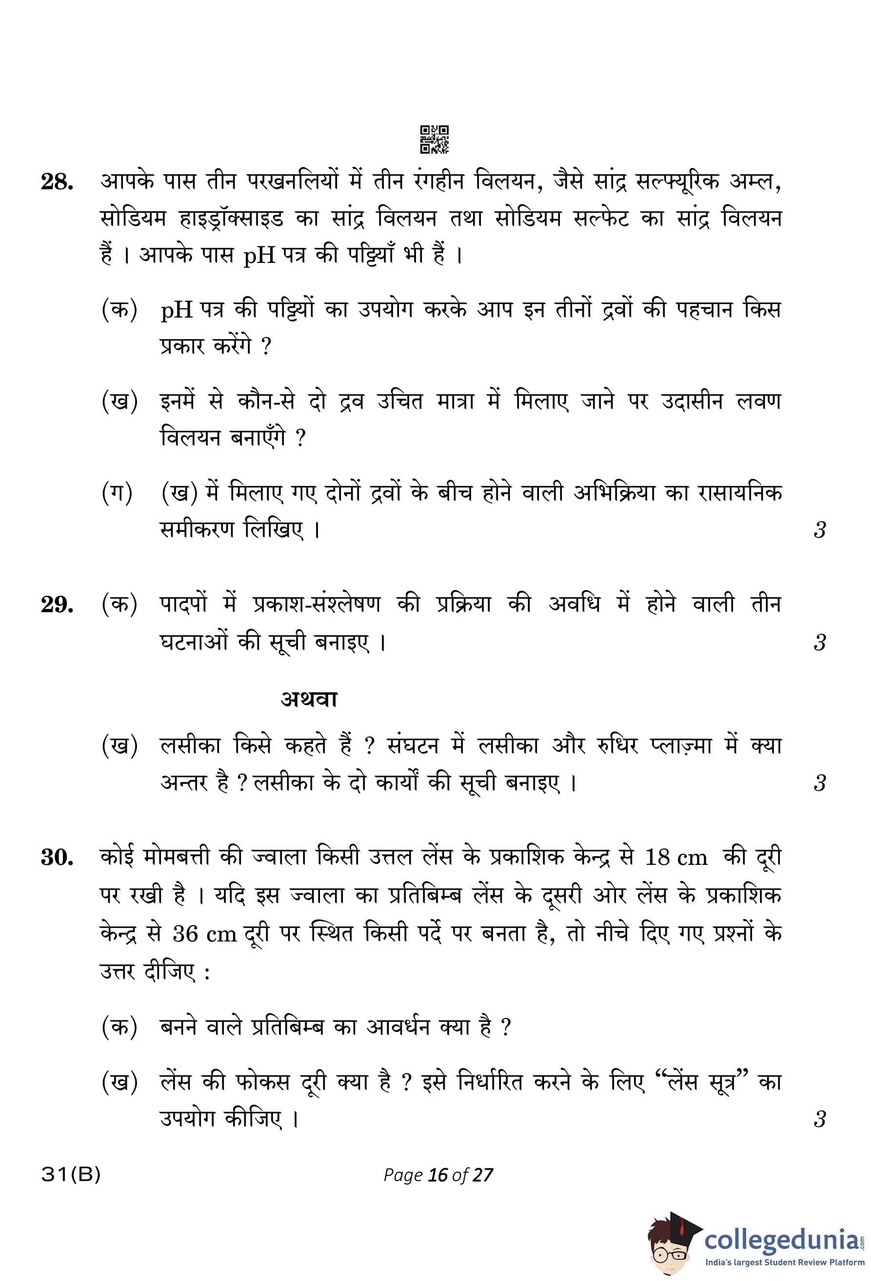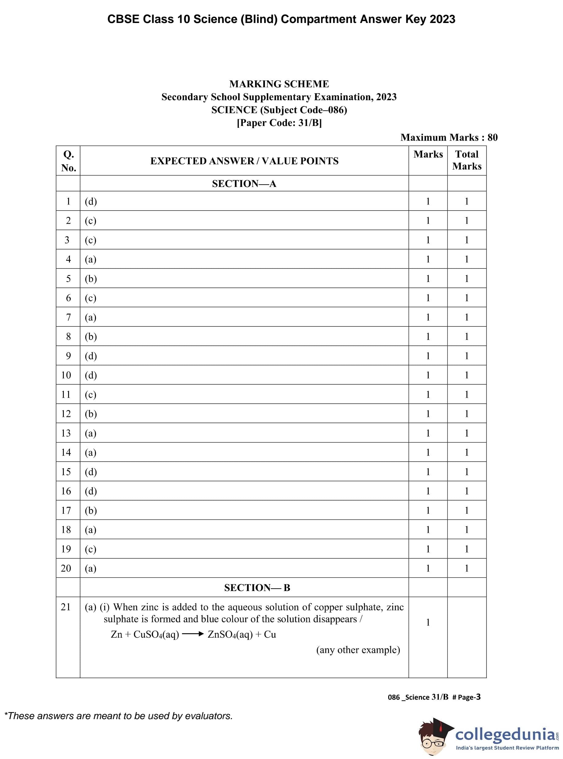 CBSE Class 10 Science (Blind) Compartment Question Paper 2023 with Answer Key