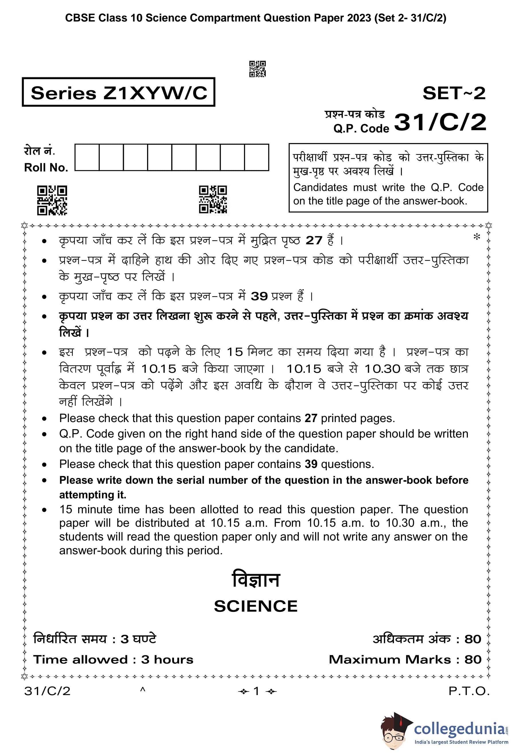 CBSE Class 10 Science Compartment Question Paper 2023 with Answer Key pdf (Set 2- 31/C/2) is available for download here. The exam was conducted by Central Board of Secondary Education on July 20, 2023 in the Morning Session 10:30 AM to 1:30 PM. The question paper comprised a total of 39 questions divided among 5 sections.