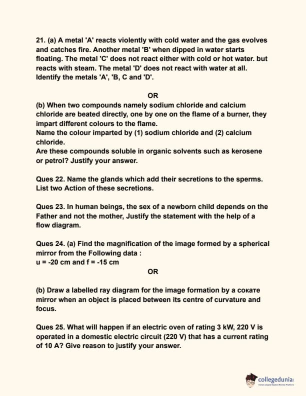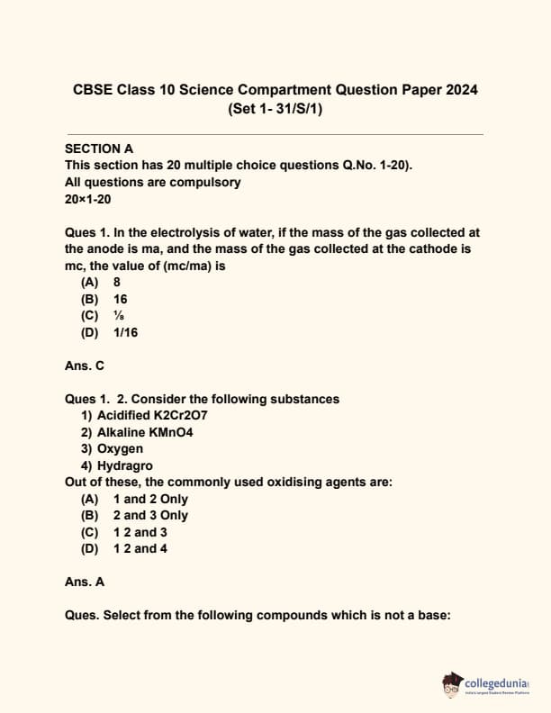 CBSE Class 10 Science (Set 1- 31/S/1) Compartment Question Paper 2024 with Answer Key