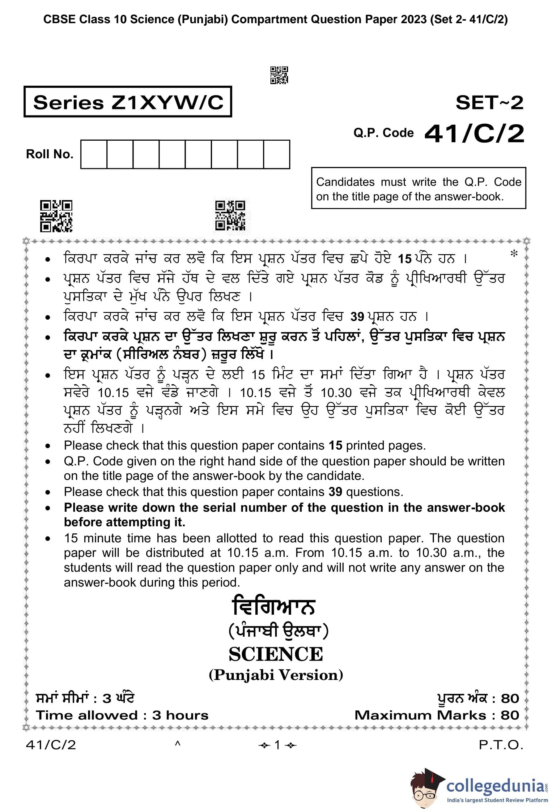 CBSE Class 10 Science (Punjabi) Compartment Question Paper 2023 with Answer Key pdf (Set 2- 41/C/2) is available for download here. The exam was conducted by Central Board of Secondary Education on July 20, 2023 in the Morning Session 10:30 AM to 1:30 PM. The question paper comprised a total of 39 questions divided among 5 sections.