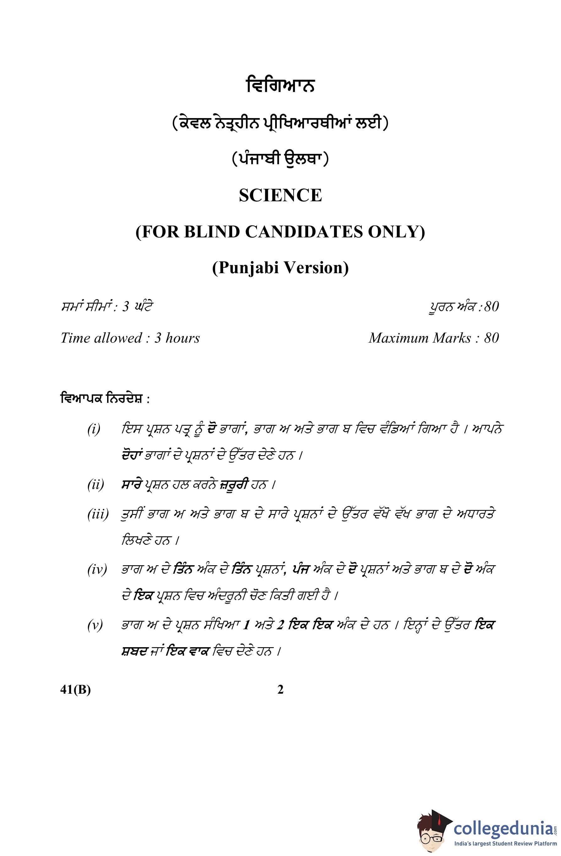 CBSE Class 10 Science Punjabi (For Blind) Question Paper 2018 with Answer Key Set 4 - 41(B) is available for download. The exam was conducted by the Central Board of Secondary Education on March 16, 2018 in the Morning Session 10:30 AM to 1:30 PM. The medium of paper was Punjabi. The question paper comprised a total of 27 questions divided among 2 sections.