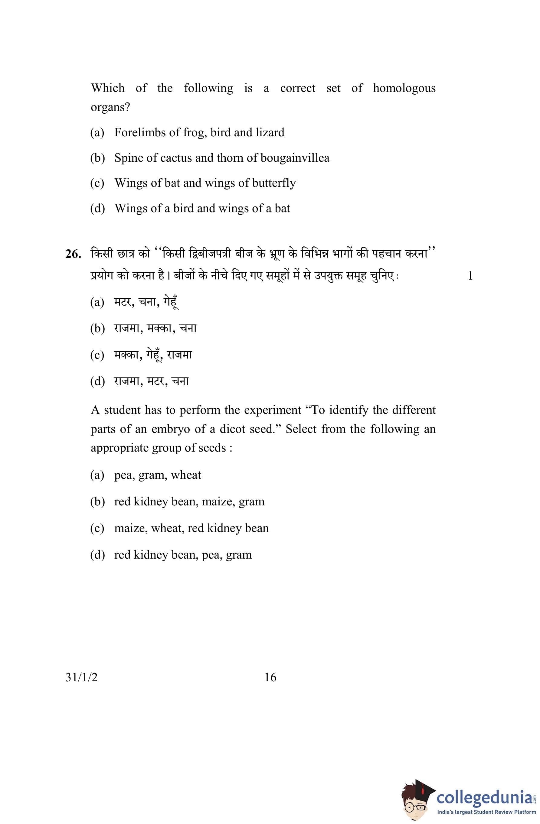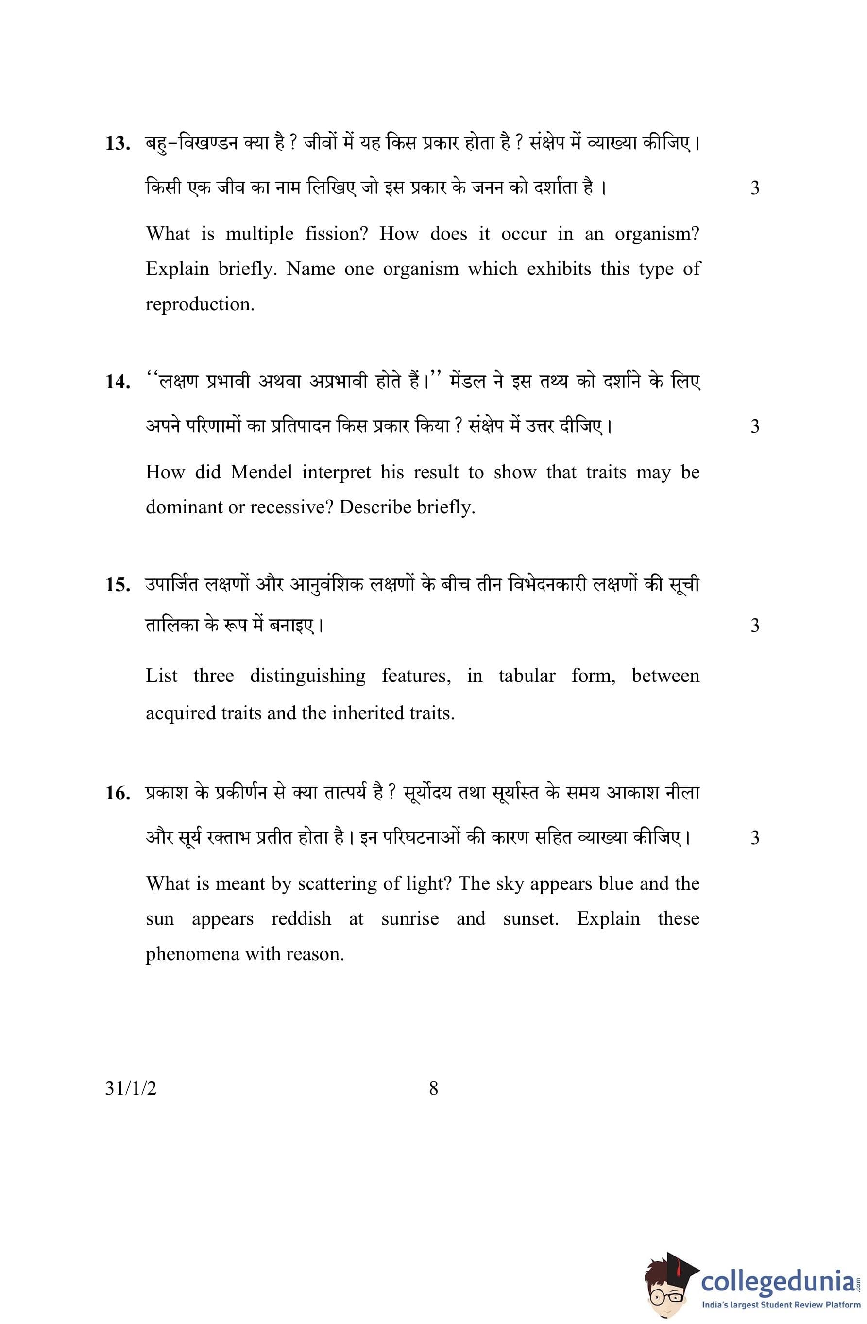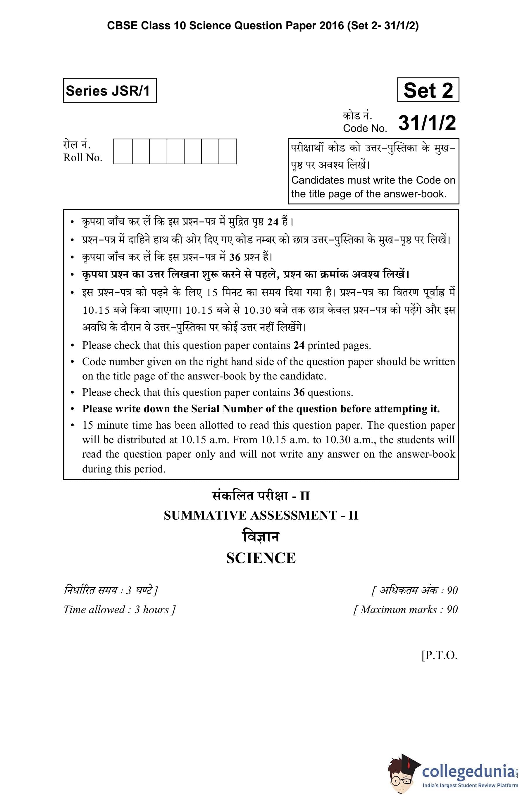 CBSE Class 10 Science Question Paper 2016 with Answer Key Set 2- 31/1/2 is available for download. The exam was conducted by the Central Board of Secondary Education on March 2, 2016 in the Morning Session 10:30 AM to 1:30 PM. The medium of paper was English and Hindi. The question paper comprised a total of 36 questions divided among 2 sections.