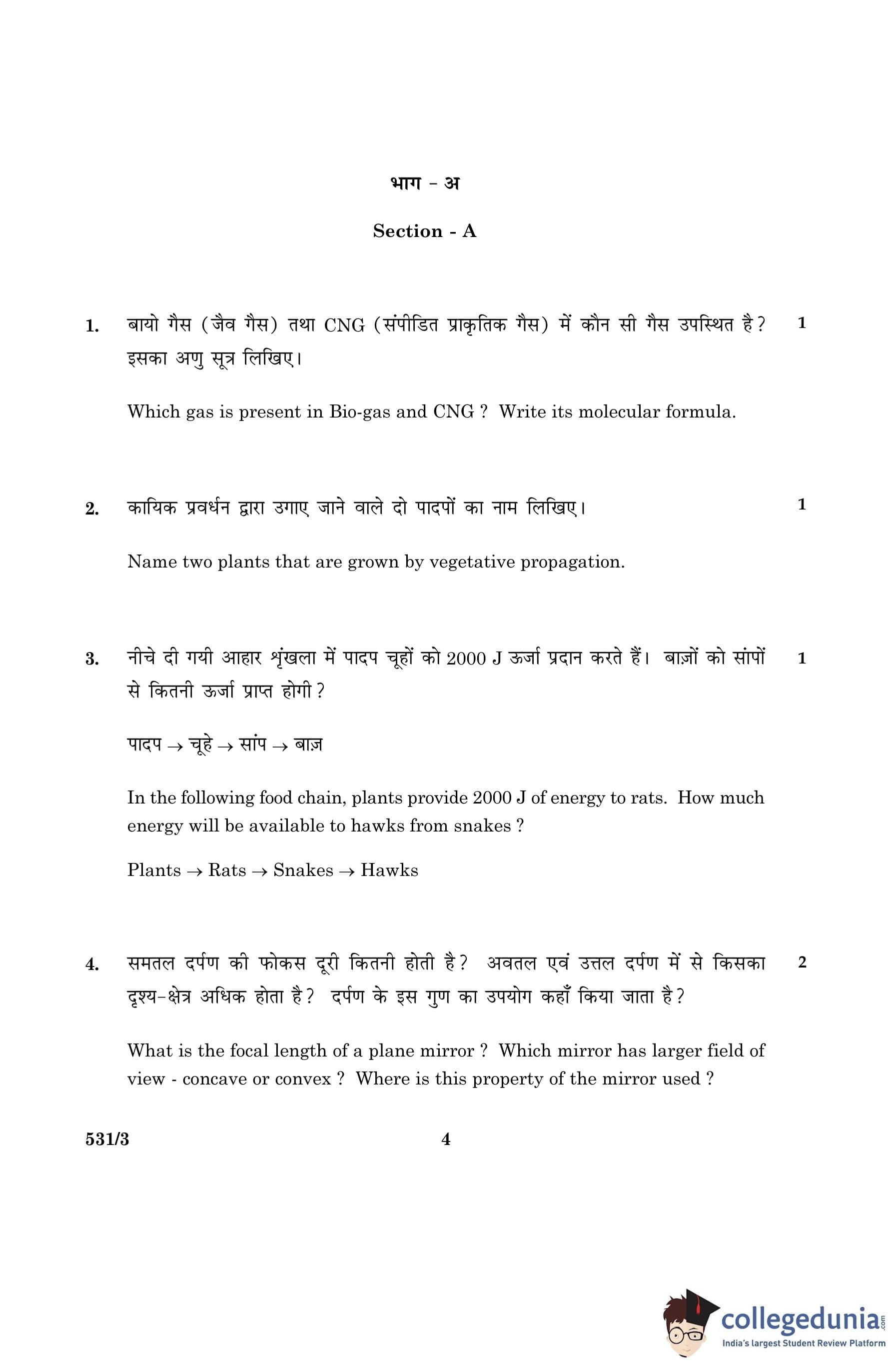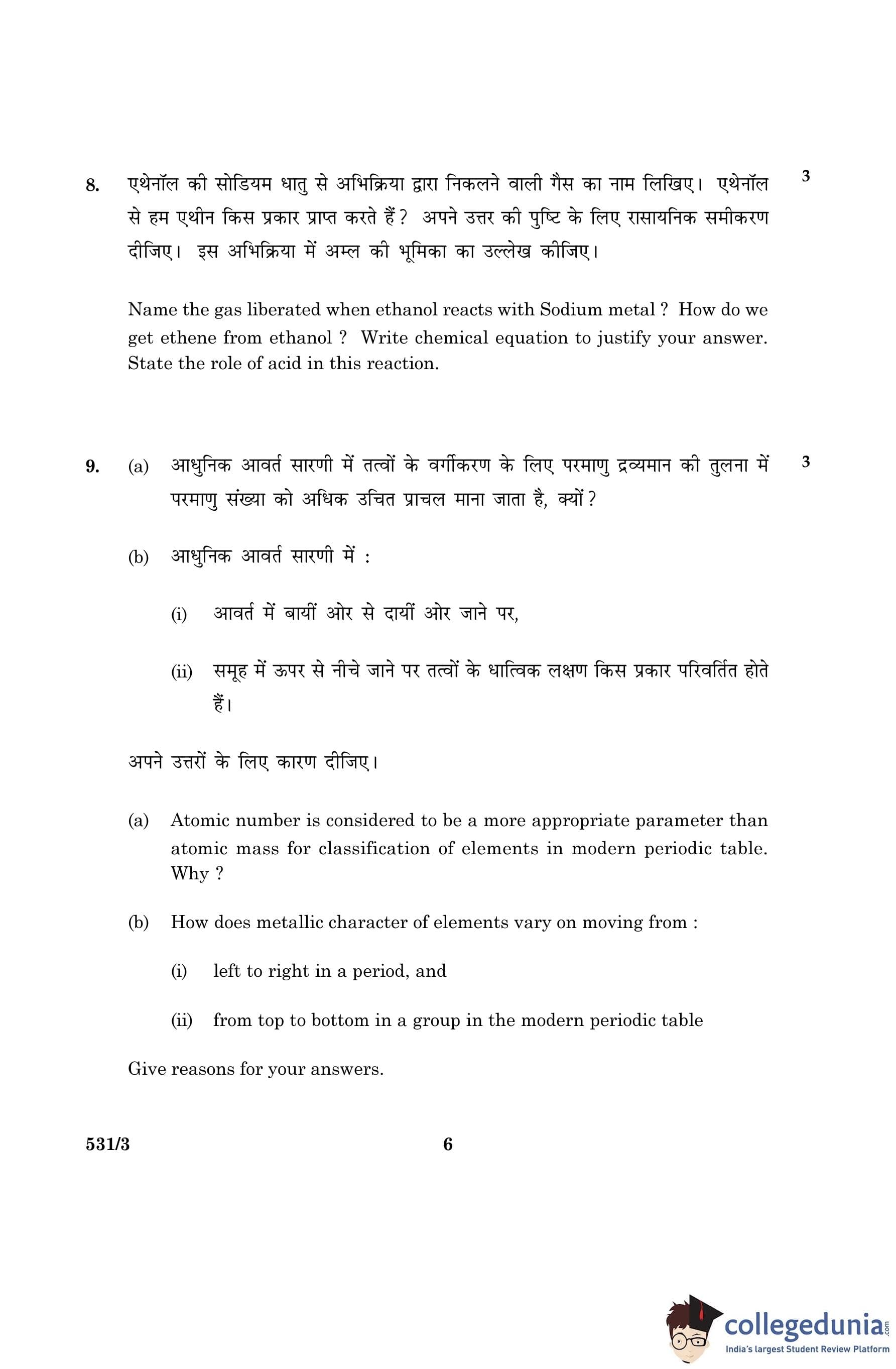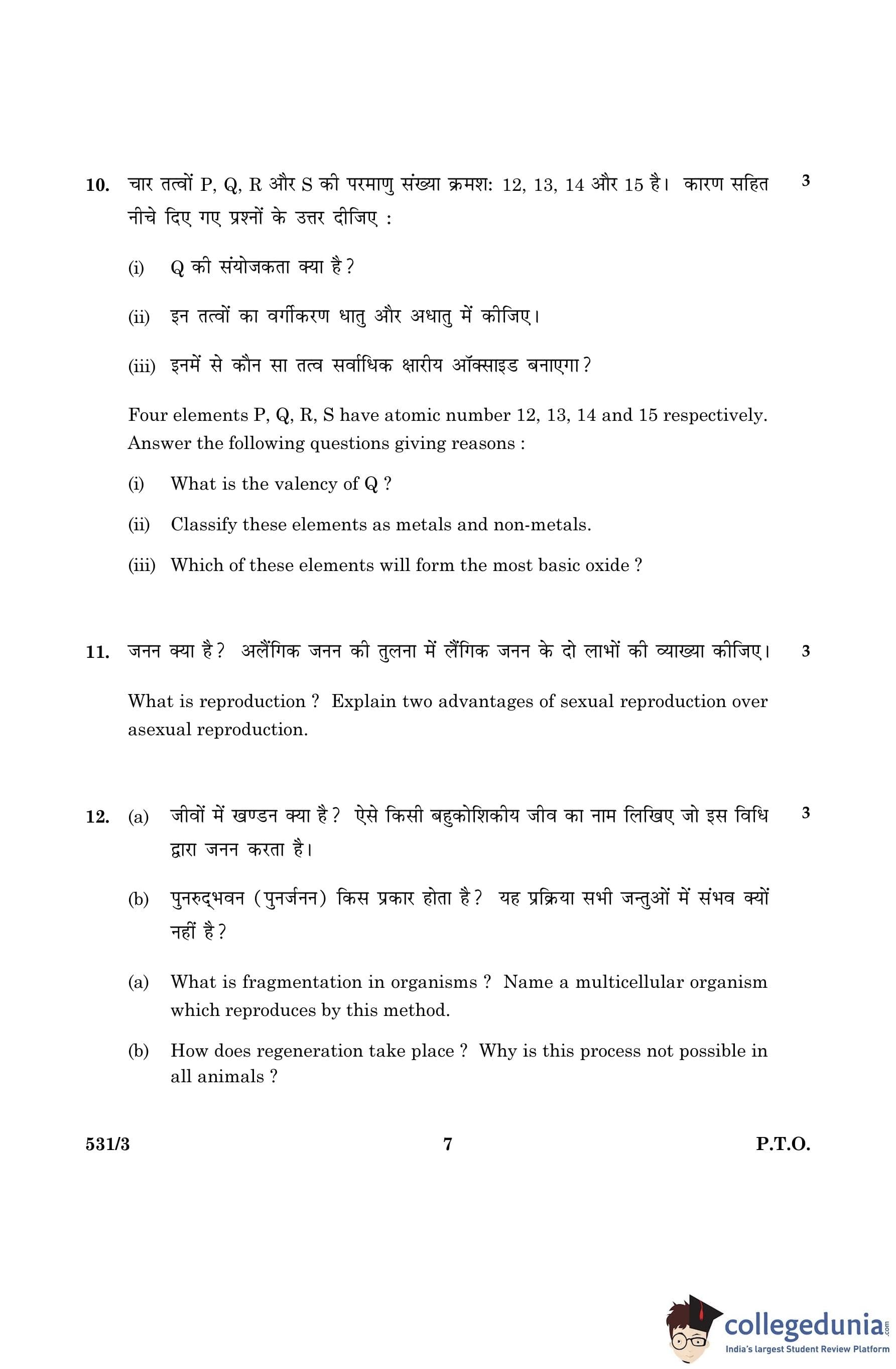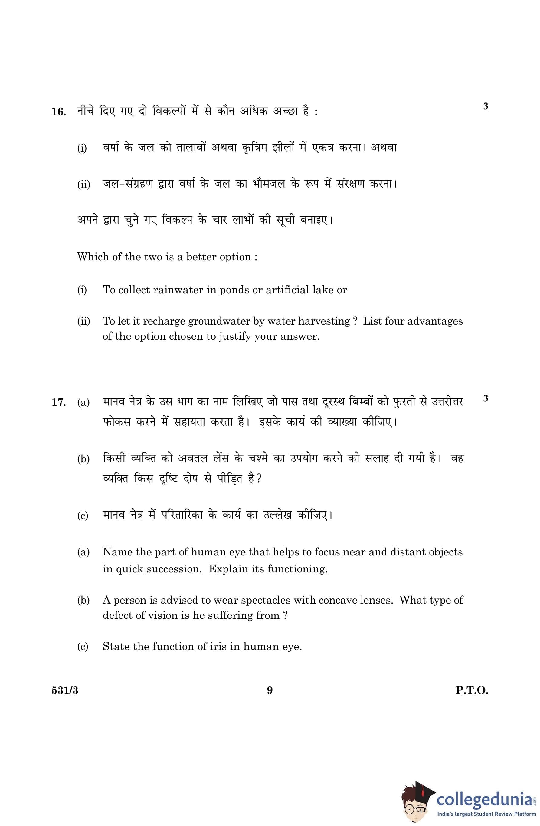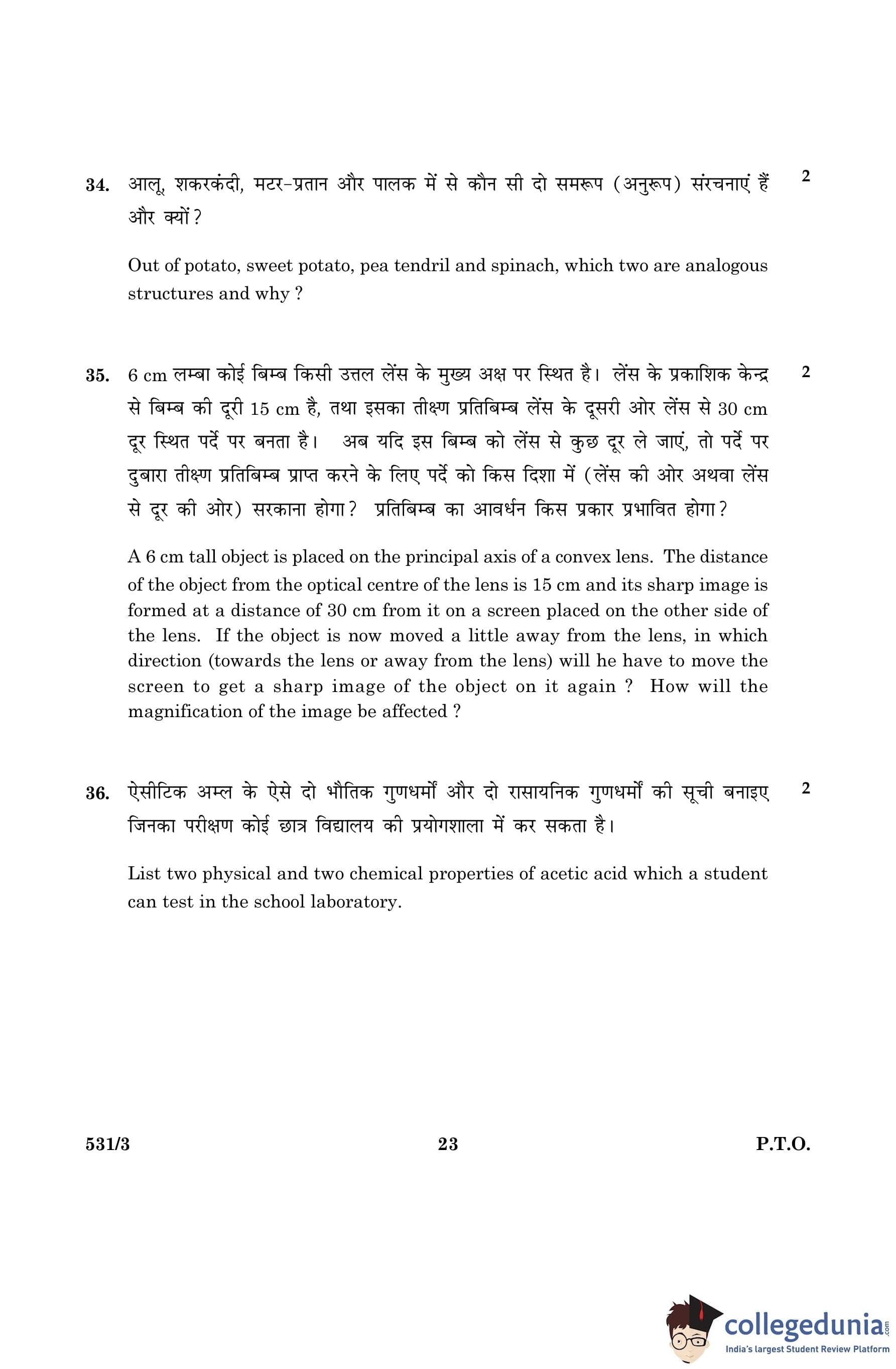 CBSE Class 10 Science Question Paper 2016 with Answer Key Set 3- 531/3 is available for download. The exam was conducted by the Central Board of Secondary Education on March 2, 2016 in the Morning Session 10:30 AM to 1:30 PM. The medium of paper was English and Hindi. The question paper comprised a total of 36 questions divided among 2 sections.