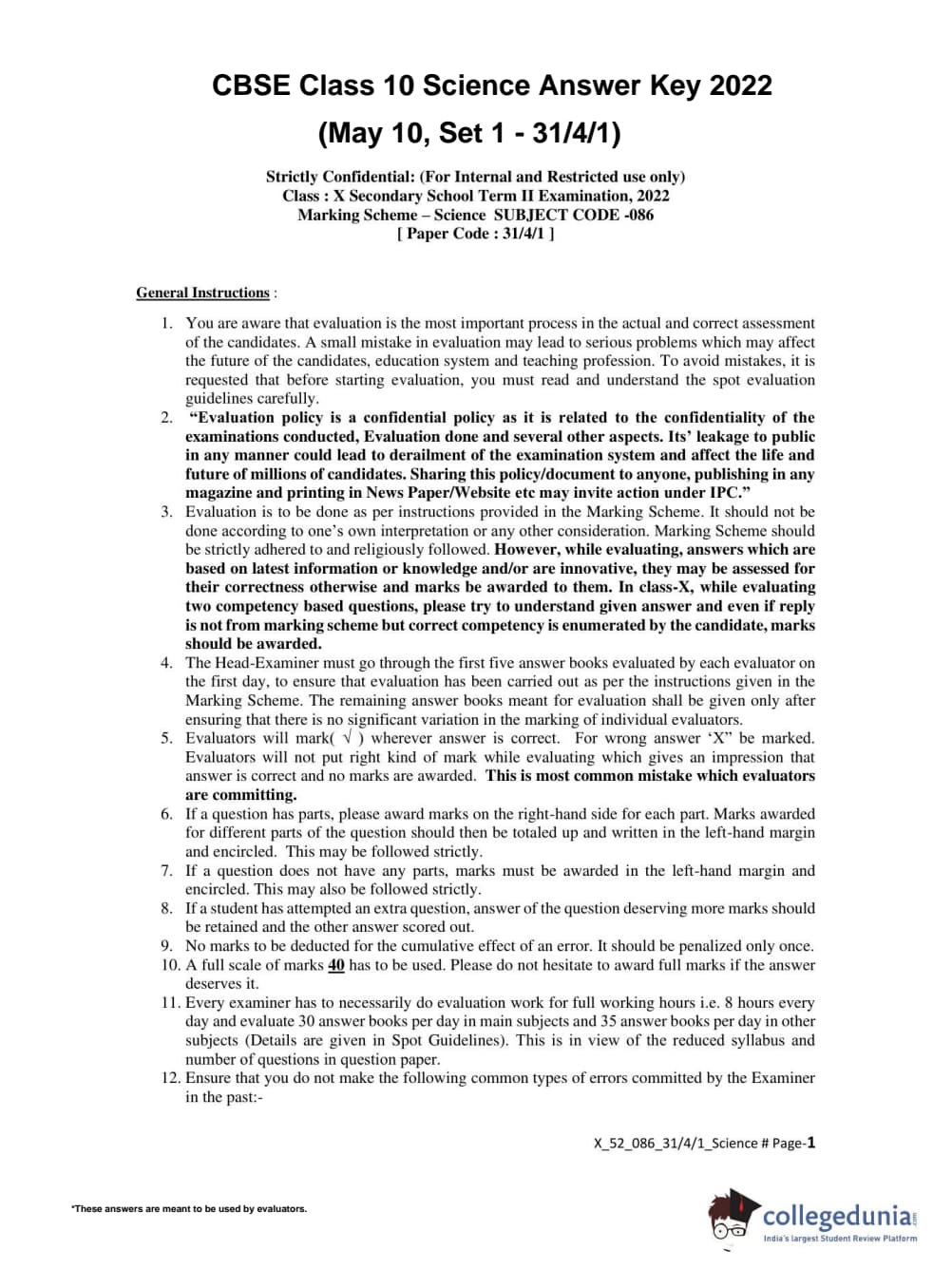 | CBSE Class 10 Science Question Paper 2022 PDF | CBSE Class 10 Science Answer Key 2022 PDF | Detailed Solutions |