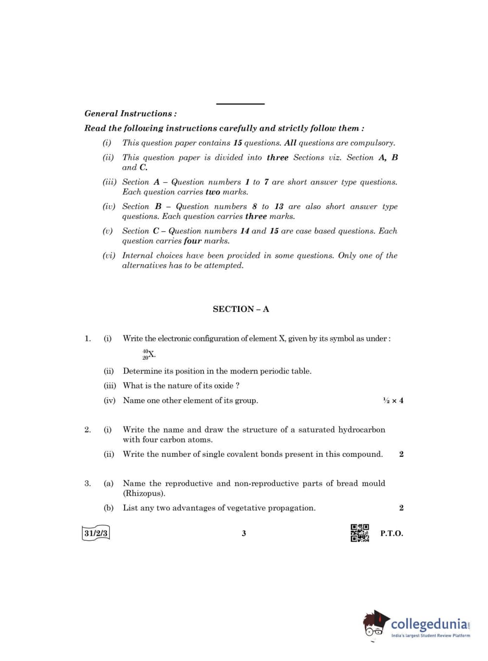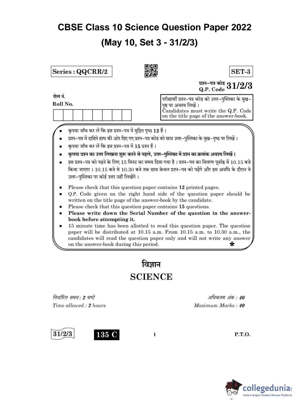 CBSE Class 10 Science Question Paper 2022 with Answer Key Set 3 - 31/2/3 is available for download. The exam was conducted by the Central Board of Secondary Education on May 10, 2022 in the Morning Session 10:30 AM to 12:30 PM. The medium of paper was English & Hindi. The question paper comprised a total of 15 questions divided among 3 sections.