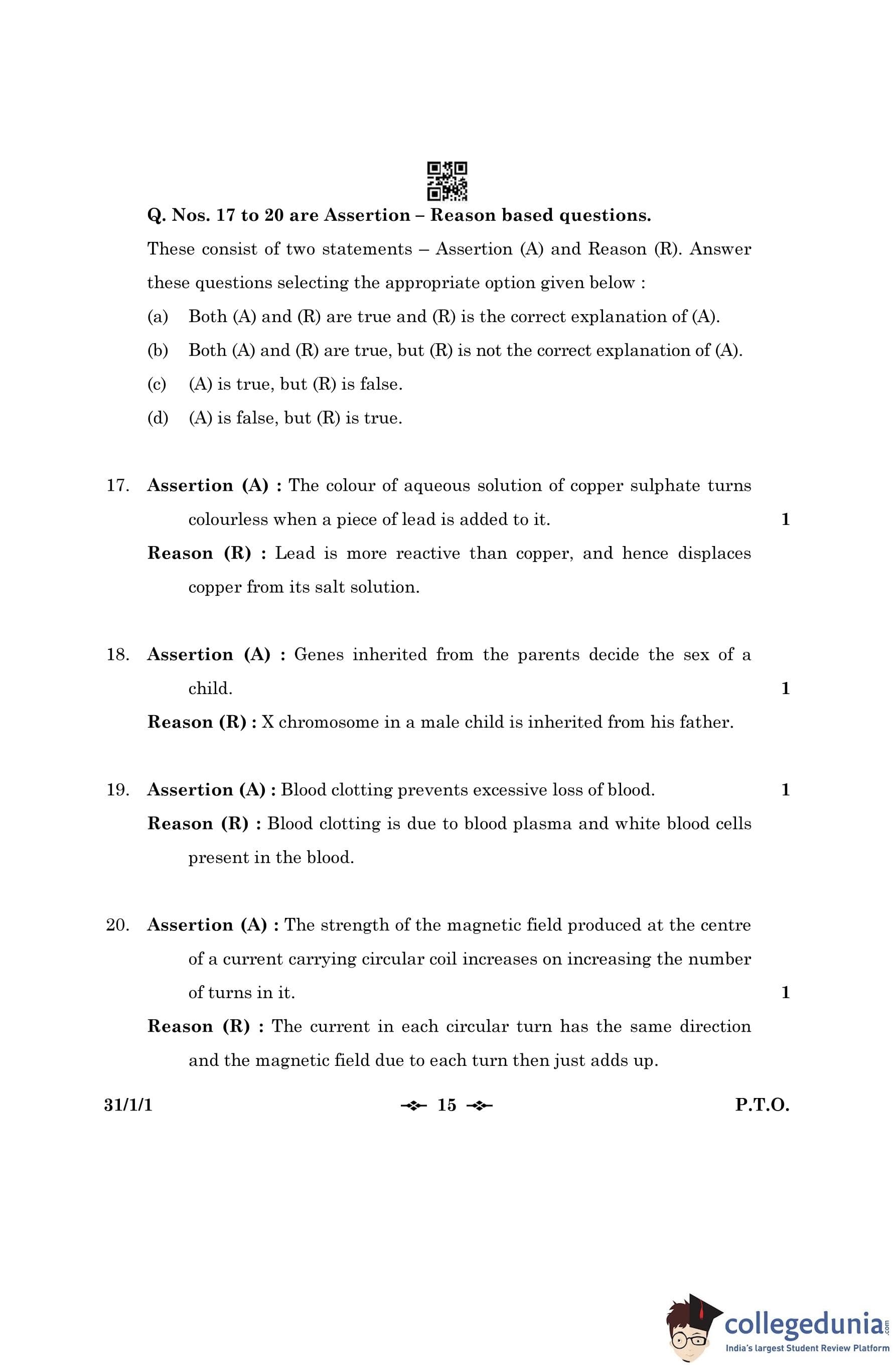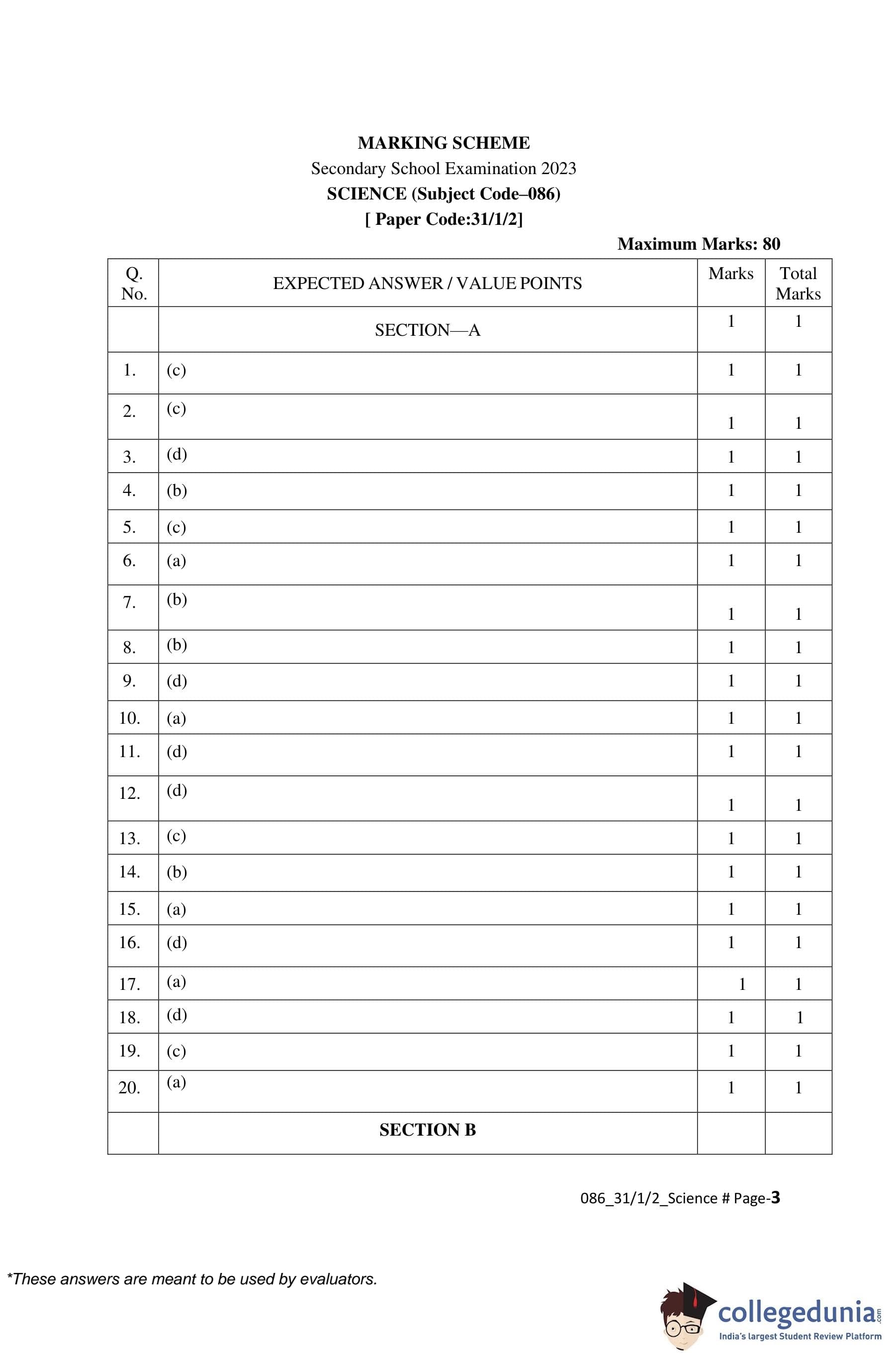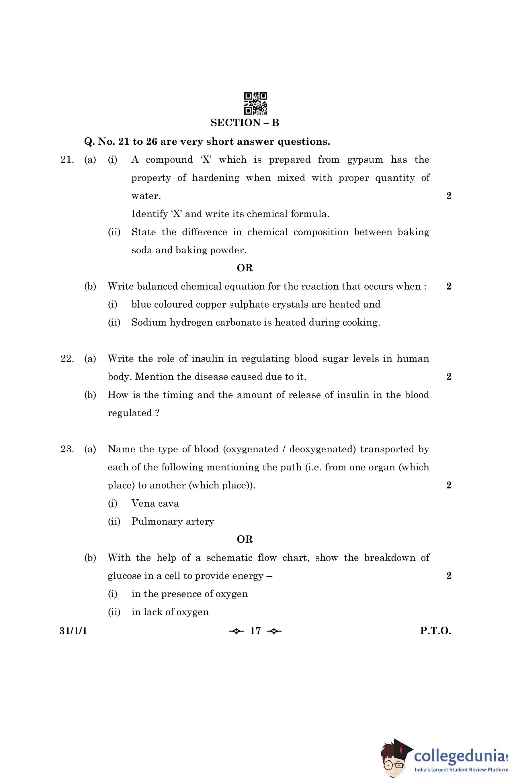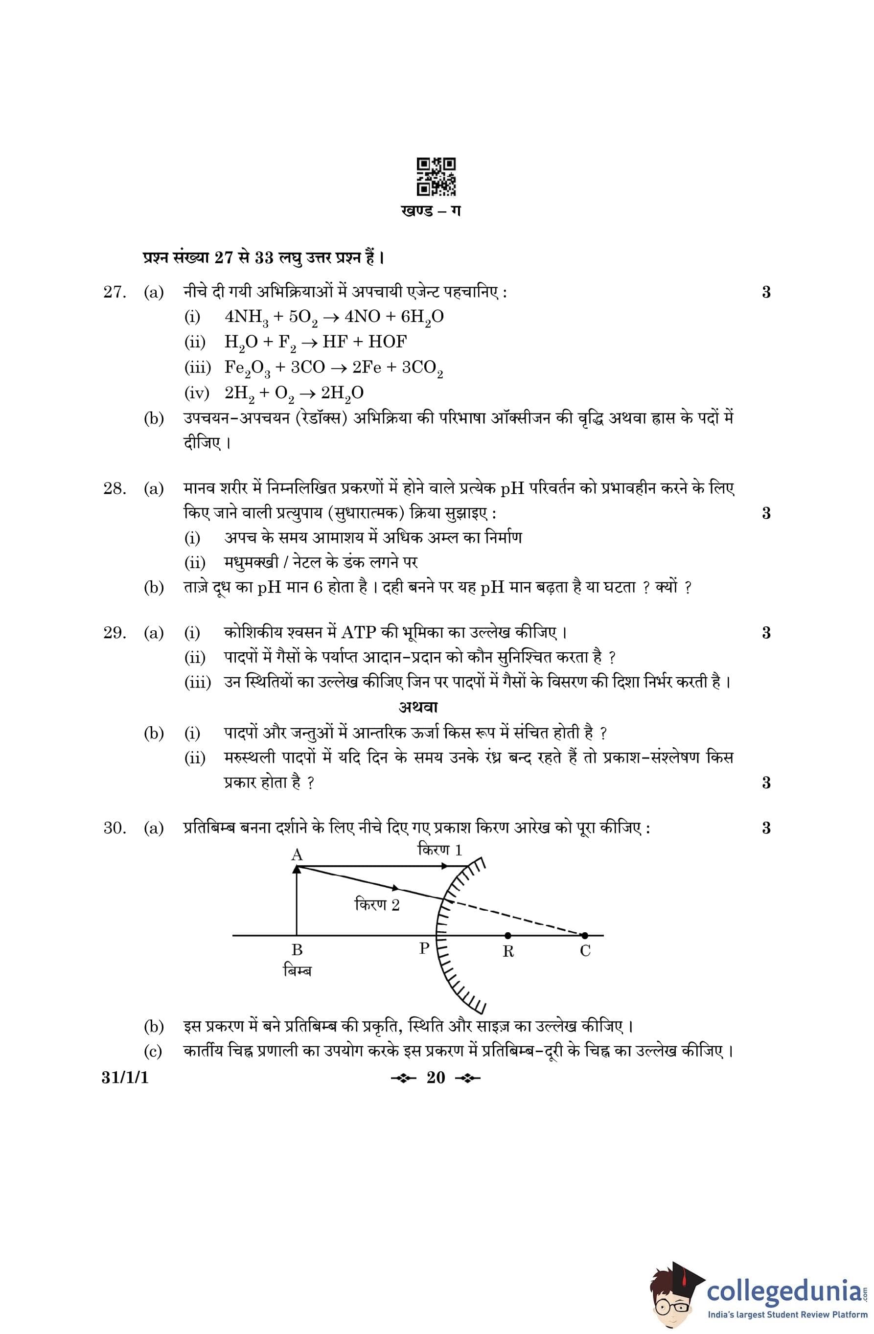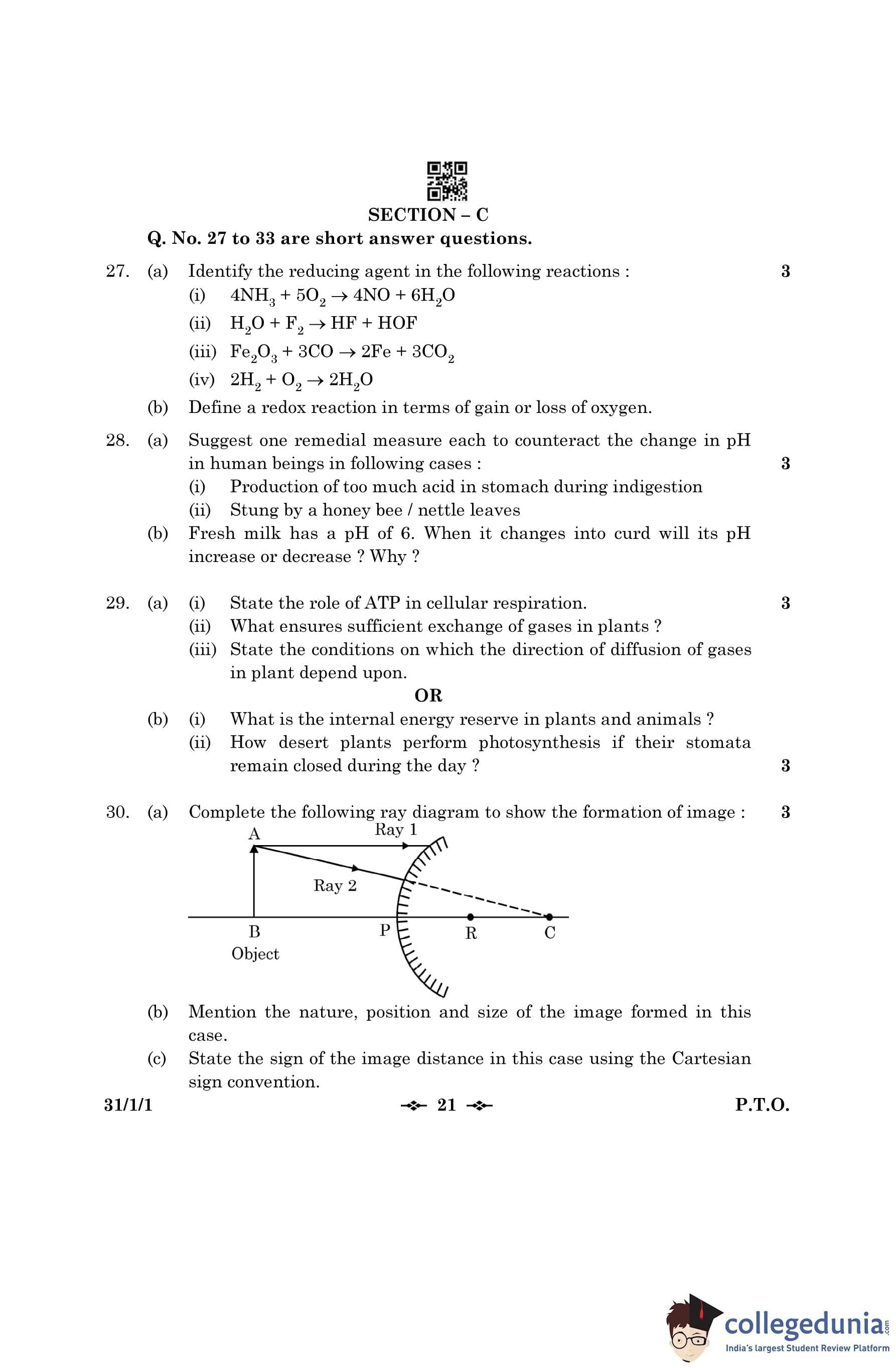 CBSE Class 10 Science (Set 1- 31/1/1) Question Paper 2023 with Answer Key