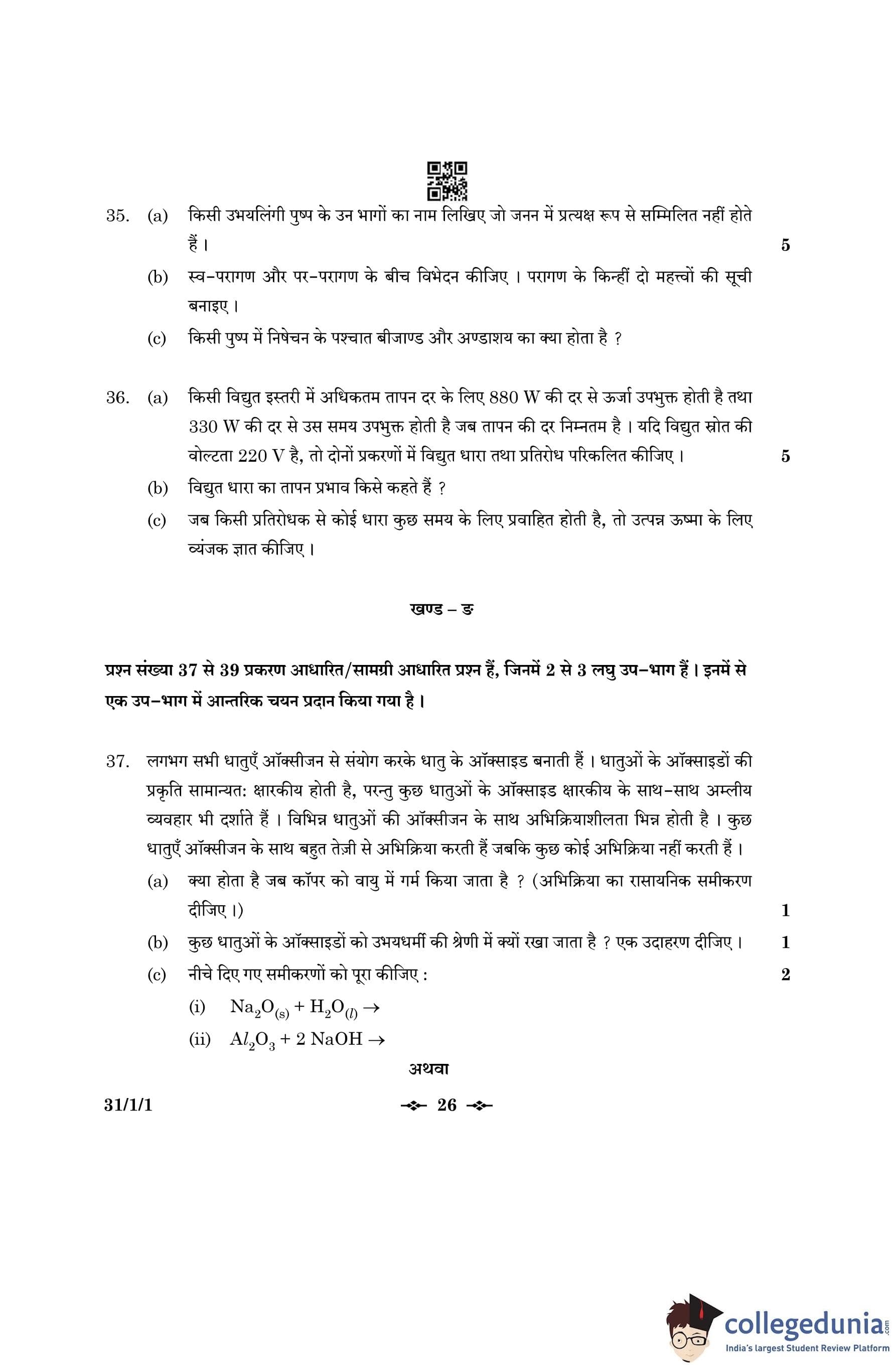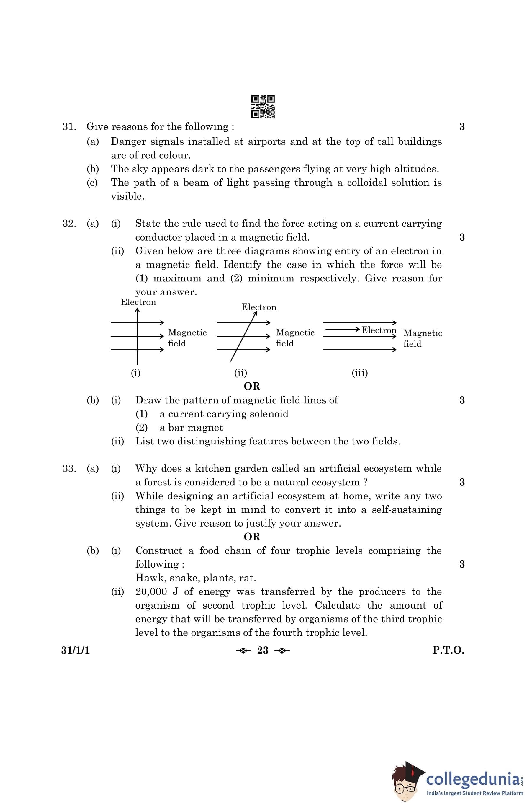 CBSE Class 10 Science Question Paper 2023 with Answer Key (Set 1- 31/1/1) is available for download here. The exam was conducted by the Central Board of Secondary Education on March 4, 2023 in the Morning Session 10:30 AM to 1:30 PM. The medium of paper was English & Hindi. According to initial student reaction, the CBSE Class 12 Science Paper was rated as Moderate in difficulty level. The question paper comprised a total of 39 questions divided among 5 sections.