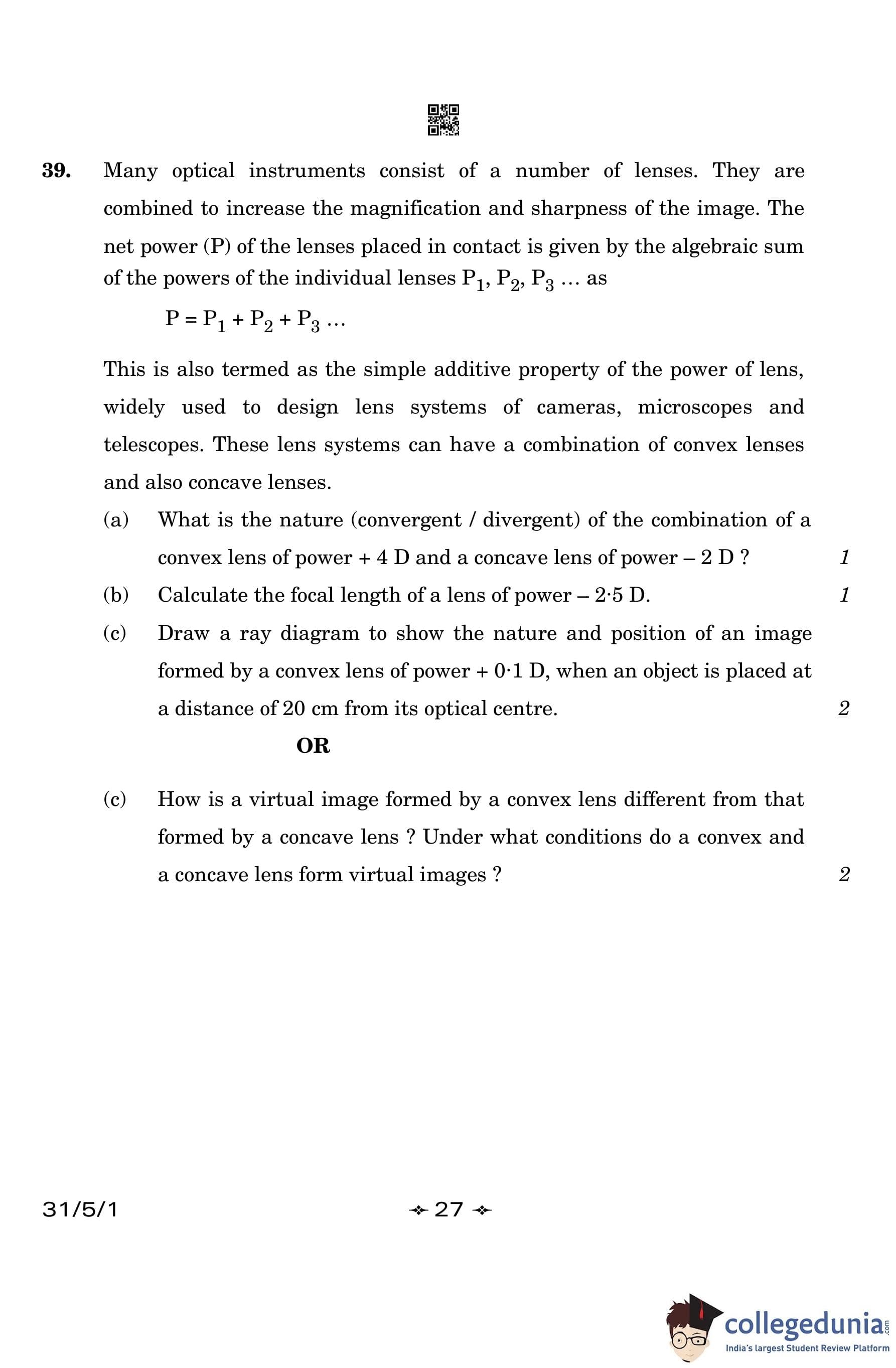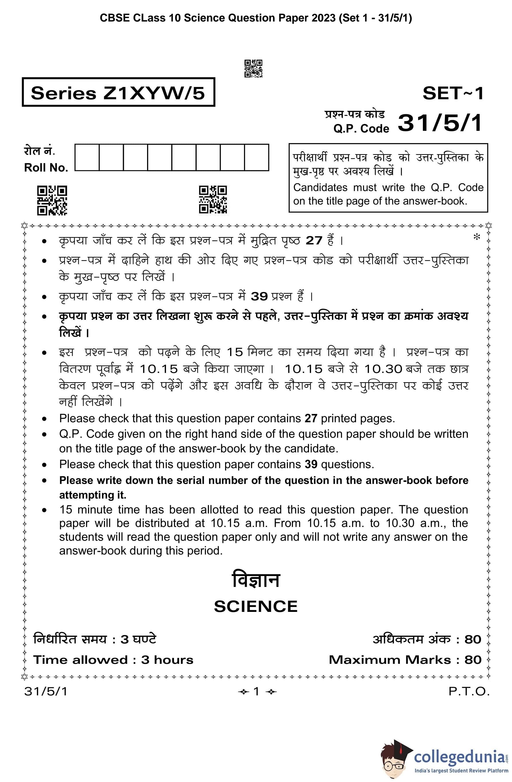 CBSE Class 10 Science Question Paper 2023 with Answer Key (Set 1- 31/5/1) is available for download here. The exam was conducted by the Central Board of Secondary Education on March 4, 2023 in the Morning Session 10:30 AM to 1:30 PM. The medium of paper was English & Hindi. According to initial student reaction, the CBSE Class 12 Science Paper was rated as Moderate in difficulty level. The question paper comprised a total of 39 questions divided among 5 sections.