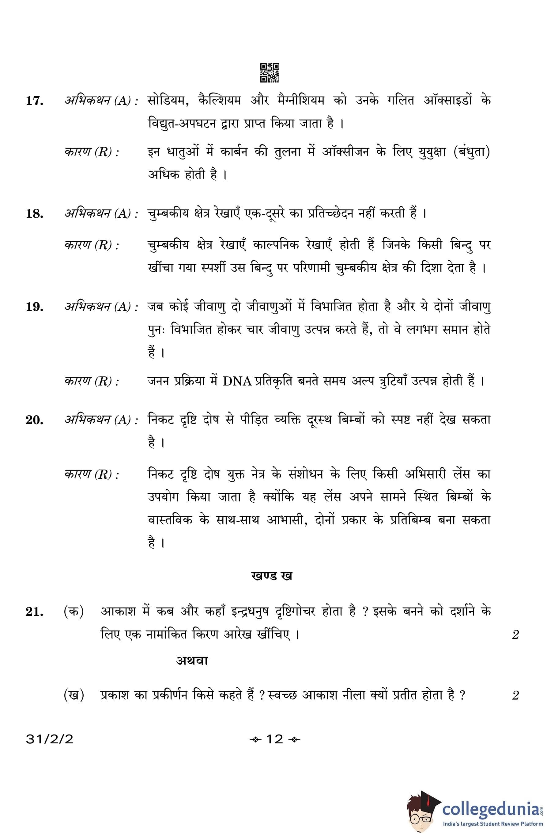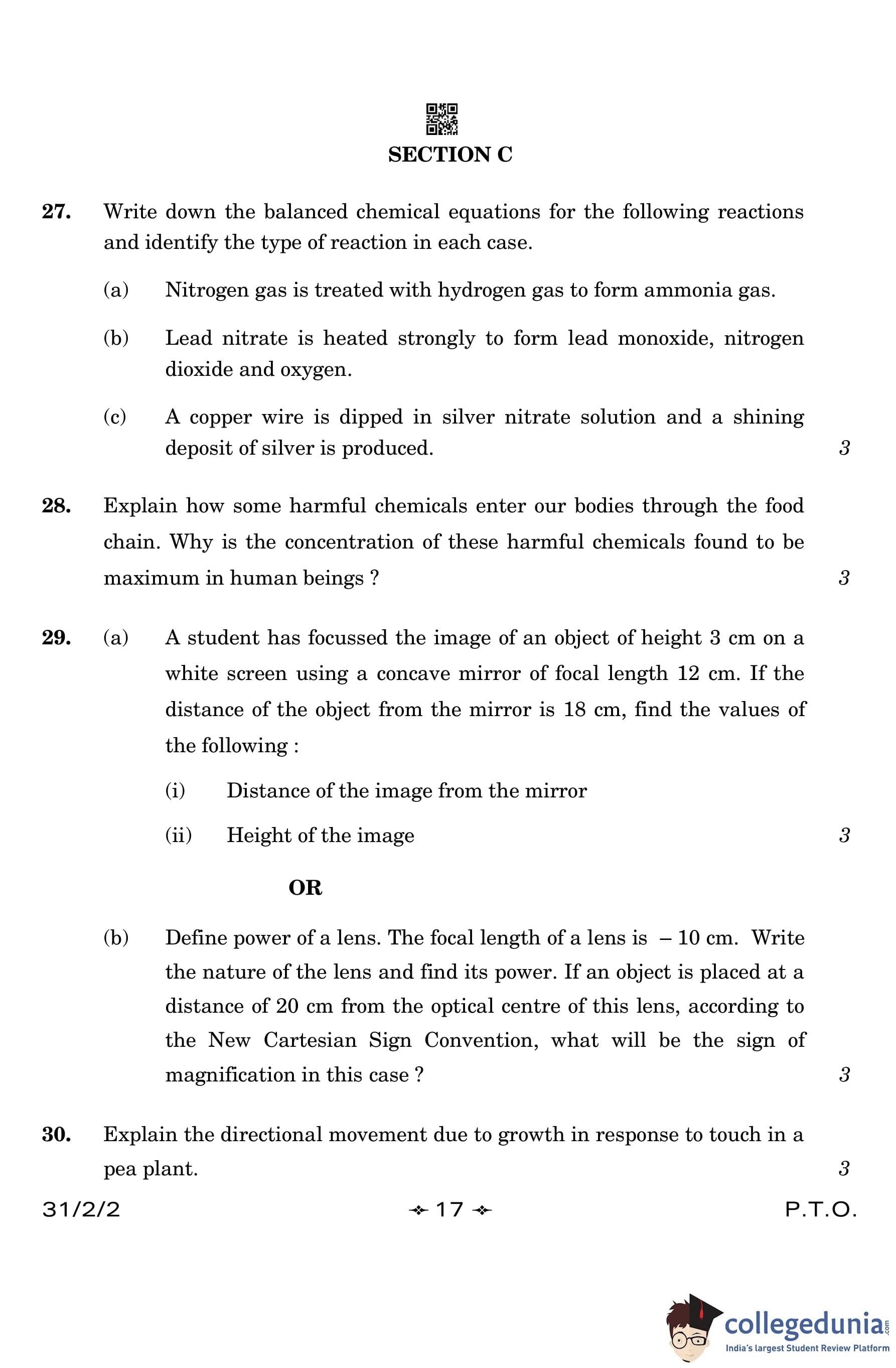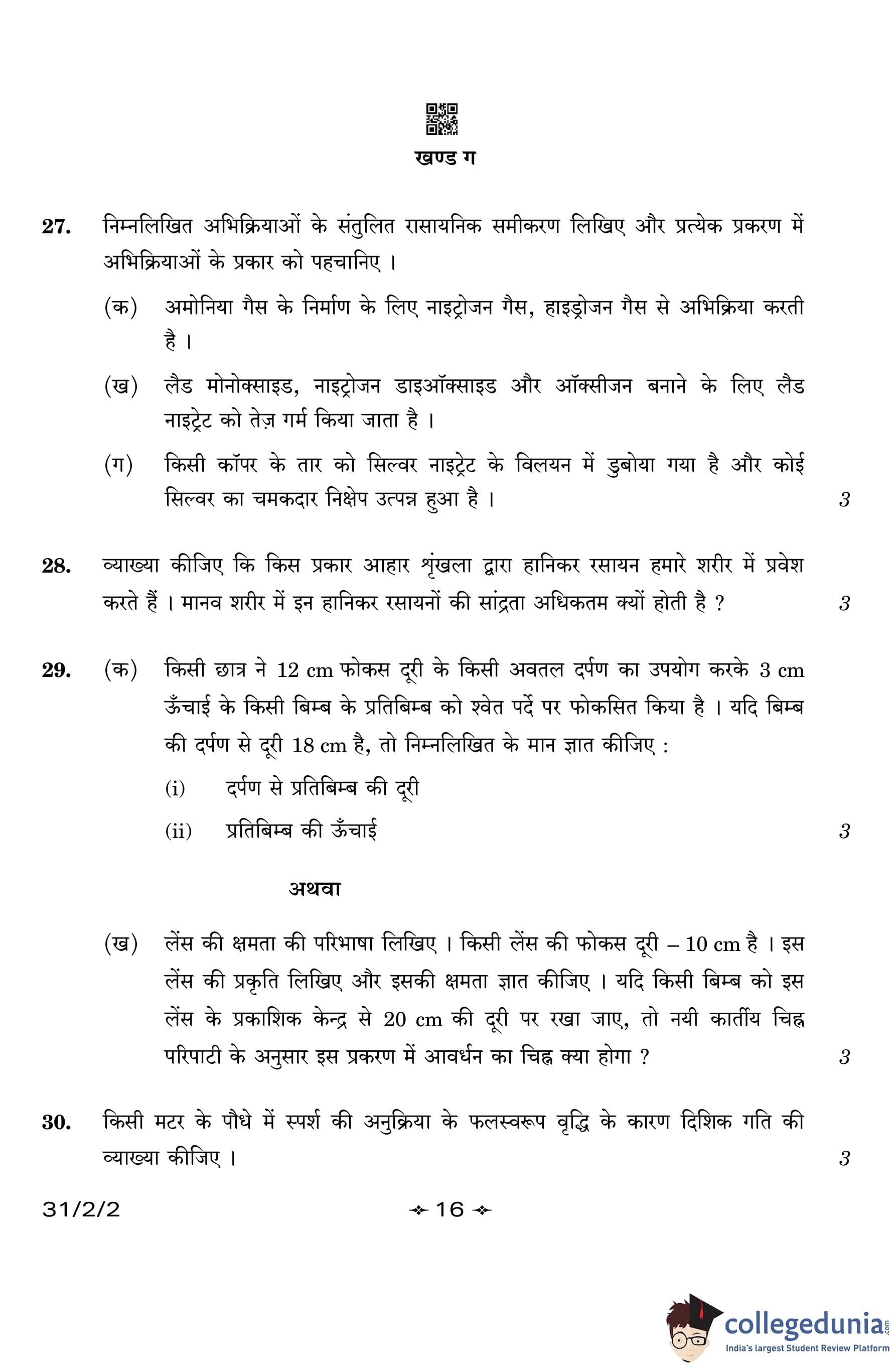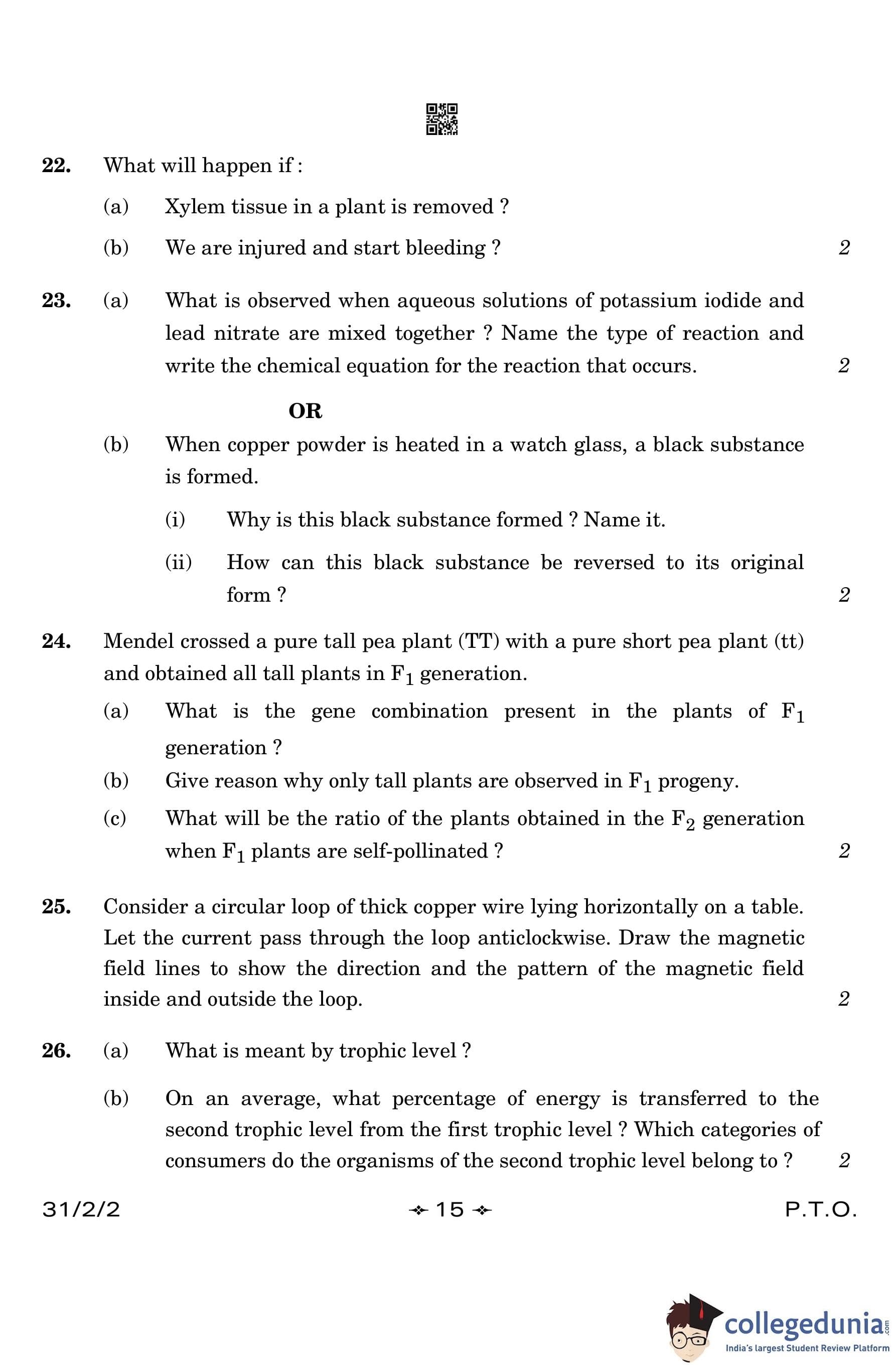 CBSE Class 10 Science Question Paper 2023 with Answer Key (Set 2- 31/2/2) is available for download here. The exam was conducted by the Central Board of Secondary Education on March 4, 2023 in the Morning Session 10:30 AM to 1:30 PM. The medium of paper was English & Hindi. According to initial student reaction, the CBSE Class 12 Science Paper was rated as Moderate in difficulty level. The question paper comprised a total of 39 questions divided among 5 sections.