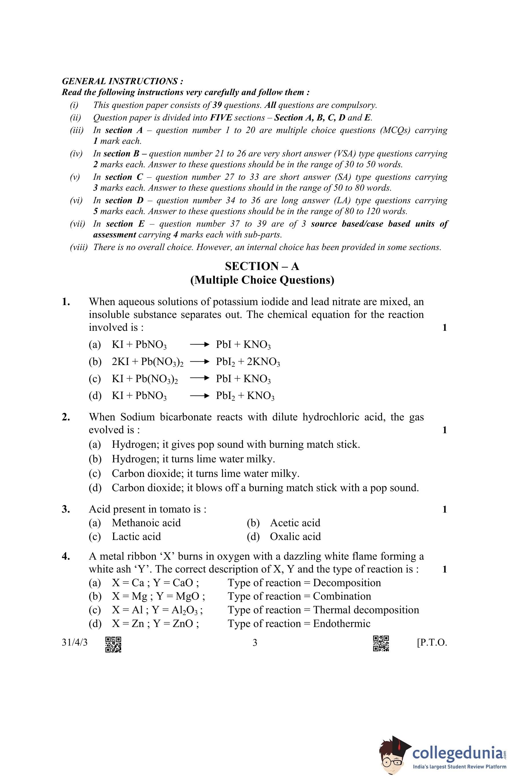 CBSE Class 10 Science Question Paper 2023 with Answer Key (Set 3- 31/4/3) is available for download here. The exam was conducted by the Central Board of Secondary Education on March 4, 2023 in the Morning Session 10:30 AM to 1:30 PM. The medium of paper was English & Hindi. According to initial student reaction, the CBSE Class 12 Science Paper was rated as Moderate in difficulty level. The question paper comprised a total of 39 questions divided among 5 sections.