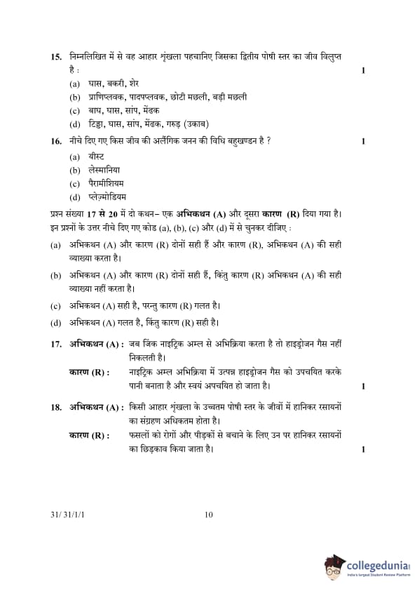 | 18. Assertion (A): Accumulation of harmful chemicals is maximum in the organisms at the highest trophic level of a food chain. Reason (R): Harmful chemicals are sprayed on the crops to protect them from diseases and pests. The correct explanation is: (A) Both Assertion (A) and Reason (R) are true and Reason (R) is the correct explanation of Assertion (A). (B) Both Assertion (A) and Reason (R) are true, but Reason (R) is not the correct explanation of Assertion (A). (C) Assertion (A) is true, but Reason (R) is false. (D) Assertion (A) is false, but Reason (R) is true. |