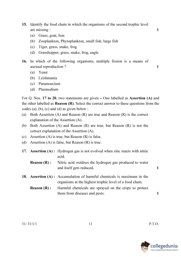 | 15. Identify the food chain in which the organisms of the second trophic level are missing: (A) Grass, goat, lion (B) Zooplankton, Phytoplankton, small fish, large fish (C) Tiger, grass, snake, frog (D) Grasshopper, grass, snake, frog, eagle |