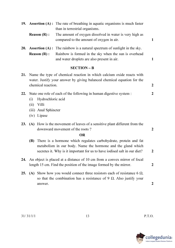| 23(B). There is a hormone which regulates carbohydrate, protein, and fat metabolism in our body. Name the hormone and the gland which secretes it. Why is it important for us to have iodised salt in our diet? | (B) Thyroxine; Thyroid gland | The hormone is Thyroxine, which is secreted by the thyroid gland. Iodine is important in our diet because it is essential for the synthesis of thyroxine. A deficiency in iodine leads to goitre, which is the swelling of the thyroid gland. | ||||||||||||||||
