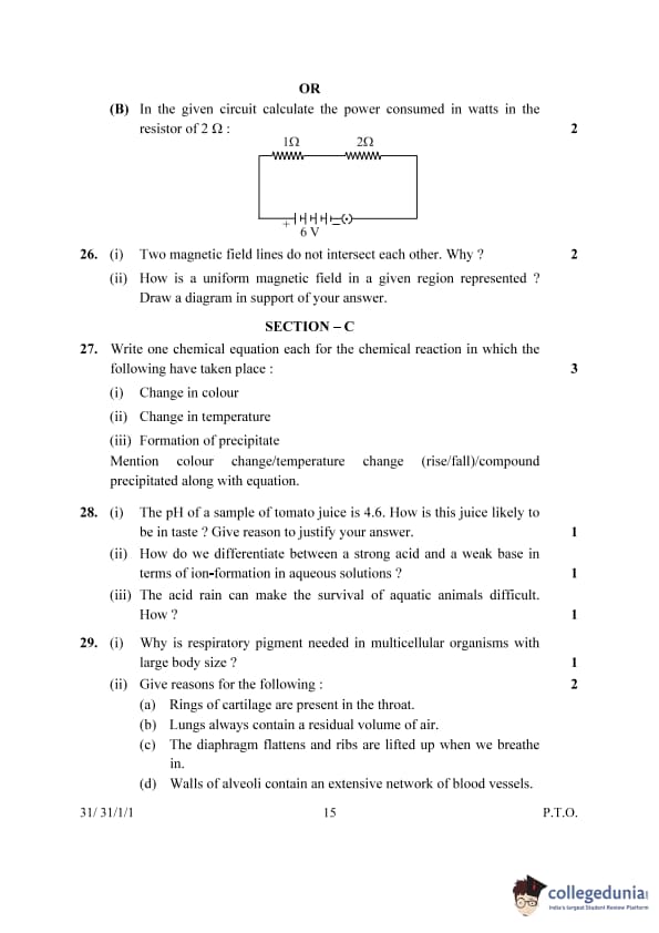 | 26.(i) Two magnetic field lines do not intersect each other. Why? | Because magnetic field lines never intersect as it would imply two different directions of the magnetic field at the intersection point, which is impossible. | Magnetic field lines never intersect because at the point of intersection, the magnetic field would have two different directions, which is not possible. | ||||||||||||||||