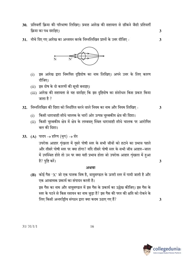 | 31.(ii) List two causes of Hypermetropia (Far-sightedness). | The focal length of the eye lens is too long. The eyeball has become too small, causing the image to form behind the retina. |