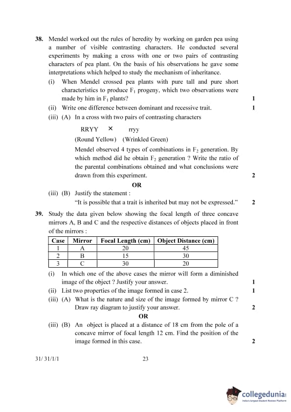 | 38. Mendel worked out the rules of heredity by working on garden pea using a number of visible contrasting characters. He conducted several experiments by making a cross with one or two pairs of contrasting characters of pea plant. On the basis of his observations he gave some interpretations which helped to study the mechanism of inheritance. (i) When Mendel crossed pea plants with pure tall and pure short characteristics to produce F1 progeny, which two observations were made by him in F1 plants? (ii) Write one difference between dominant and recessive trait. (iii) (A) In a cross with two pairs of contrasting characters. RRYY (Round Yellow) × rryy (Wrinkled Green) Mendel observed 4 types of combinations in F2 generation. By which method did he obtain F2 generation? Write the ratio of the parental combinations obtained and what conclusions were drawn from this experiment. |