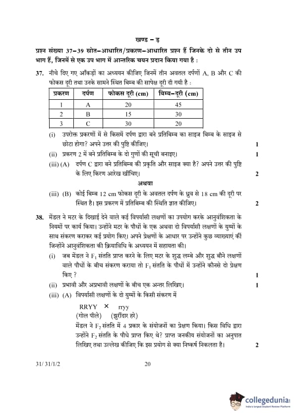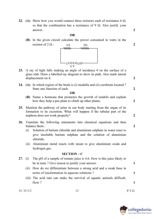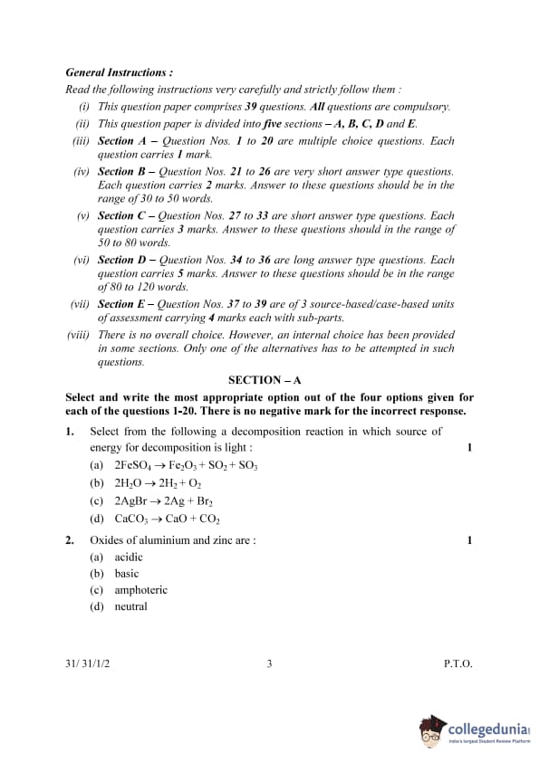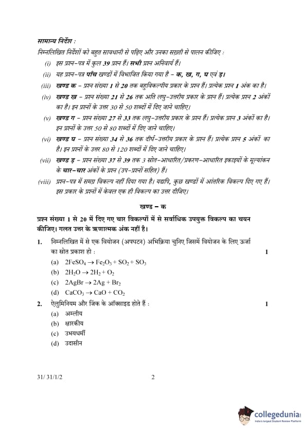 CBSE Class 10 Science Question Paper 2024 PDF (Set 2 - 31/1/2) is available for download here. CBSE conducted the Science exam on March 2, 2024, from 10:30 AM to 1:30 PM. The total marks for the theory paper are 80. The question paper contains 20% MCQ-based questions, 40% competency-based questions, and 40% short and long answer type questions.