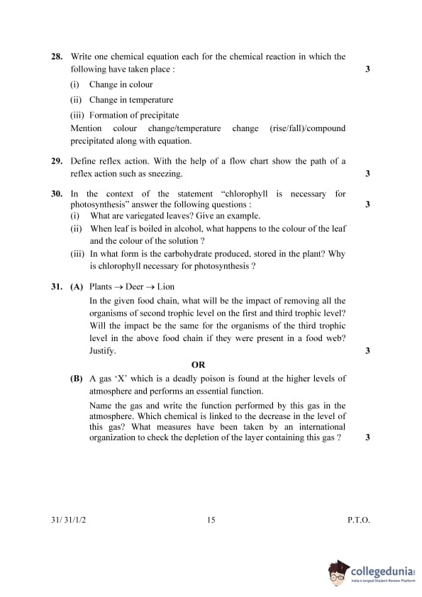 | 28. Write one chemical equation each for the chemical reaction in which the following have taken place: (i) Change in colour: (ii) Change in temperature: (iii) Formation of precipitate: |