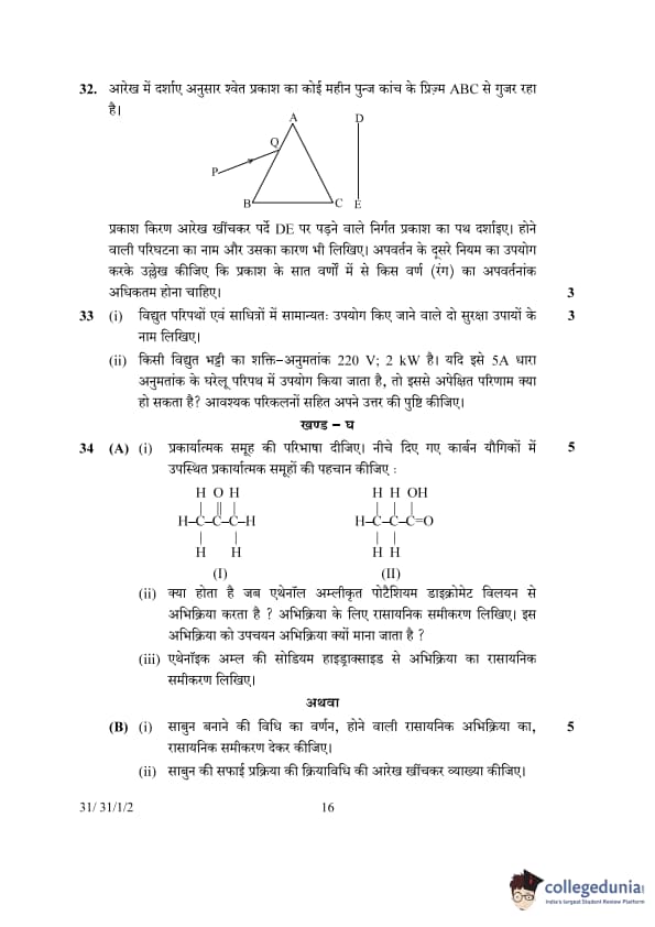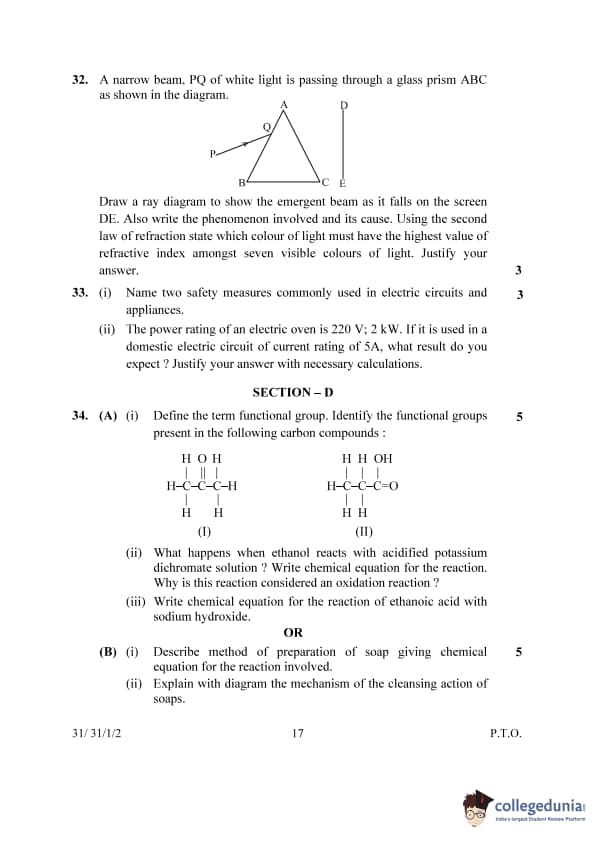 | 34. (A) (i) Define the term functional group. Identify the functional groups present in the following carbon compounds. (ii) What happens when ethanol reacts with acidified potassium dichromate solution? Write a chemical equation for the reaction. Why is this reaction considered an oxidation reaction? (iii) Write the chemical equation for the reaction of ethanoic acid with sodium hydroxide. |