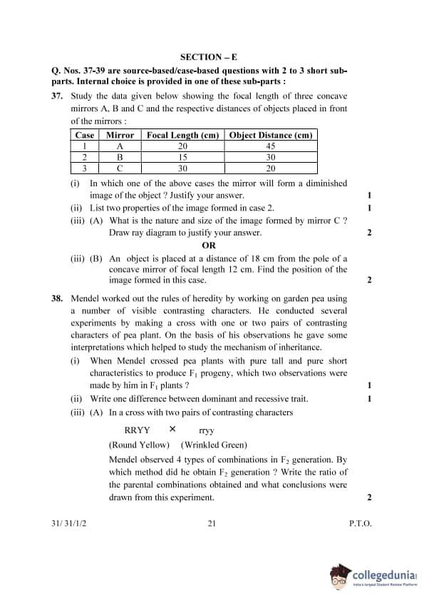 | 38. Mendel worked out the rules of heredity by working on garden pea using a number of visible contrasting characters. He conducted several experiments by making a cross with one or two pairs of contrasting characters of pea plant. On the basis of his observations he gave some interpretations which helped to study the mechanism of inheritance. (i) When Mendel crossed pea plants with pure tall and pure short characteristics to produce F1 progeny, which two observations were made by him in F1 plants? (ii) Write one difference between dominant and recessive trait. (iii) (A) In a cross with two pairs of contrasting characters. RRYY (Round Yellow) × rryy (Wrinkled Green) Mendel observed 4 types of combinations in F2 generation. By which method did he obtain F2 generation? Write the ratio of the parental combinations obtained and what conclusions were drawn from this experiment. |
